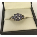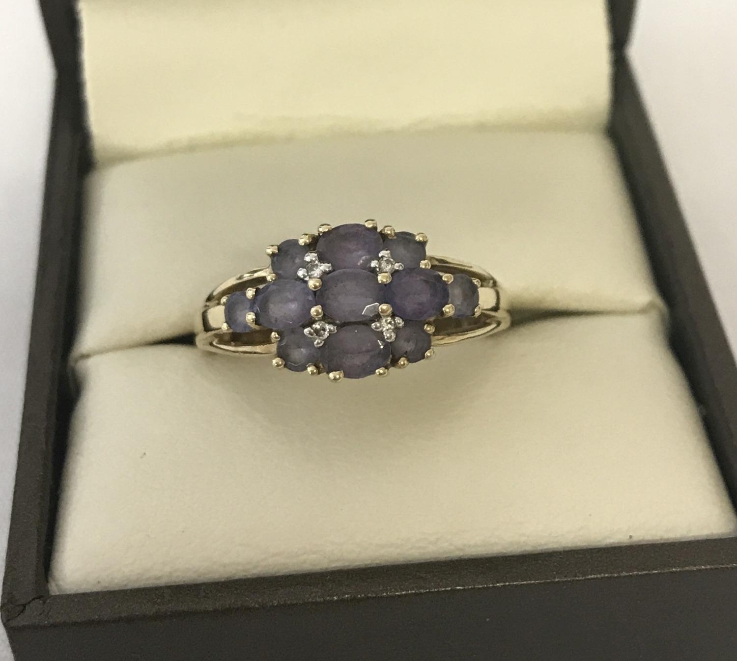 A 9ct gold and amethyst and diamond dress ring. Set with 5 oval cut and six round cut amethysts with 4 round cut small diamonds. Ring size O½. Total weight approx. 2.4g