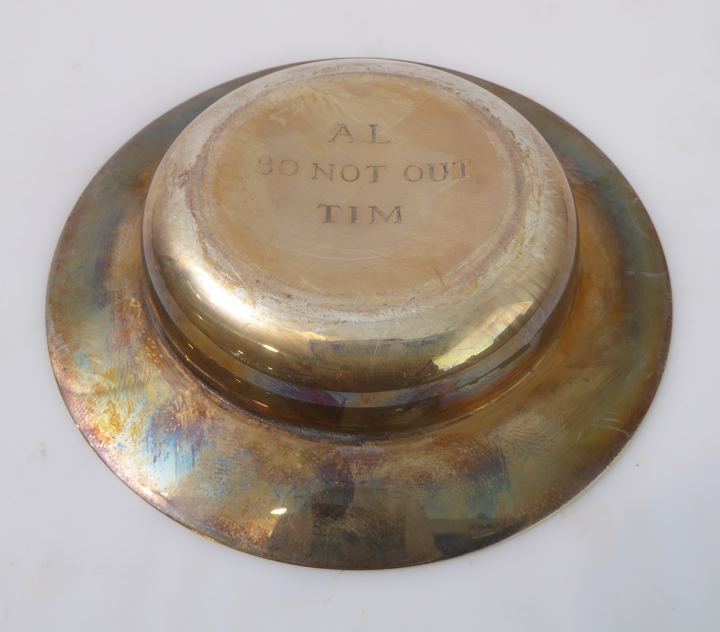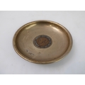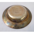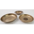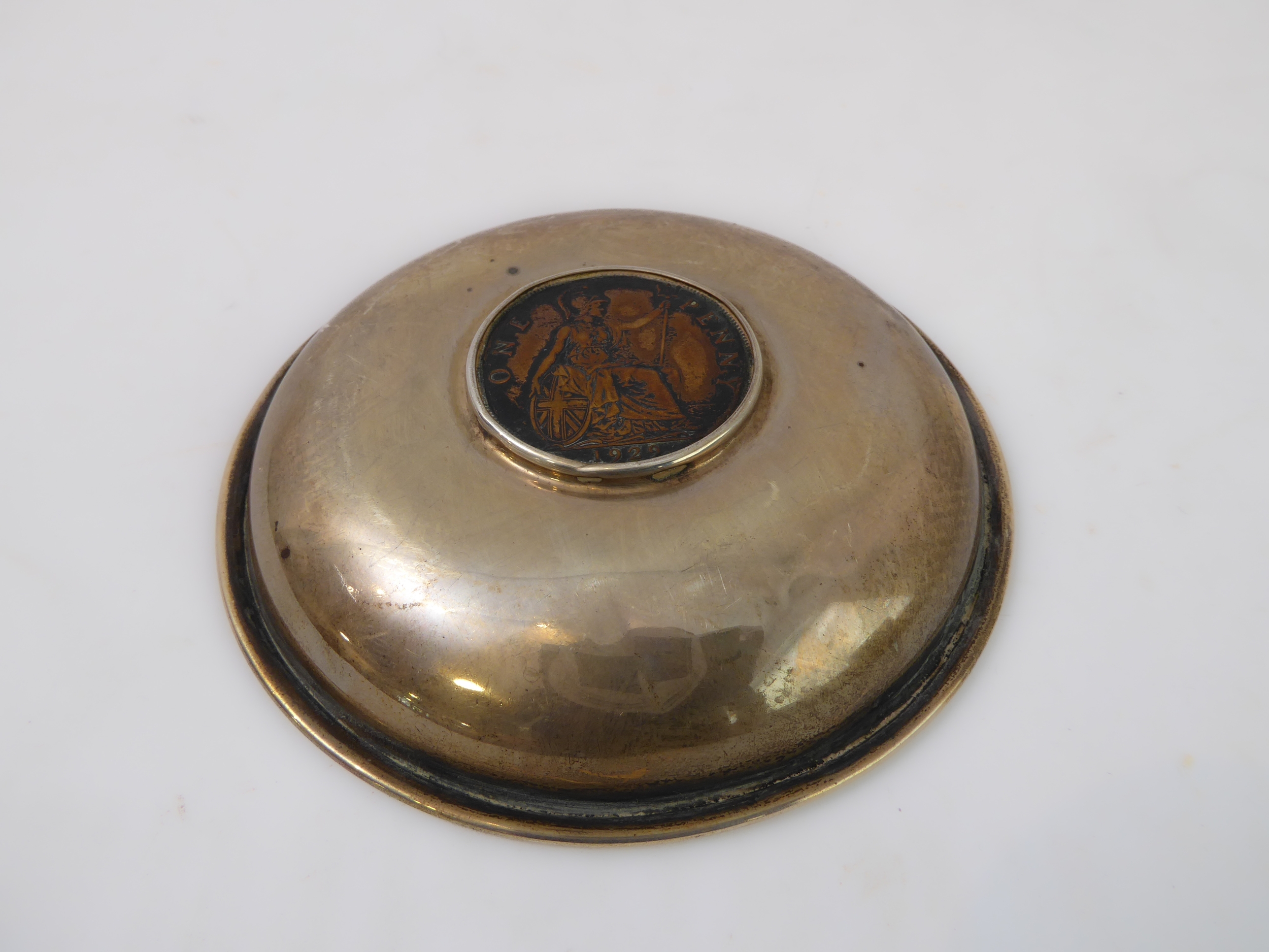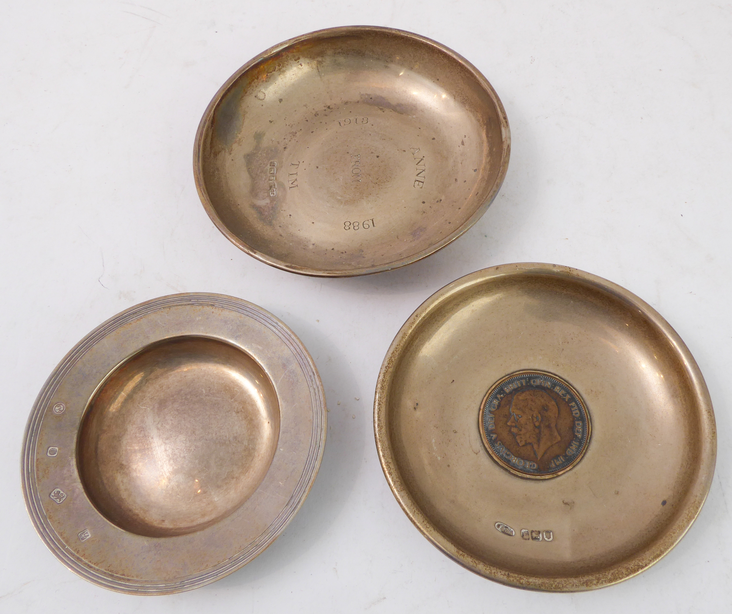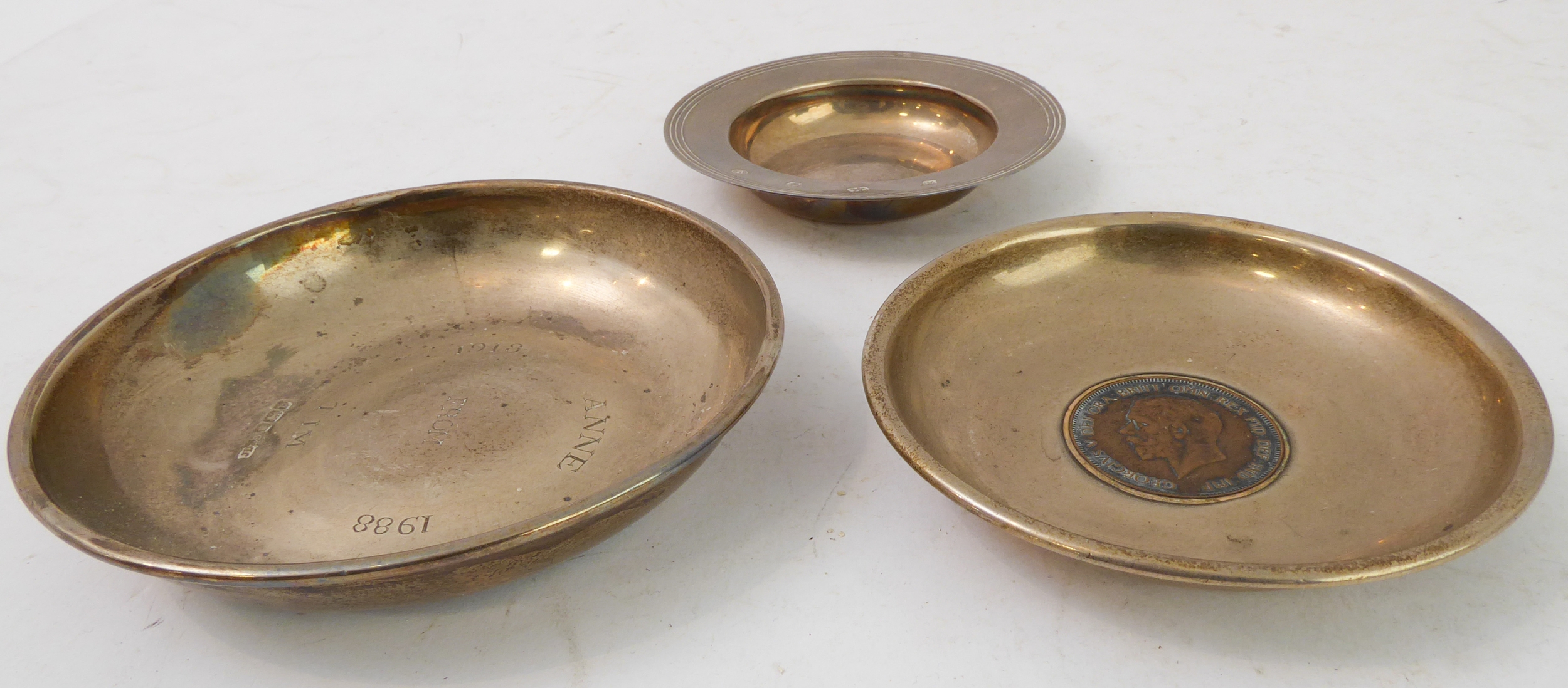 An early 20th century hallmarked-silver engraved presentation bowl (10.5cm), one other hallmarked-silver dish inset centrally with a penny dated 1929 and one further similar sized modern hallmarked-silver armada-style dish (total weight including penny approx.125.5g) (3)