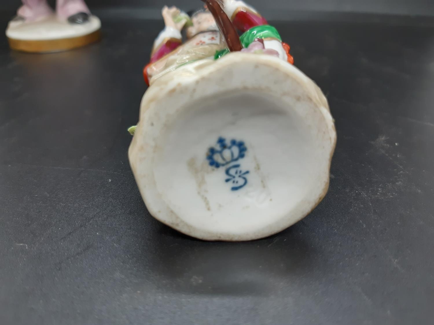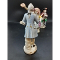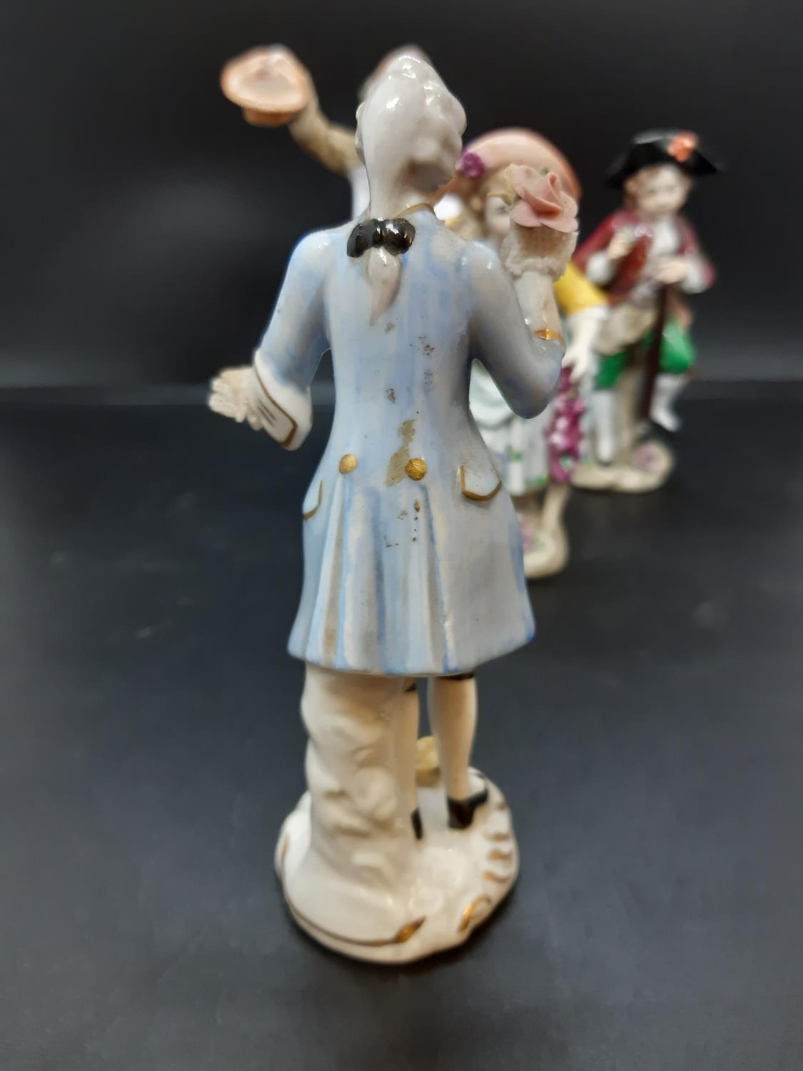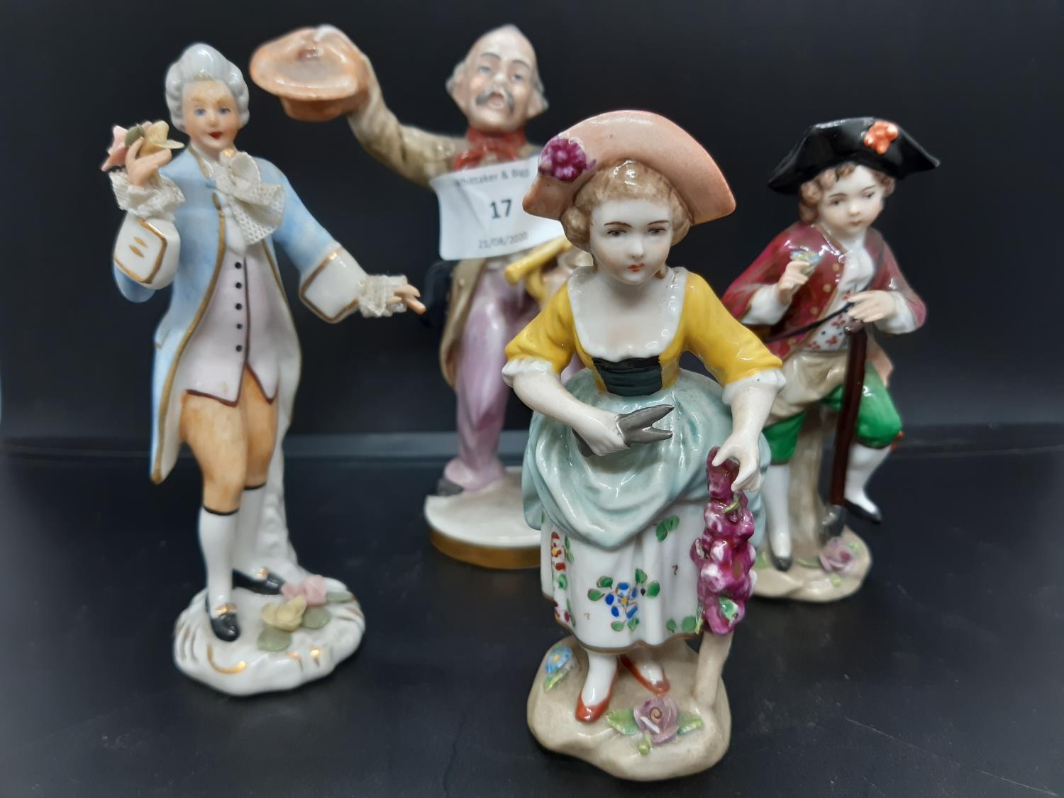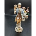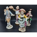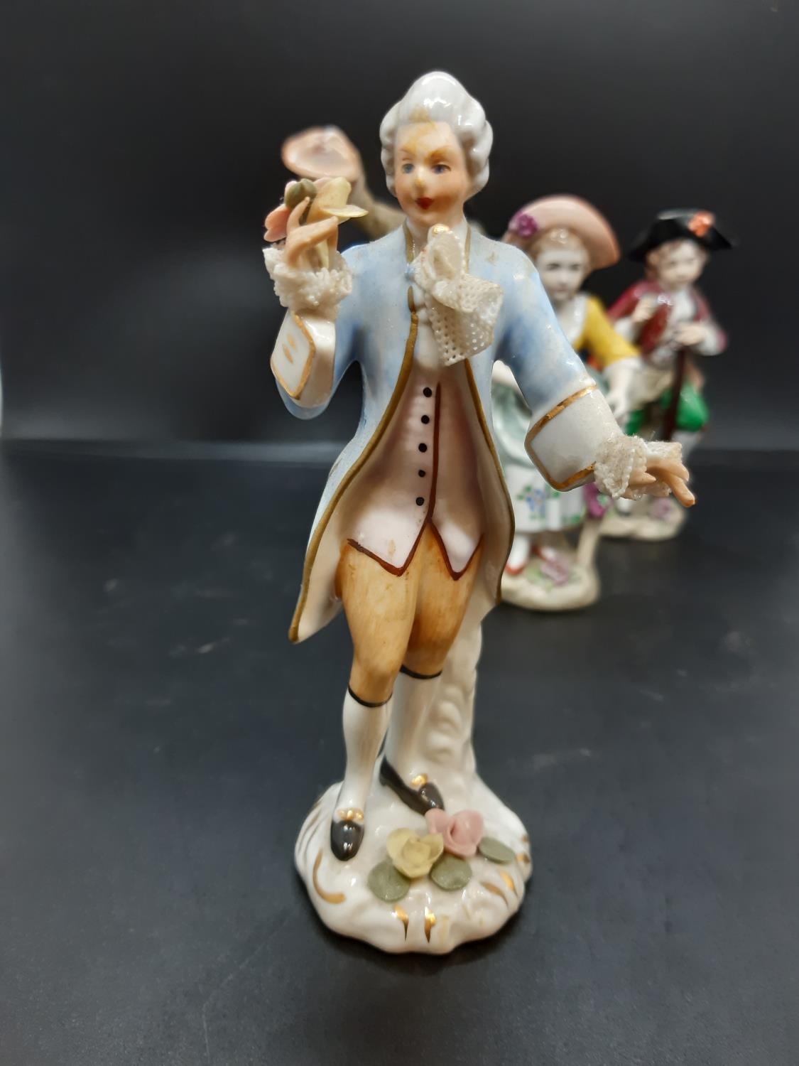 A group of four continental porcelain figurines to include Sandizell Hoffner & Co 1950's Rococo style man holding roses, pair of Sitzendorf young boy and girl gardening figurines etc.