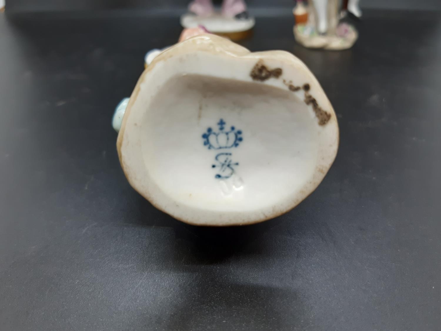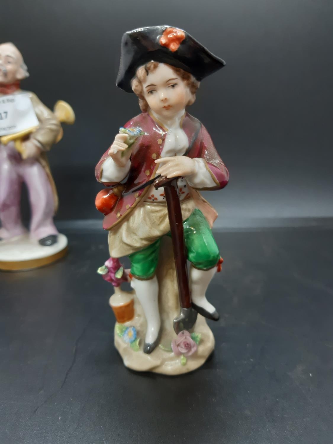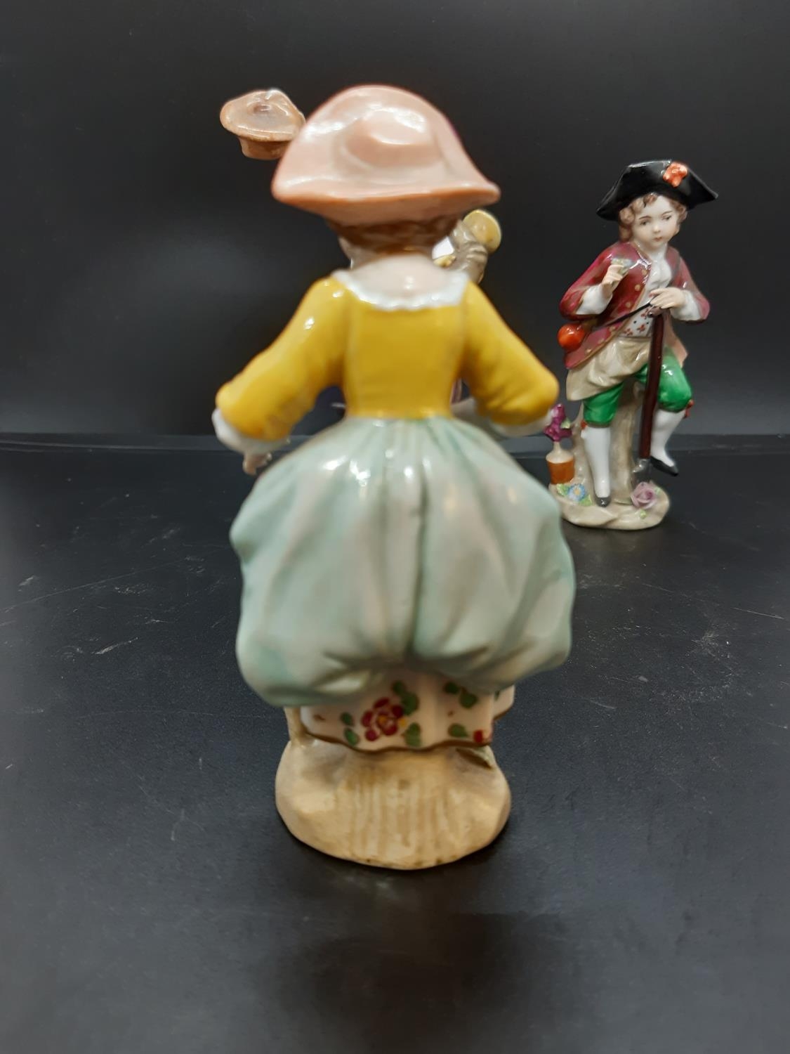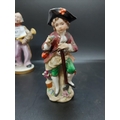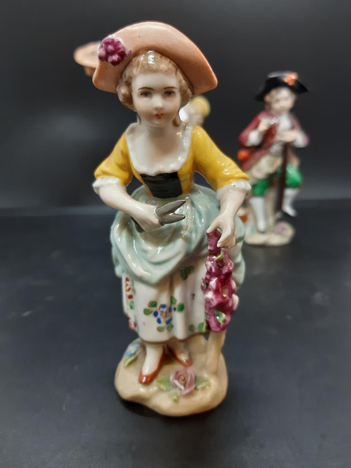 A group of four continental porcelain figurines to include Sandizell Hoffner & Co 1950's Rococo style man holding roses, pair of Sitzendorf young boy and girl gardening figurines etc.