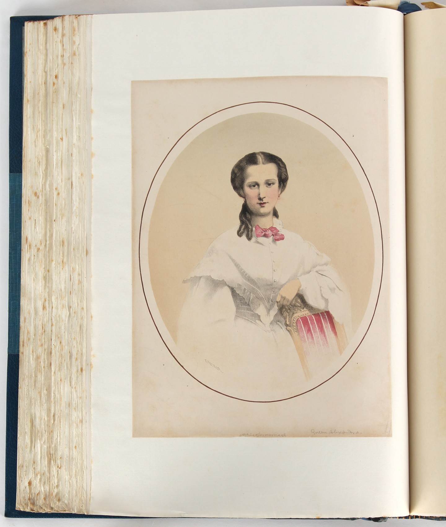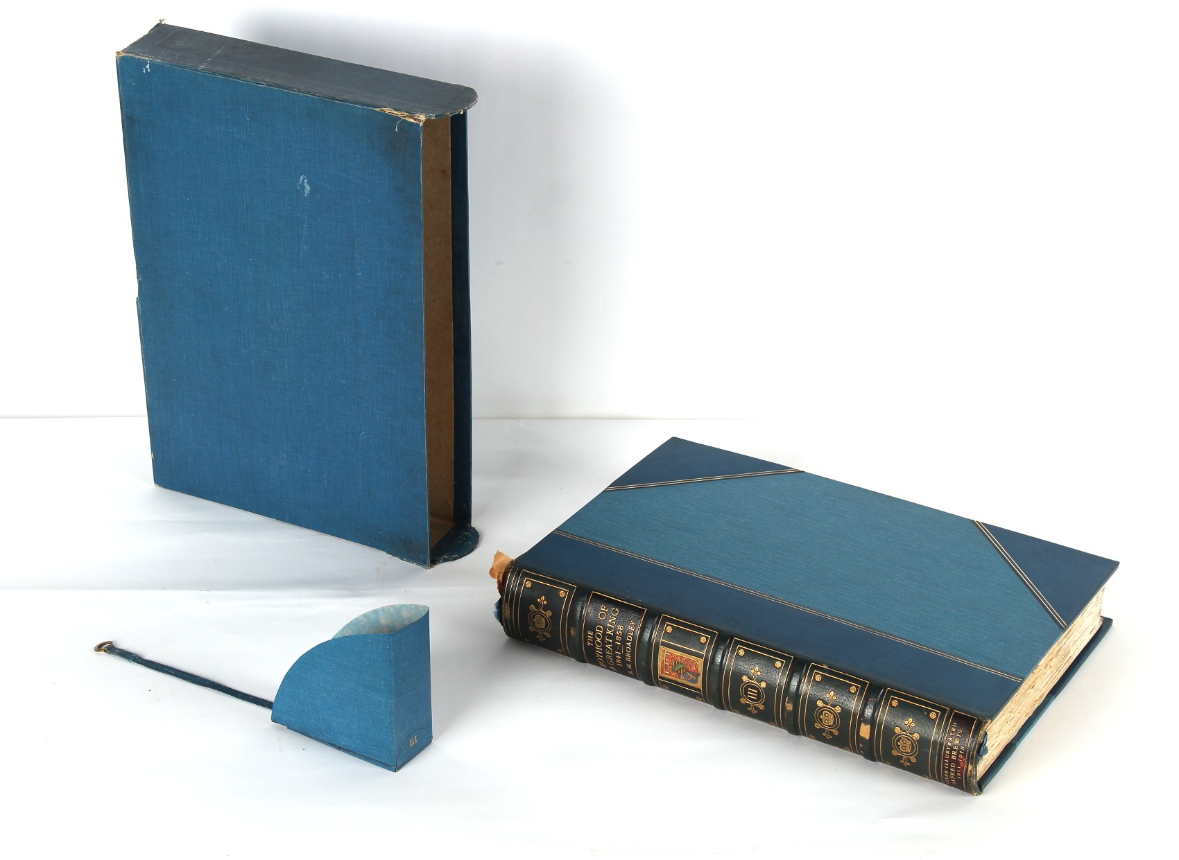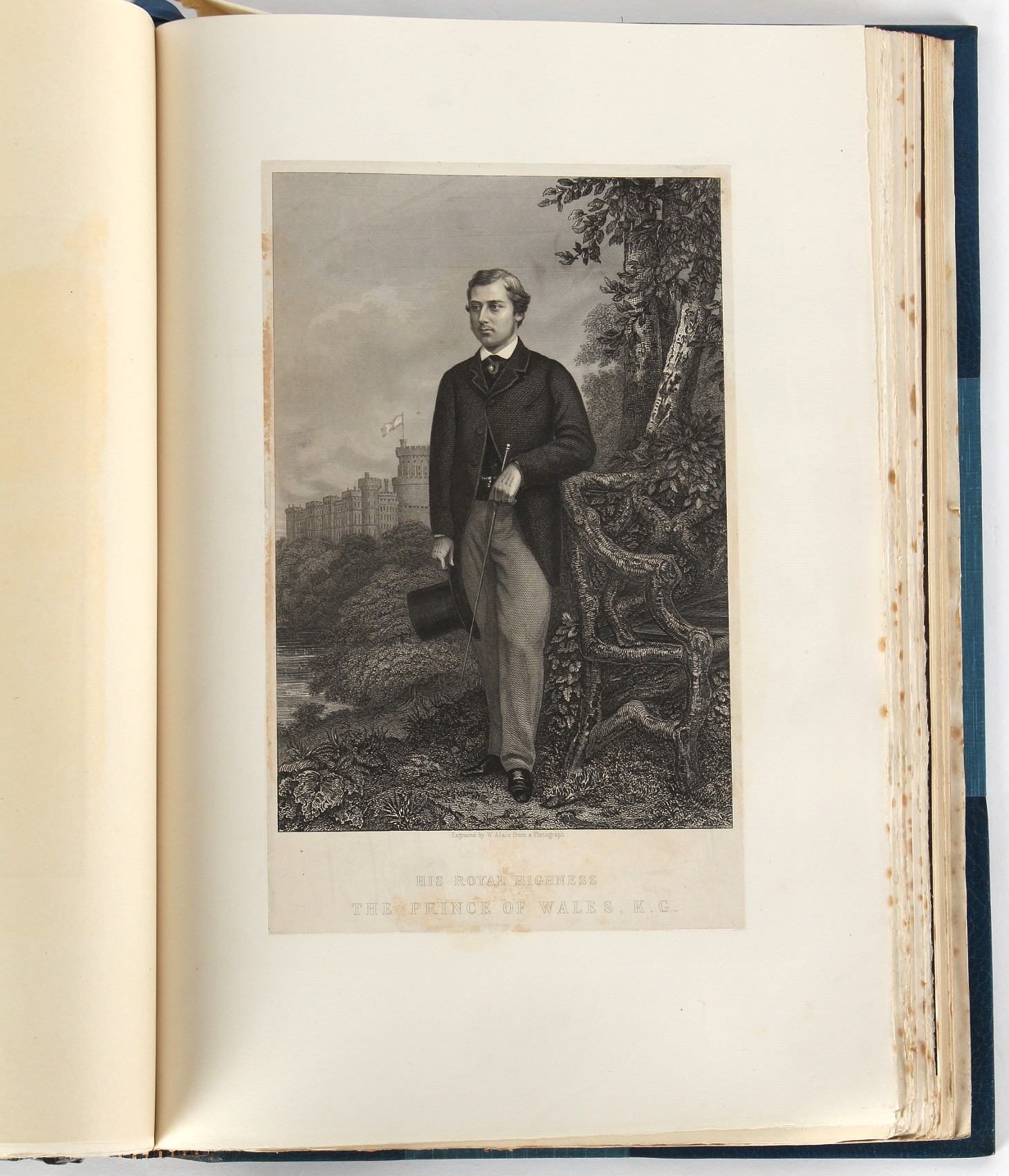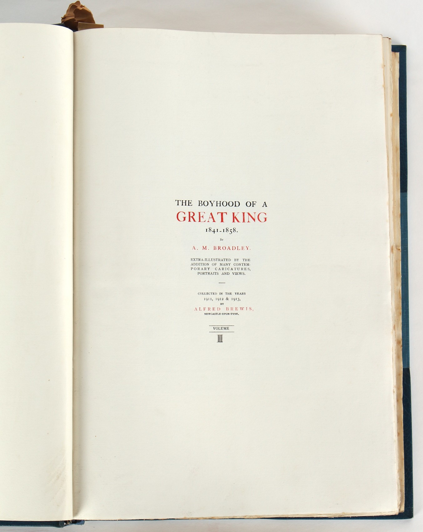 Property of a lady - BROADLEY, Alexander Meyrick - 'The Boyhood of a Great King 1851-1858, Extra-Illustrated by the Addition of Many Contemporary Caricatures, Portraits and Views. Collected in the Years 1911, 1912 & 1913, by Alfred Brewis, Newcastle-Upon-Tyne' - a 'Grangerized' or 'Grangerised' folio volume, finely bound by Cedric Chivers of Bath, 19.5 by 14.2ins. (49.5 by 36cms.) (overall, excluding blue cloth slipcase), a lavish collection of contemporary caricatures, views and portraits relating to the early years of Kind Edward VII including 23 colour plates from the book 'A Memorial of the Marriage of H.R.H. Albert Edward Prince of Wales and H.R.H. Alexandra Princess of Denmark', by Robert Charles Dudley, published in 1864 , also many contemporary albumen print photographs of British and European Royalty, Vanity Fair Spy cartoons, etc.. Footnote - Alexander Meyrick Broadley (1847-1916) was a British author, barrister, collector and social figure, known for defending Ahmed 'Urabi after the Urabi Revolt. Broadley penned numerous historical works later in life, particularly regarding Napoleon and his era. Among the works he authored or co-authored are 'Napoleon and the Invasion of England: The Story of the Great Terror' (London, 1908); 'Nelson’s Hardy: His Life, Letters and Friends' (London, 1909); 'Dumouriez and the Defence of England against Napoleon' (London, 1909); 'Napoleon in Caricature 1795-1821' (London, 1911); and 'Napoleon in Exile' (London, 1914). Broadley was known as a celebrated grangeriser (or extra-illustrator) of books, and one of his greatest achievements was the creation, with the assistance of Daniell, of an extra-illustrated set of Rose’s 'Life of Napoleon I' and Rosebery’s 'Napoleon. The Last Phase', by inlaying and extending the works from three octavo to twenty-eight folio volumes with engravings, portraits, manuscripts, autograph letters, etc. over a period of four years. This monumental work was bought by George Nathaniel Curzon, Marquess Curzon of Kedleston at the auction of Broadley’s library held in four sales between 1916 and 1918, and Curzon later bequeathed the set to the Bodleian Library, Oxford. Footnote Two - Alfred Brewis was a shipowner in Newcastle-upon-Tyne.