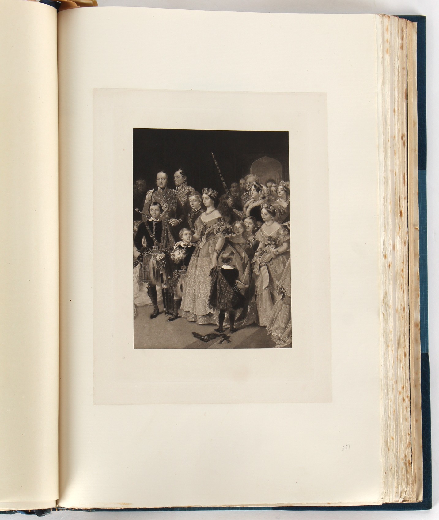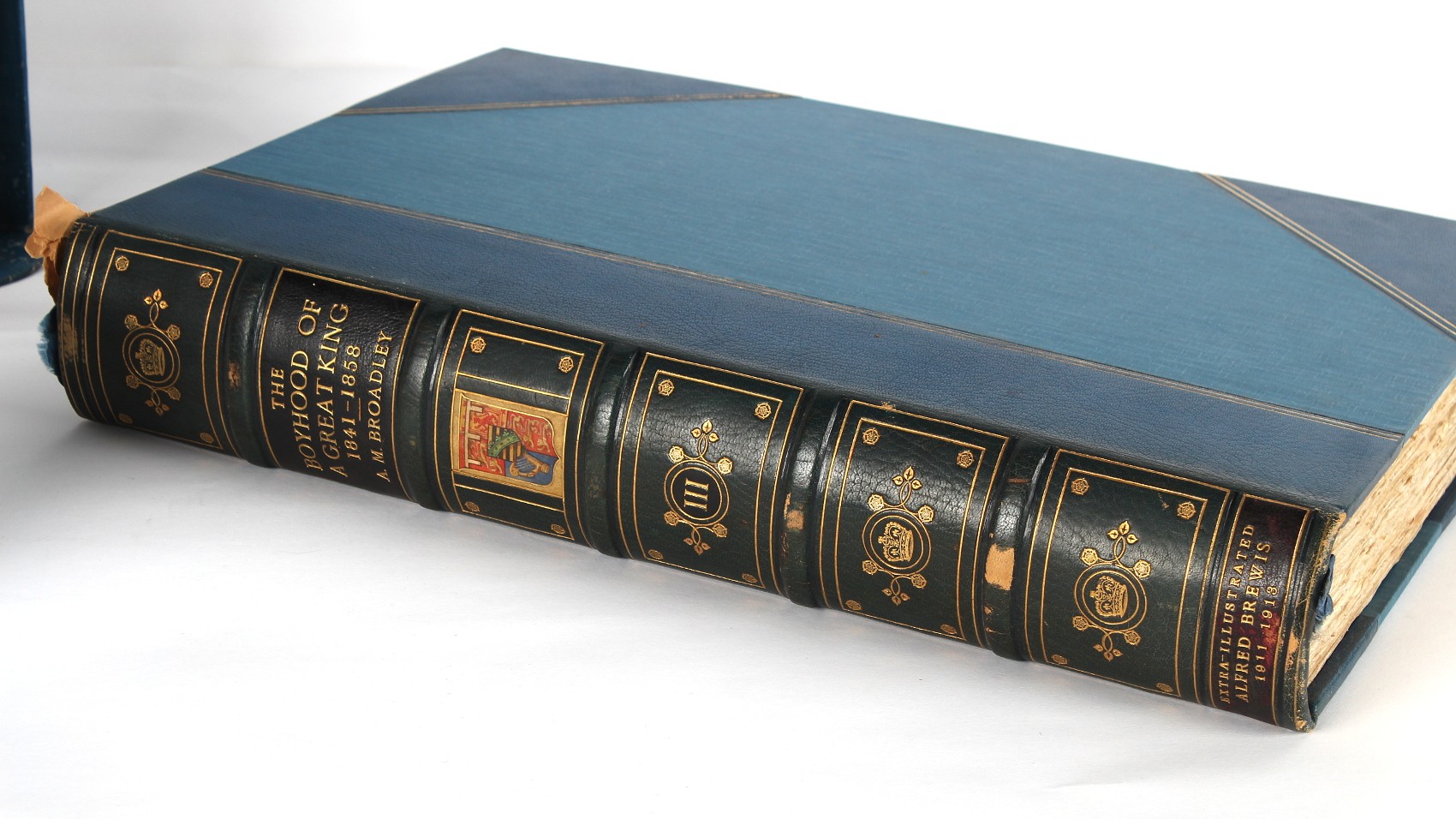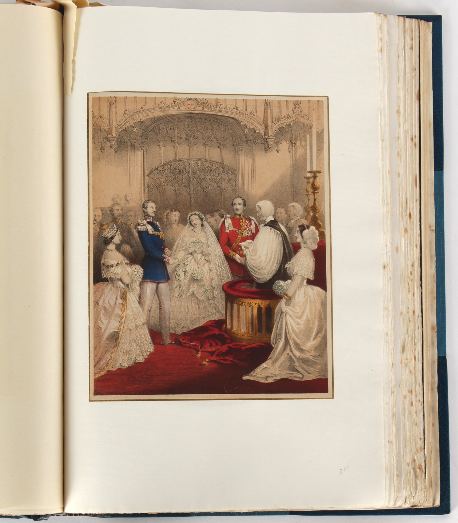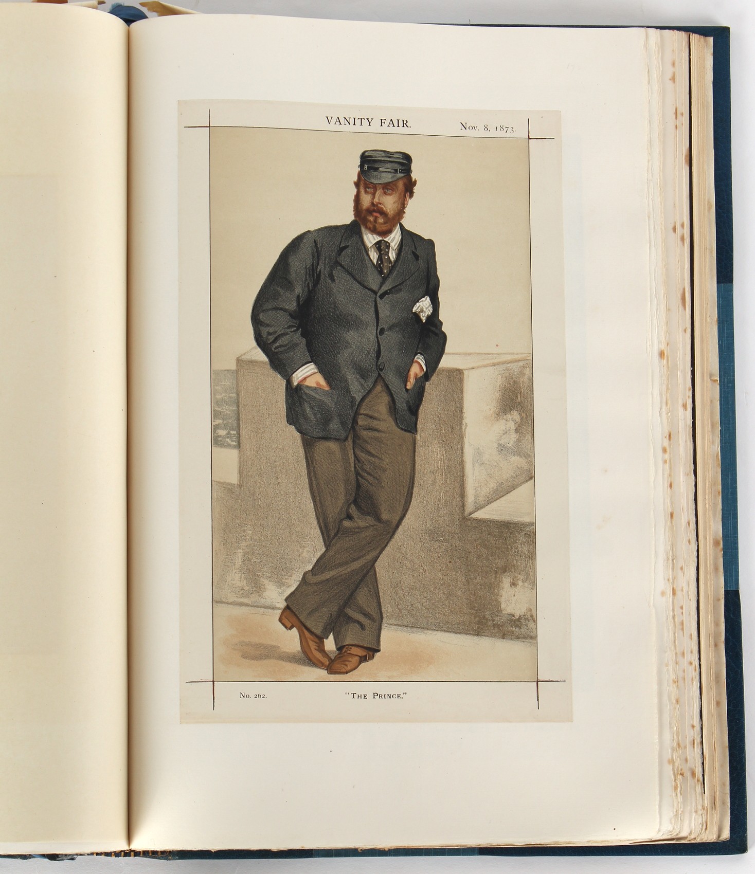 Property of a lady - BROADLEY, Alexander Meyrick - 'The Boyhood of a Great King 1851-1858, Extra-Illustrated by the Addition of Many Contemporary Caricatures, Portraits and Views. Collected in the Years 1911, 1912 & 1913, by Alfred Brewis, Newcastle-Upon-Tyne' - a 'Grangerized' or 'Grangerised' folio volume, finely bound by Cedric Chivers of Bath, 19.5 by 14.2ins. (49.5 by 36cms.) (overall, excluding blue cloth slipcase), a lavish collection of contemporary caricatures, views and portraits relating to the early years of Kind Edward VII including 23 colour plates from the book 'A Memorial of the Marriage of H.R.H. Albert Edward Prince of Wales and H.R.H. Alexandra Princess of Denmark', by Robert Charles Dudley, published in 1864 , also many contemporary albumen print photographs of British and European Royalty, Vanity Fair Spy cartoons, etc.. Footnote - Alexander Meyrick Broadley (1847-1916) was a British author, barrister, collector and social figure, known for defending Ahmed 'Urabi after the Urabi Revolt. Broadley penned numerous historical works later in life, particularly regarding Napoleon and his era. Among the works he authored or co-authored are 'Napoleon and the Invasion of England: The Story of the Great Terror' (London, 1908); 'Nelson’s Hardy: His Life, Letters and Friends' (London, 1909); 'Dumouriez and the Defence of England against Napoleon' (London, 1909); 'Napoleon in Caricature 1795-1821' (London, 1911); and 'Napoleon in Exile' (London, 1914). Broadley was known as a celebrated grangeriser (or extra-illustrator) of books, and one of his greatest achievements was the creation, with the assistance of Daniell, of an extra-illustrated set of Rose’s 'Life of Napoleon I' and Rosebery’s 'Napoleon. The Last Phase', by inlaying and extending the works from three octavo to twenty-eight folio volumes with engravings, portraits, manuscripts, autograph letters, etc. over a period of four years. This monumental work was bought by George Nathaniel Curzon, Marquess Curzon of Kedleston at the auction of Broadley’s library held in four sales between 1916 and 1918, and Curzon later bequeathed the set to the Bodleian Library, Oxford. Footnote Two - Alfred Brewis was a shipowner in Newcastle-upon-Tyne.