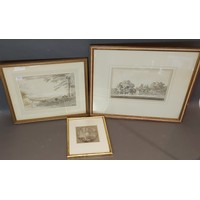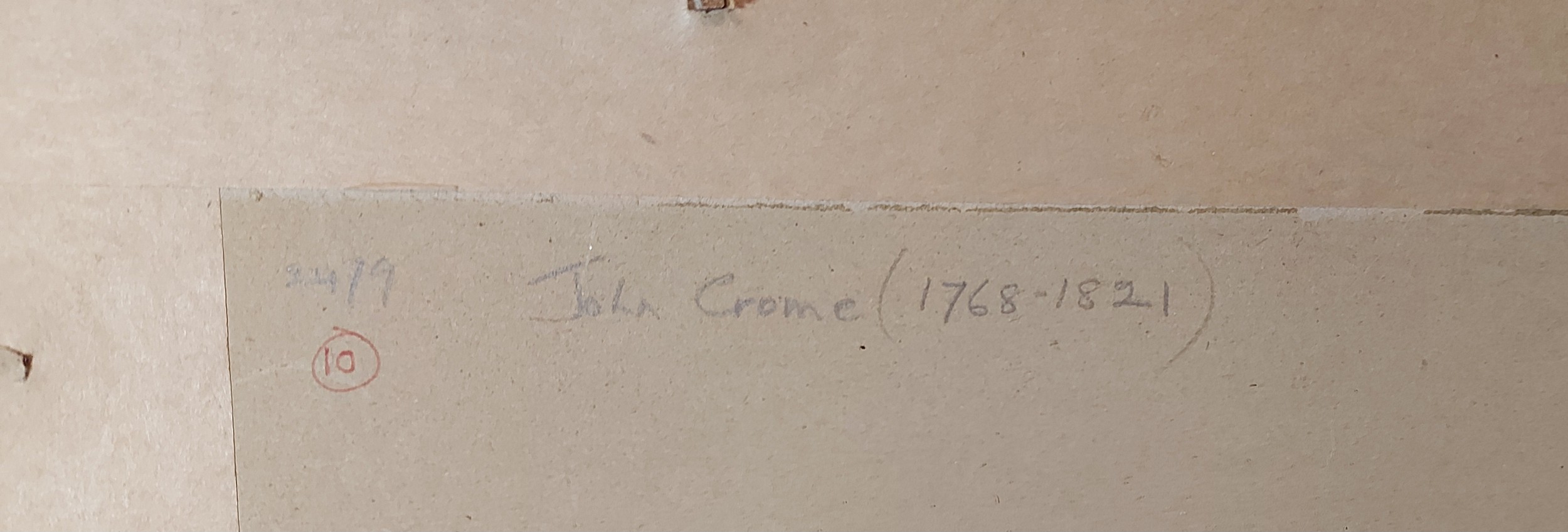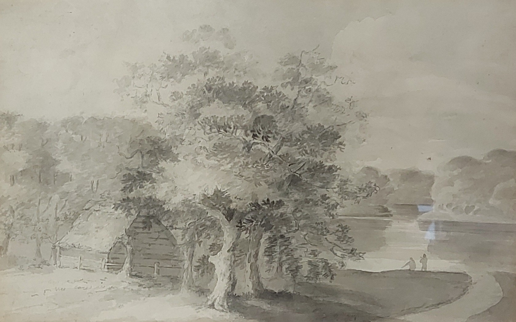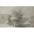 Attributed to John Crome, landscape with figures by a lake, watercolour and pencil, 22cms x 34cms