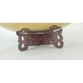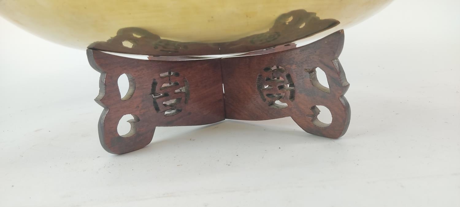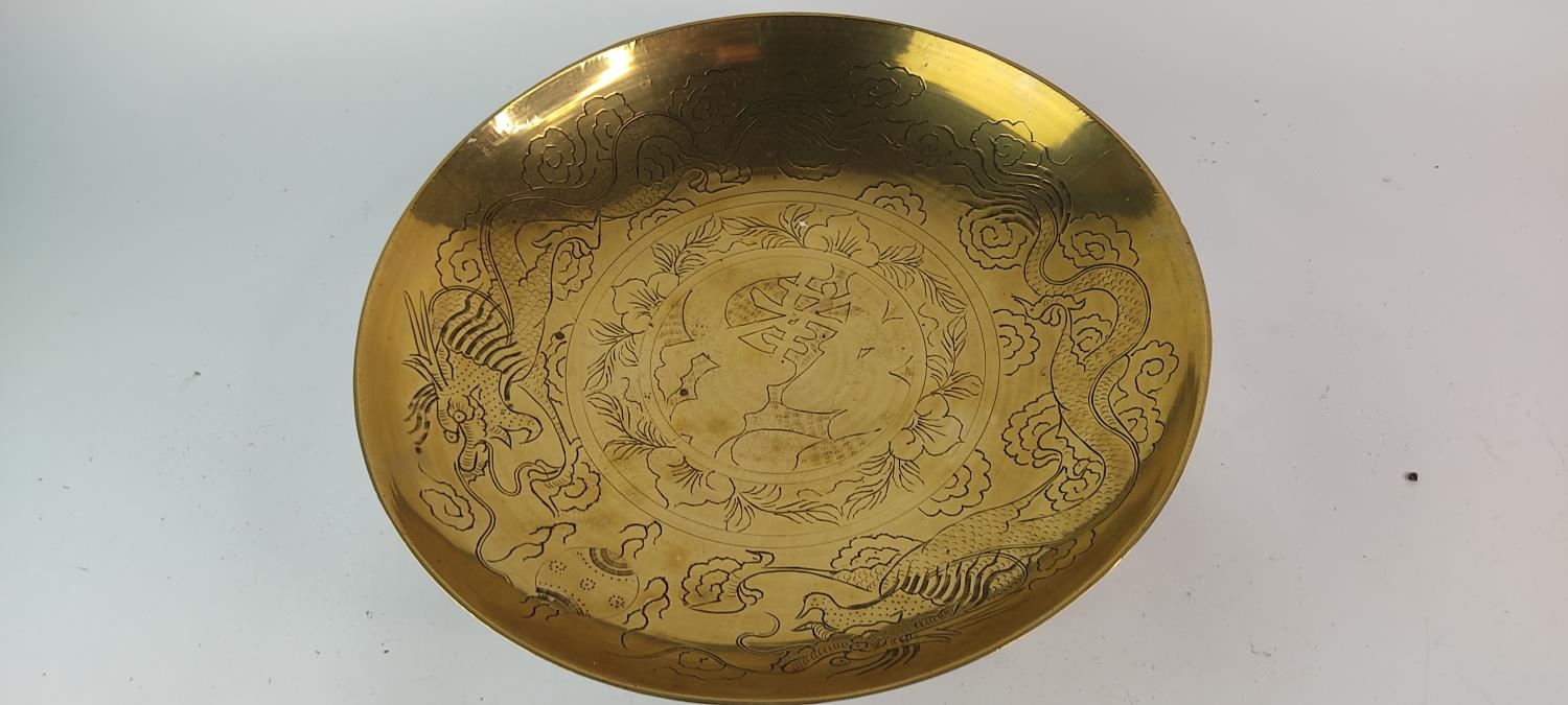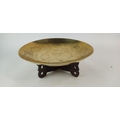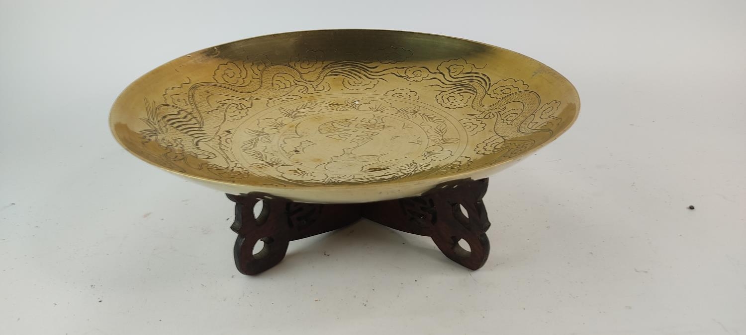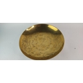 A vintage brass and engraved bowl on a hardwood stand. Diameter measuring 36cm.