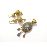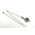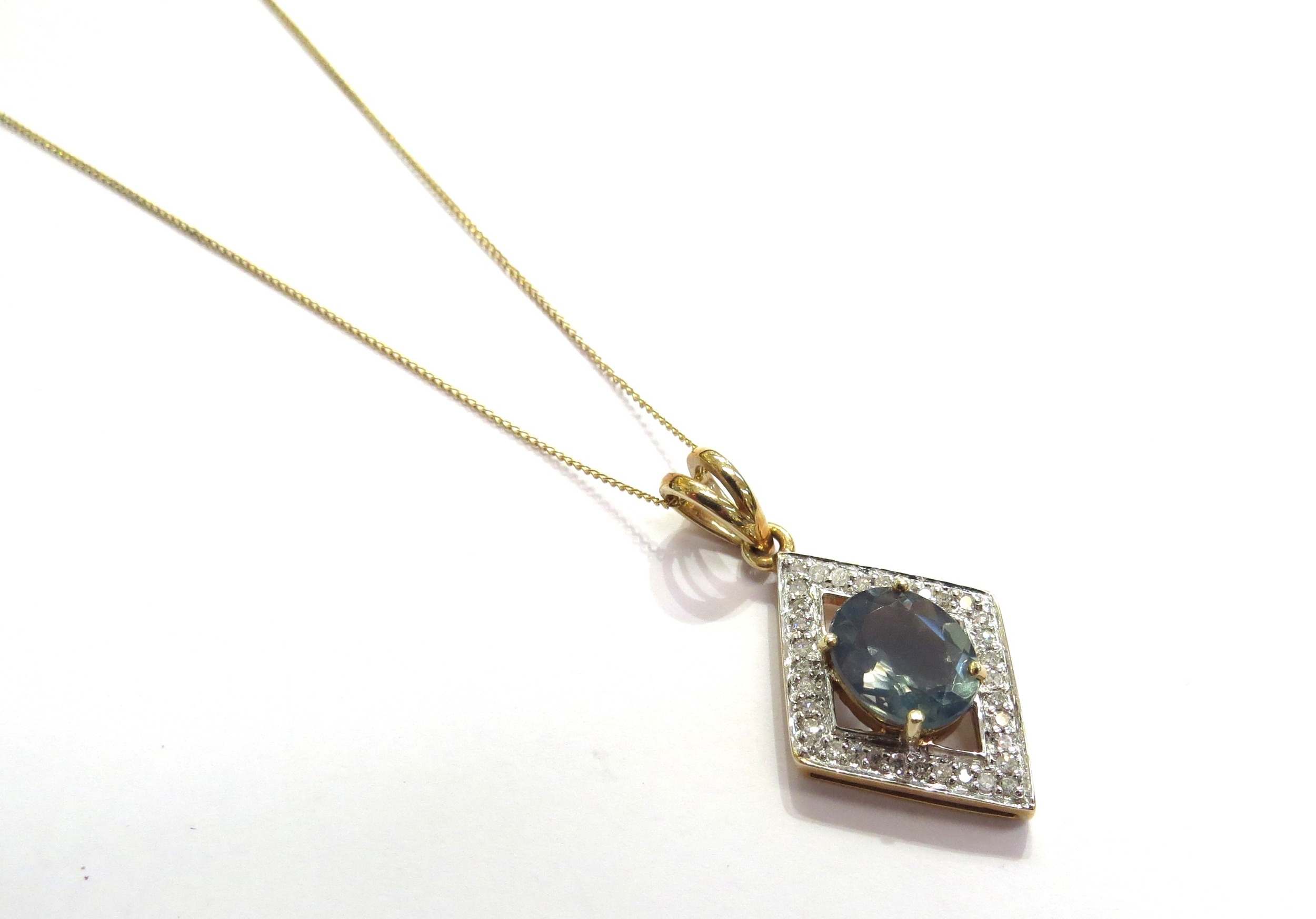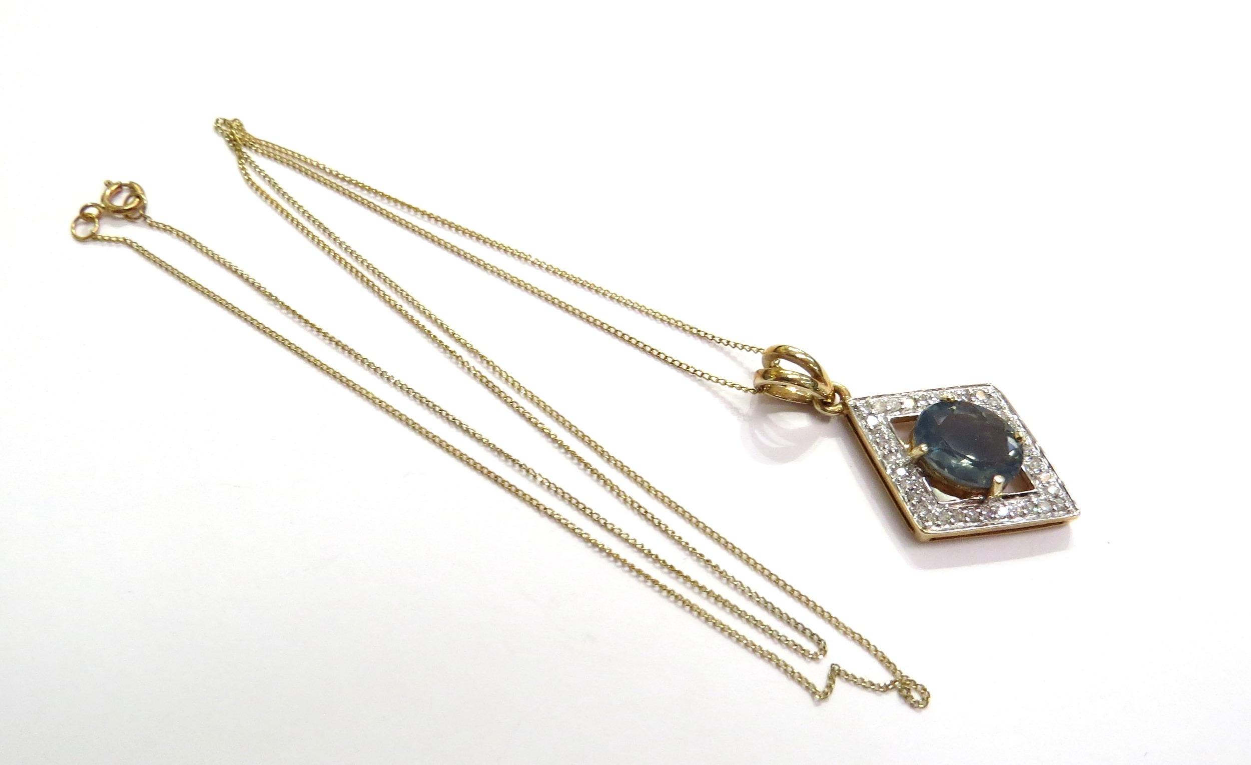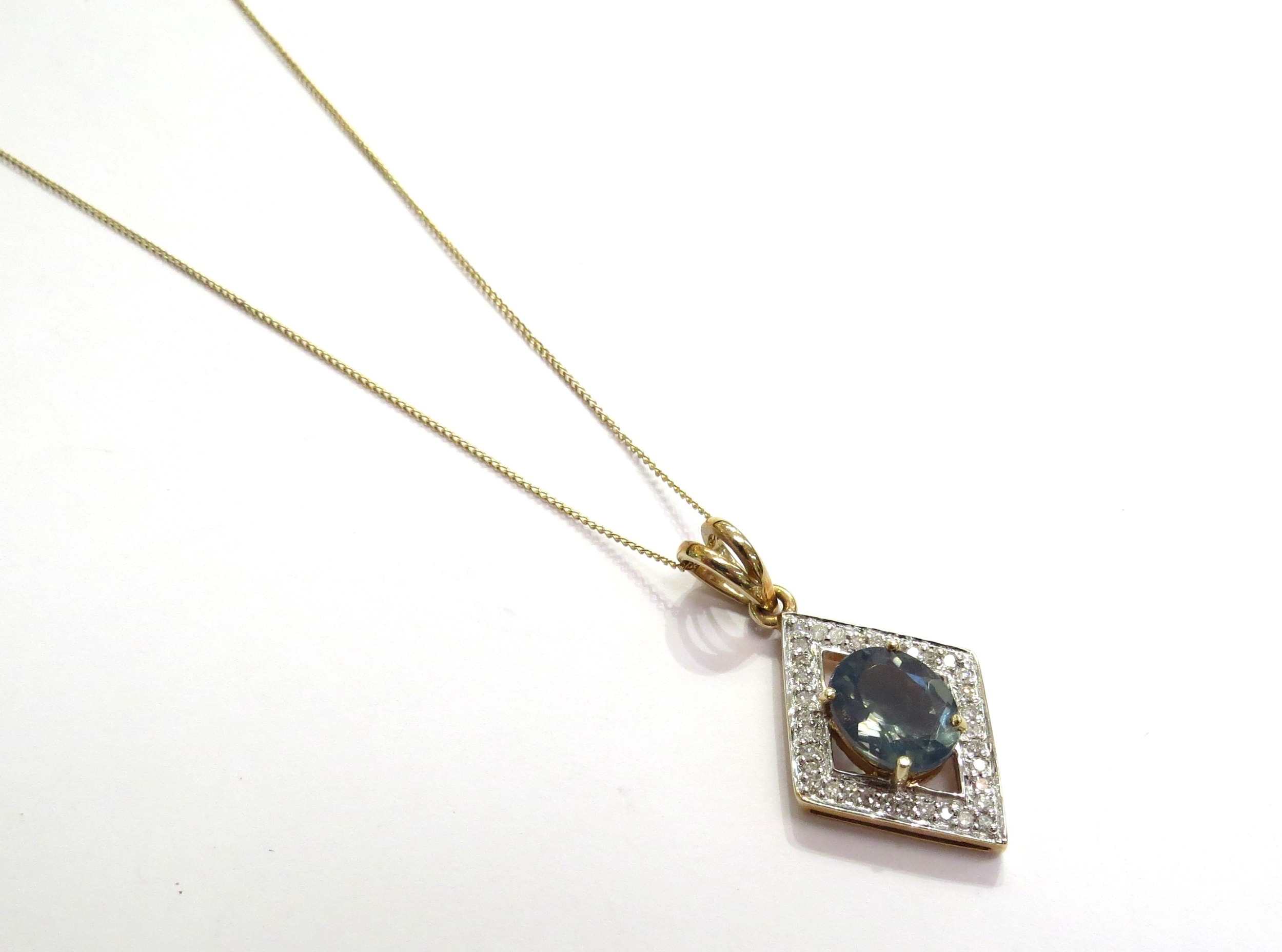 A 9ct gold neckchain, 45cm long hung with a 9ct gold diamond and blue stone pendant, 3.1g