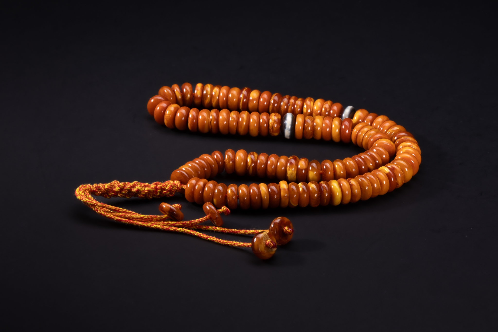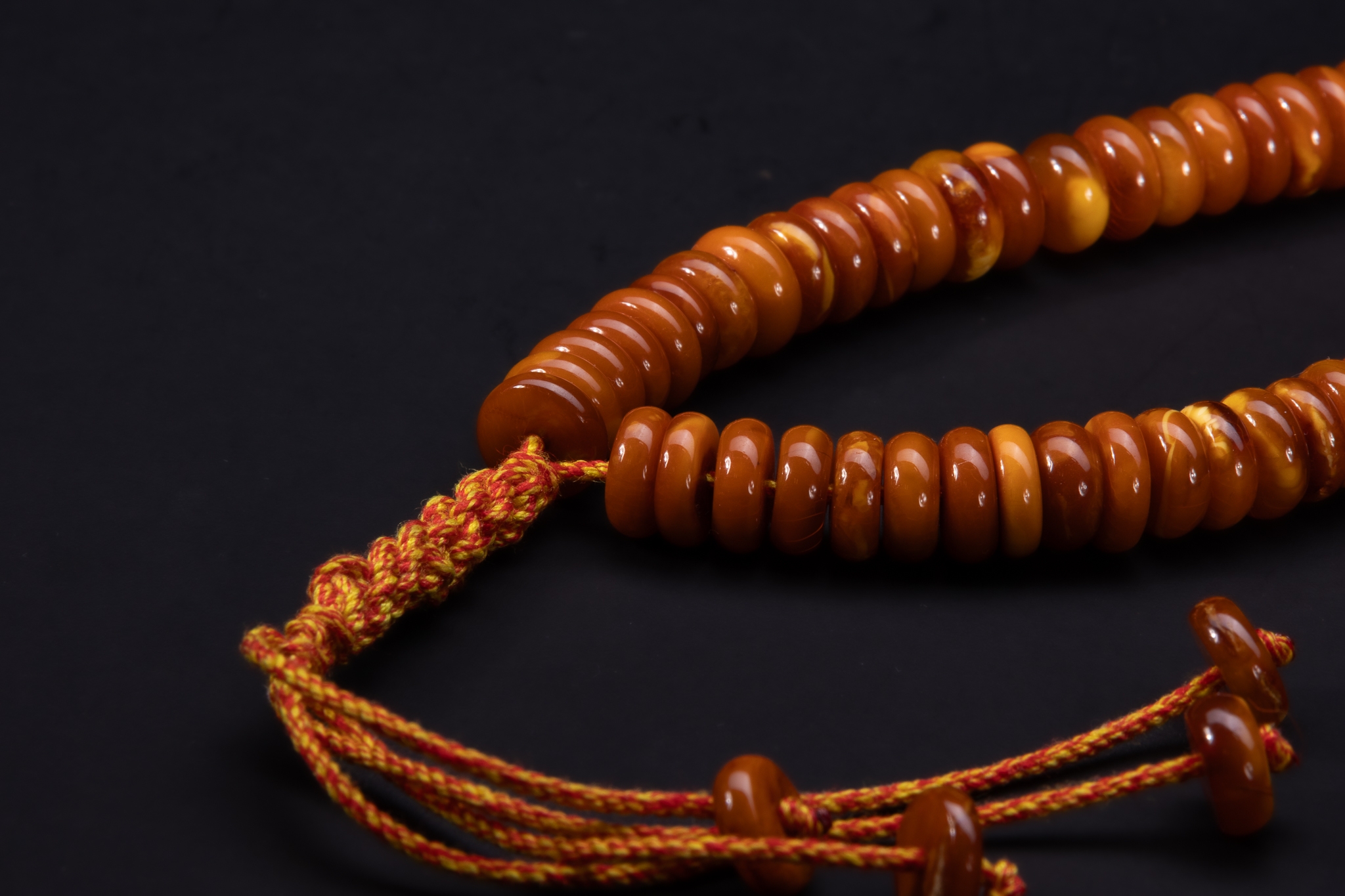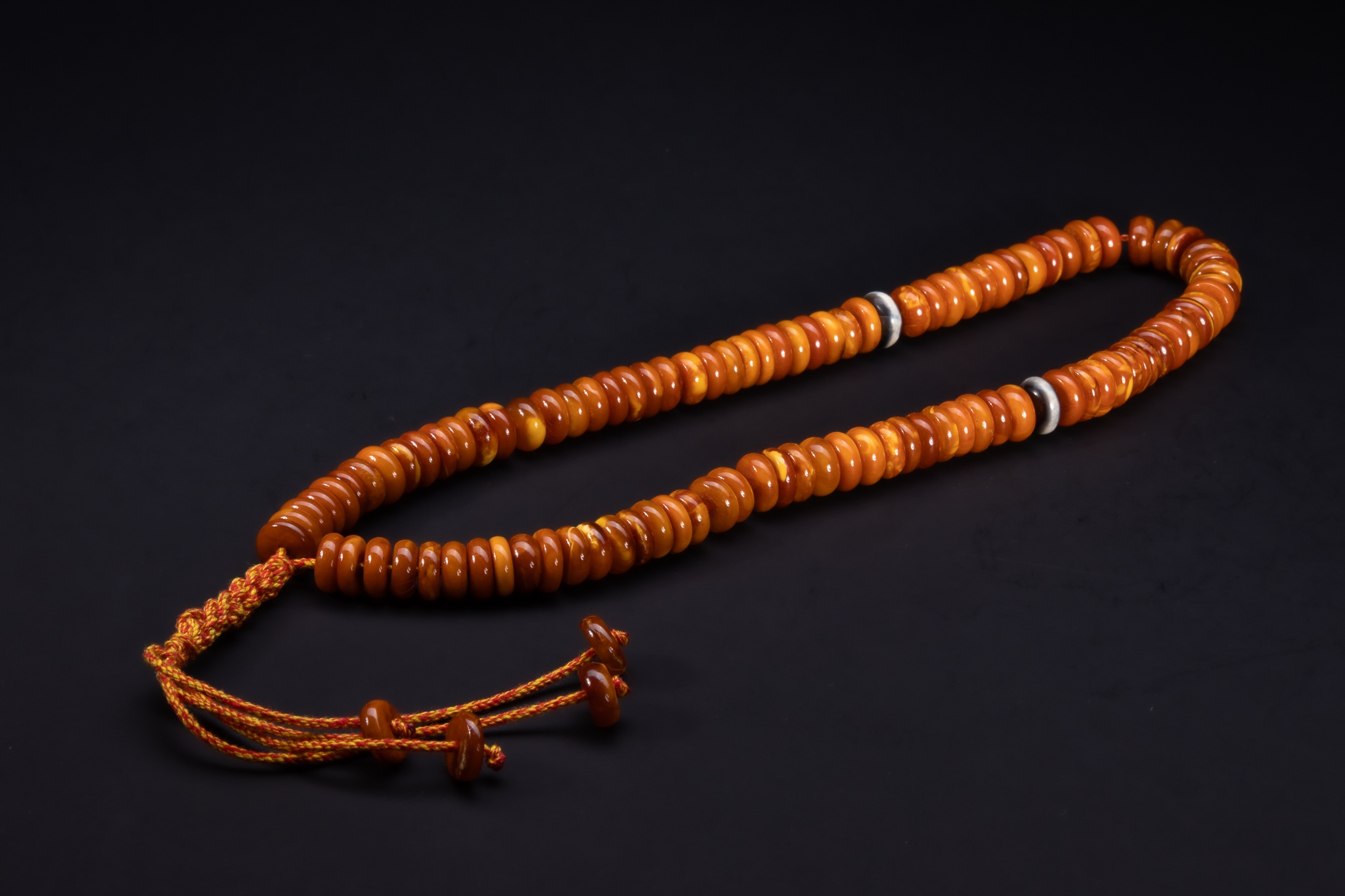A strand composed of rounded, flattened butterscotch amber beads displaying warm honey and caramel tones with natural tonal variation throughout. The beads are smoothly polished and arranged in a graduated sequence, separated at intervals by discreet metal spacers. The strand is finished with a braided cord and matching amber terminal beads.