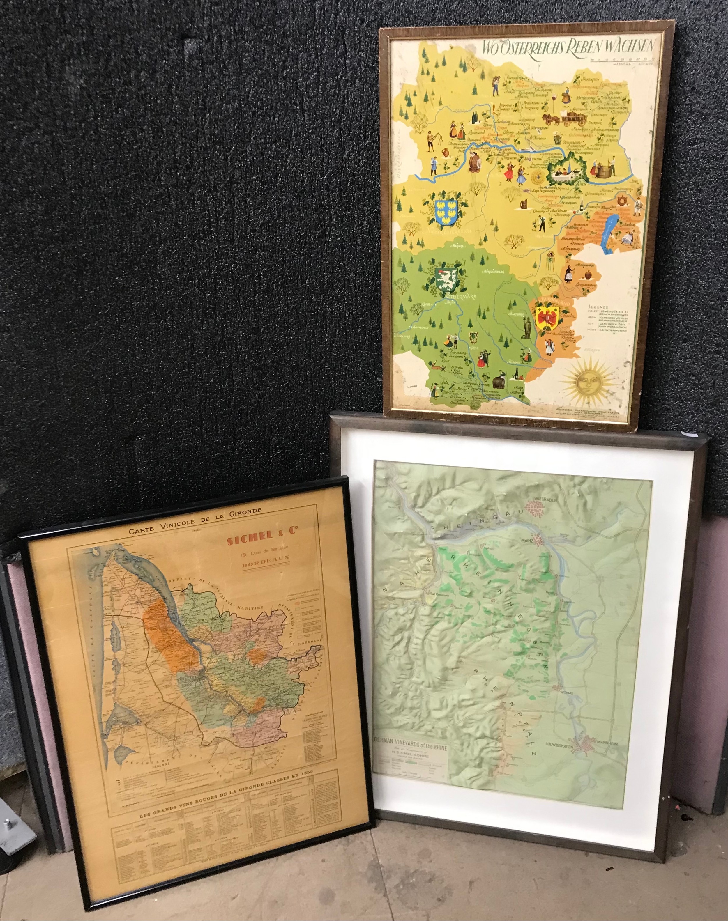 A map of Bordeaux, a topographical map of the German Vineyards of the Rhine and a vintage map of Austria