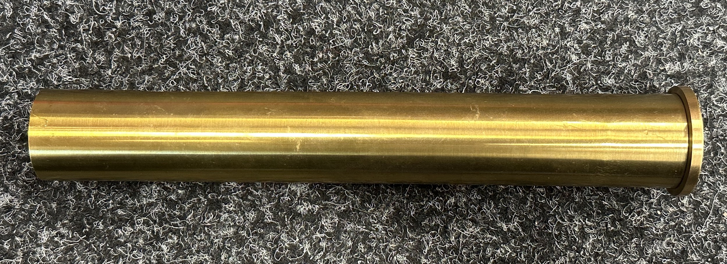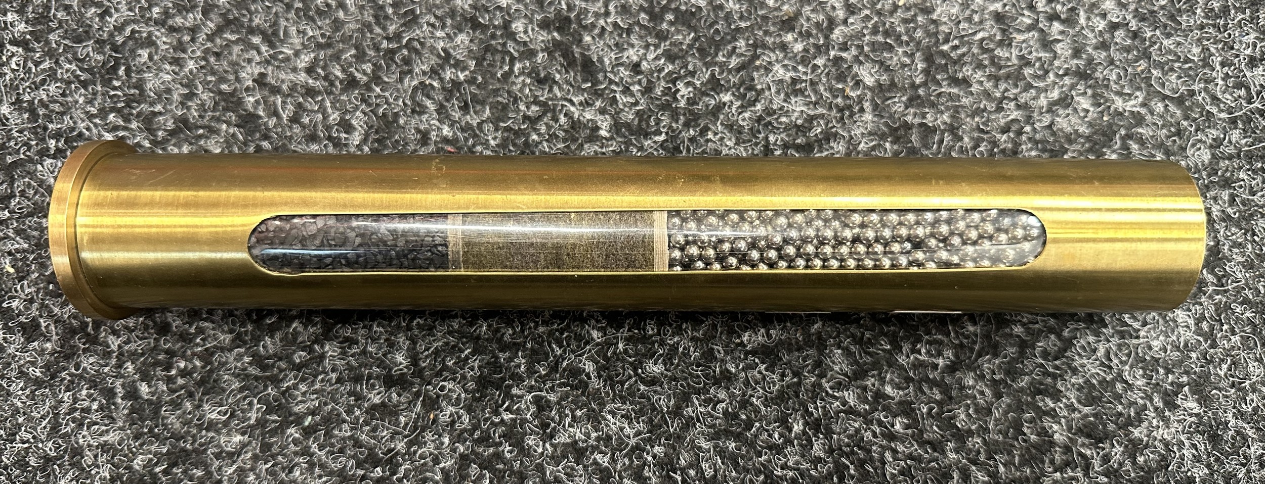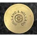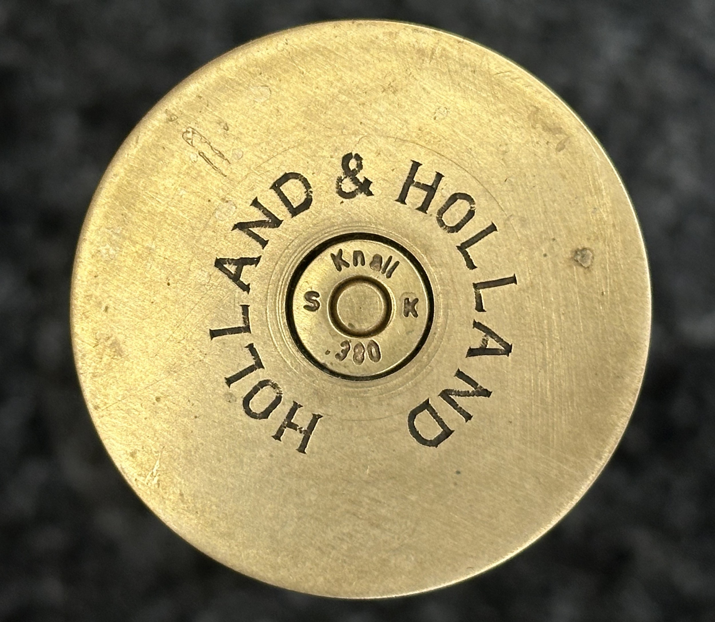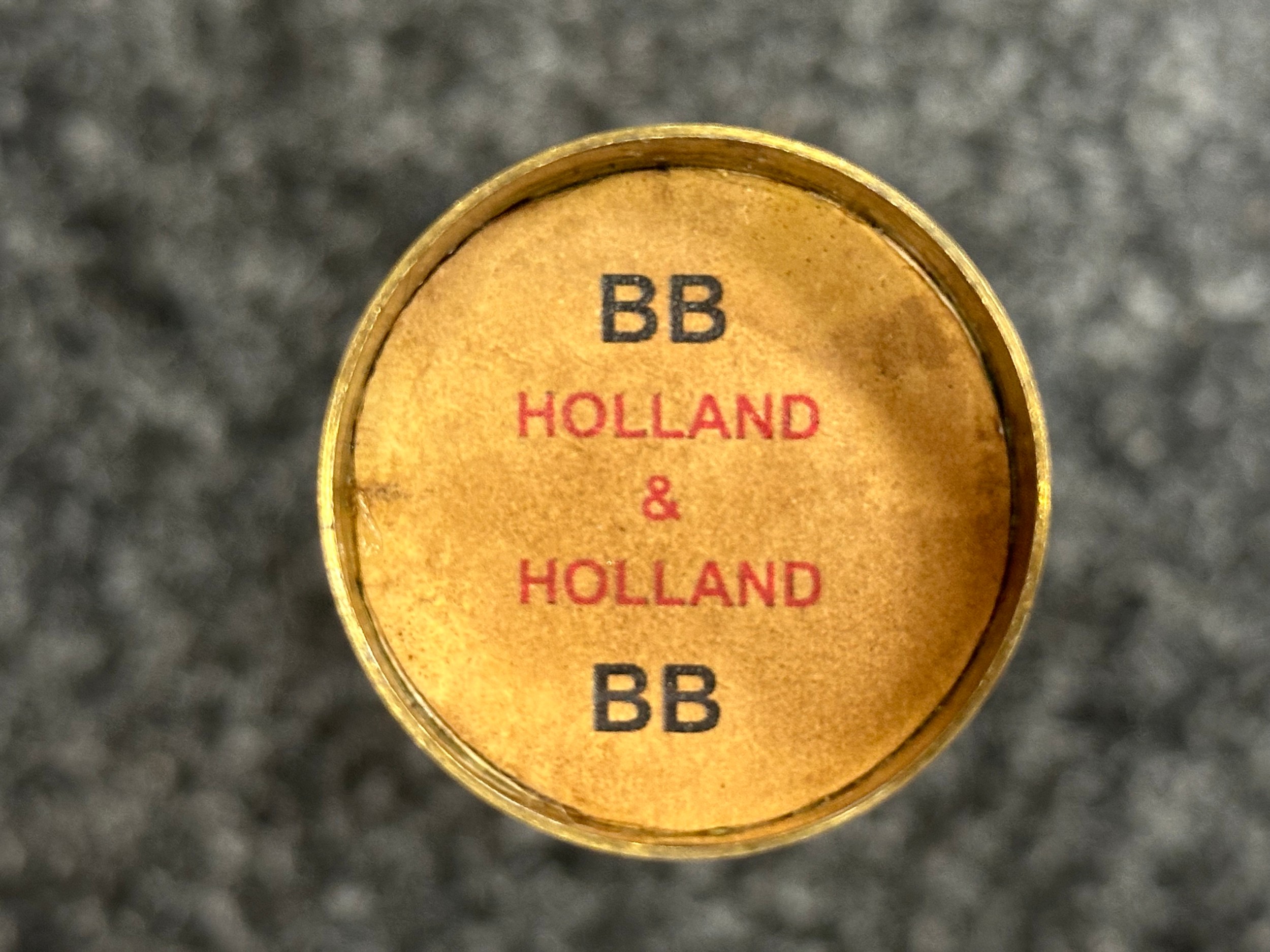 Holland & Holland 1 1/2 inch Brass Punt Gun Cartridge. Sectioned to show the propellant, wad and shot. Primer is a .380 Knall blank cartridge. Overall length 260mm. (10 1/4 inch) Maker marked to base and to cardboard.