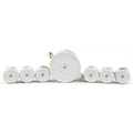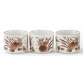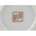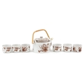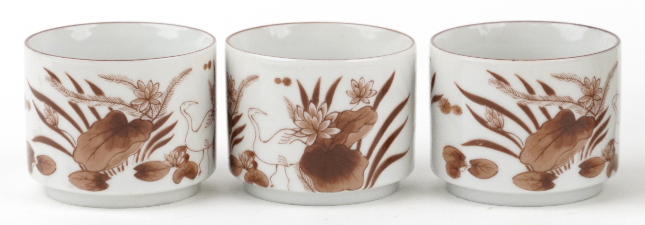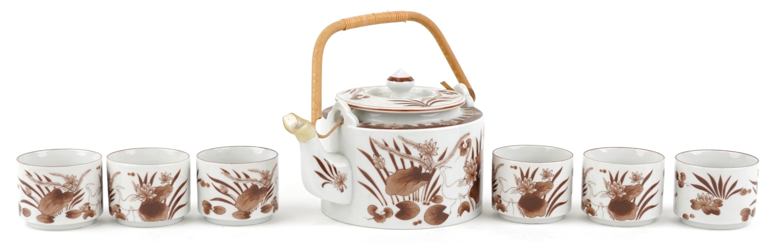 A Chinese porcelain six place tea service with teapot decorated with storks and foliage, the teapot 20cm in length.