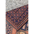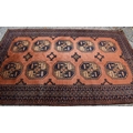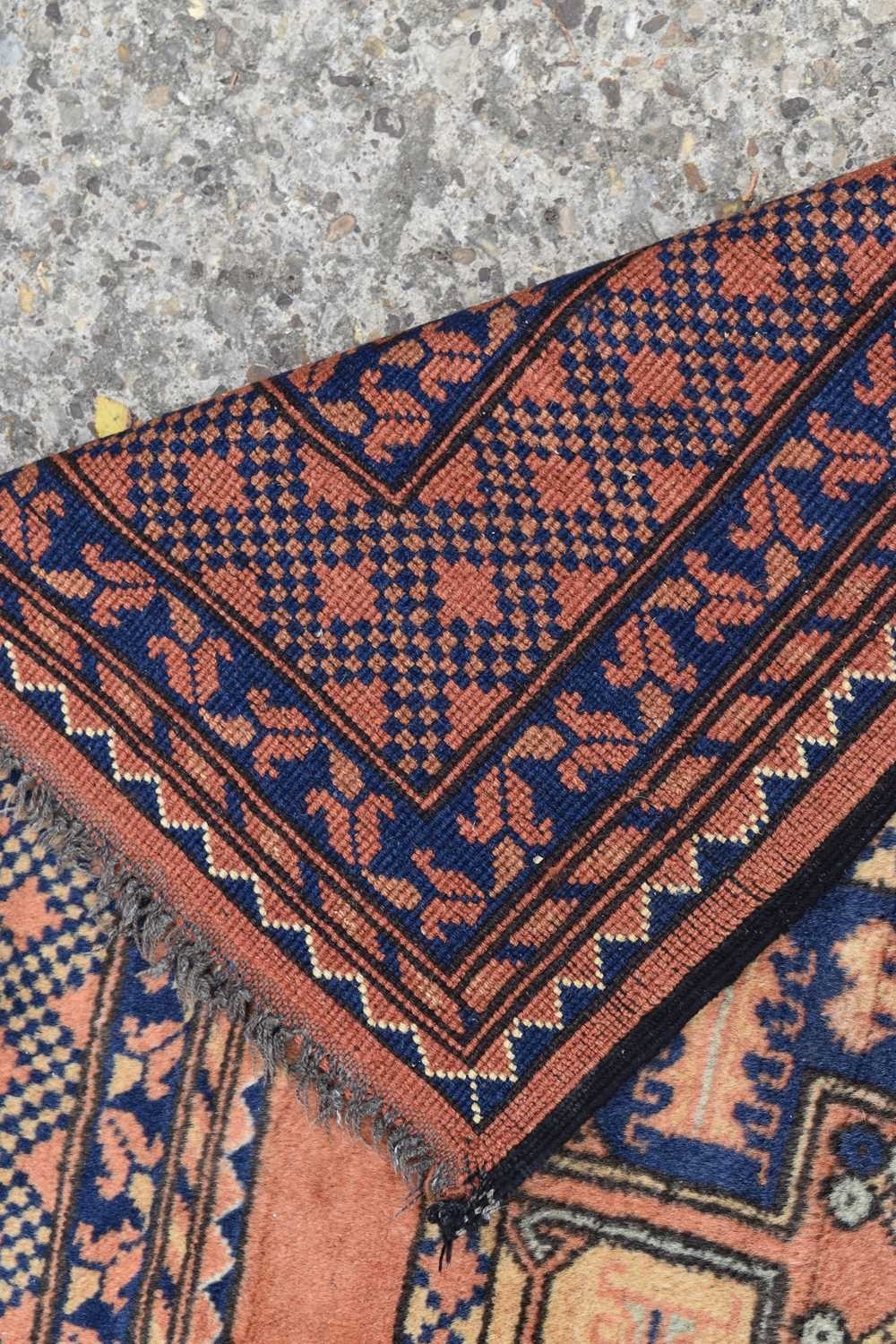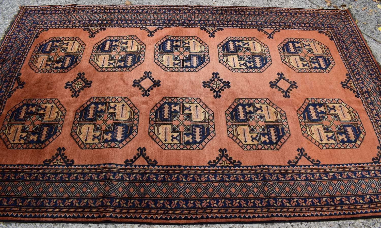 An antique Middle Eastern wool rug, with orange ground and repeating foliate and geometric border with medallions to the centre, 280cms by 175cms
