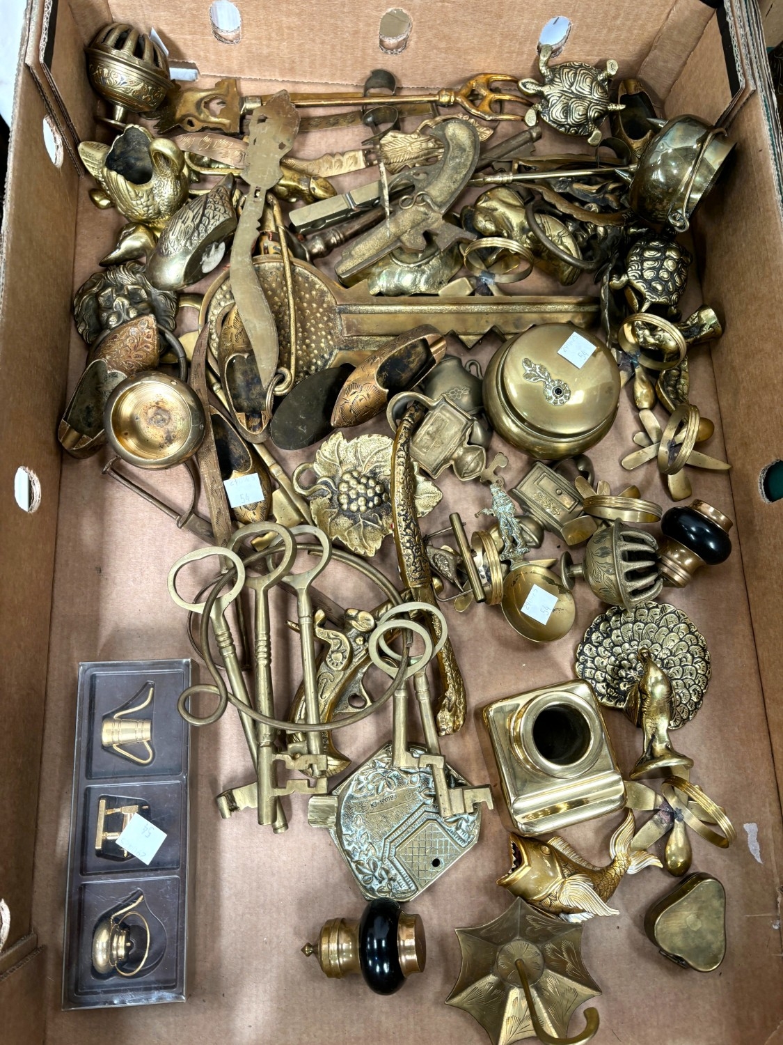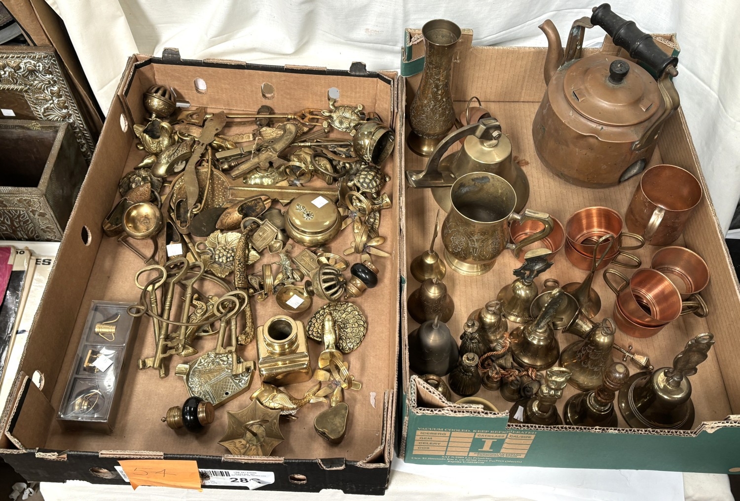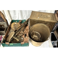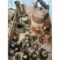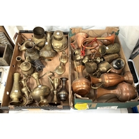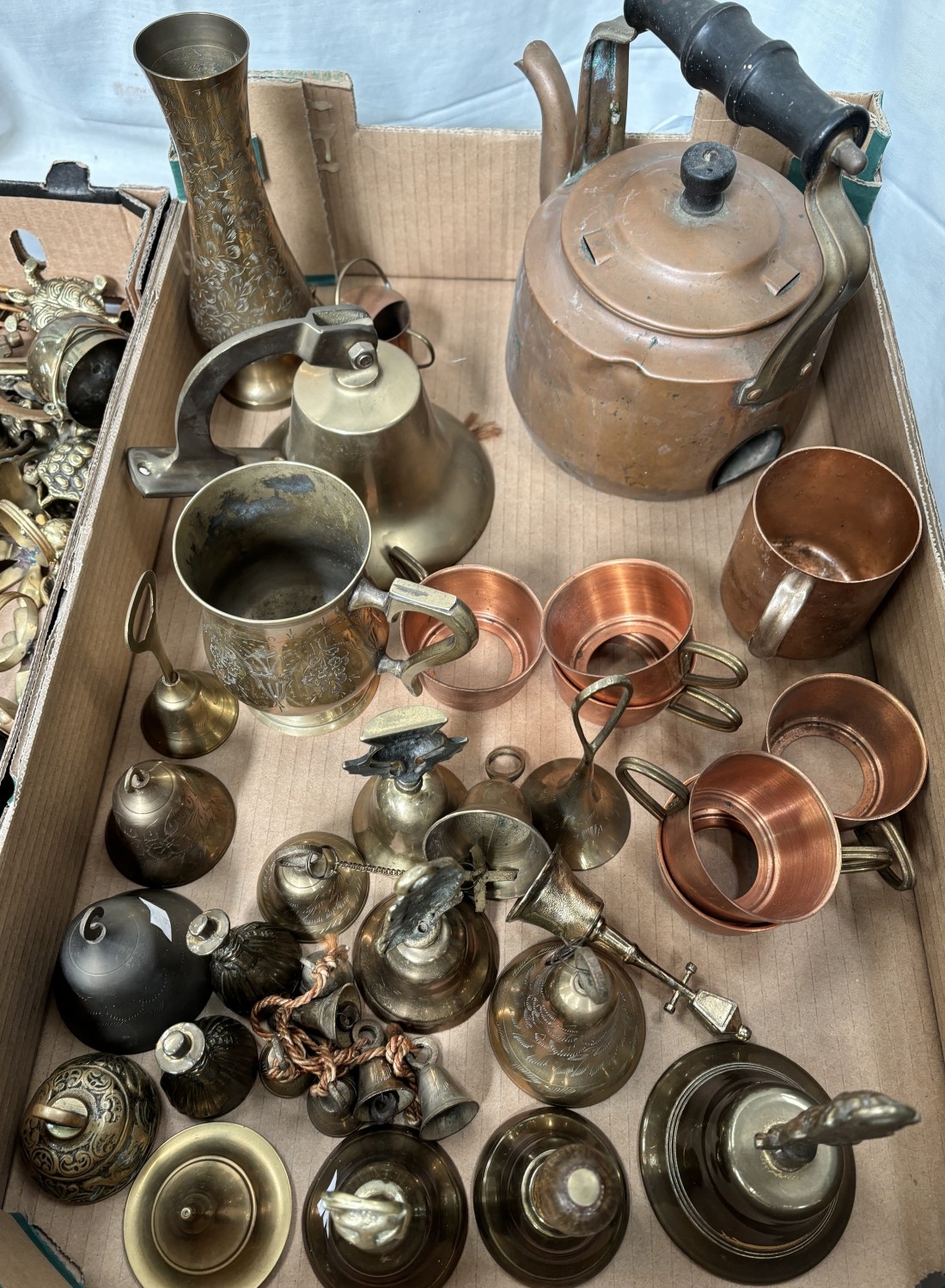 A selection of ornamental copper and brass inc. copper kettles, monastery bell and other bells; miniature items etc.