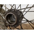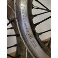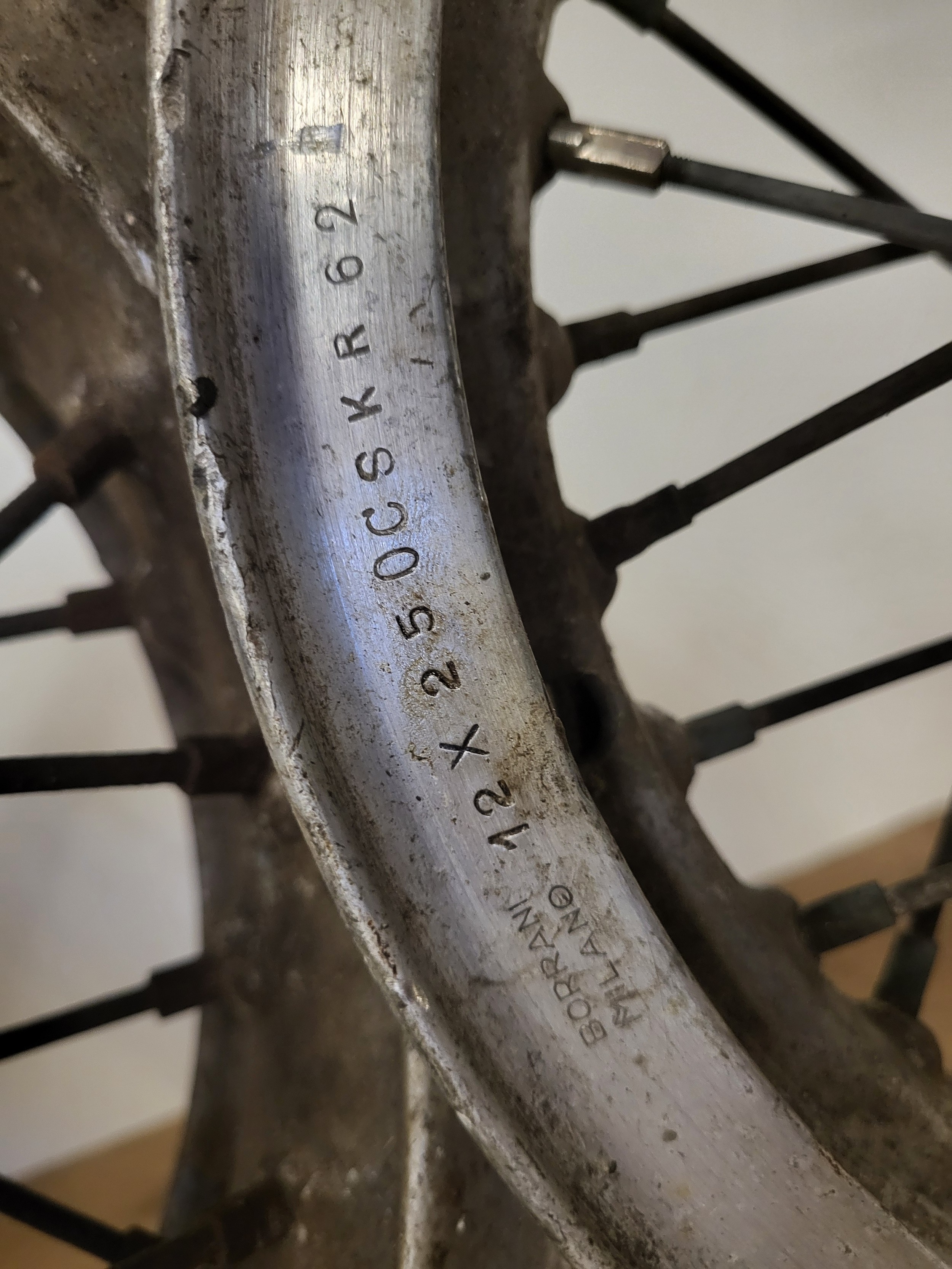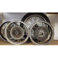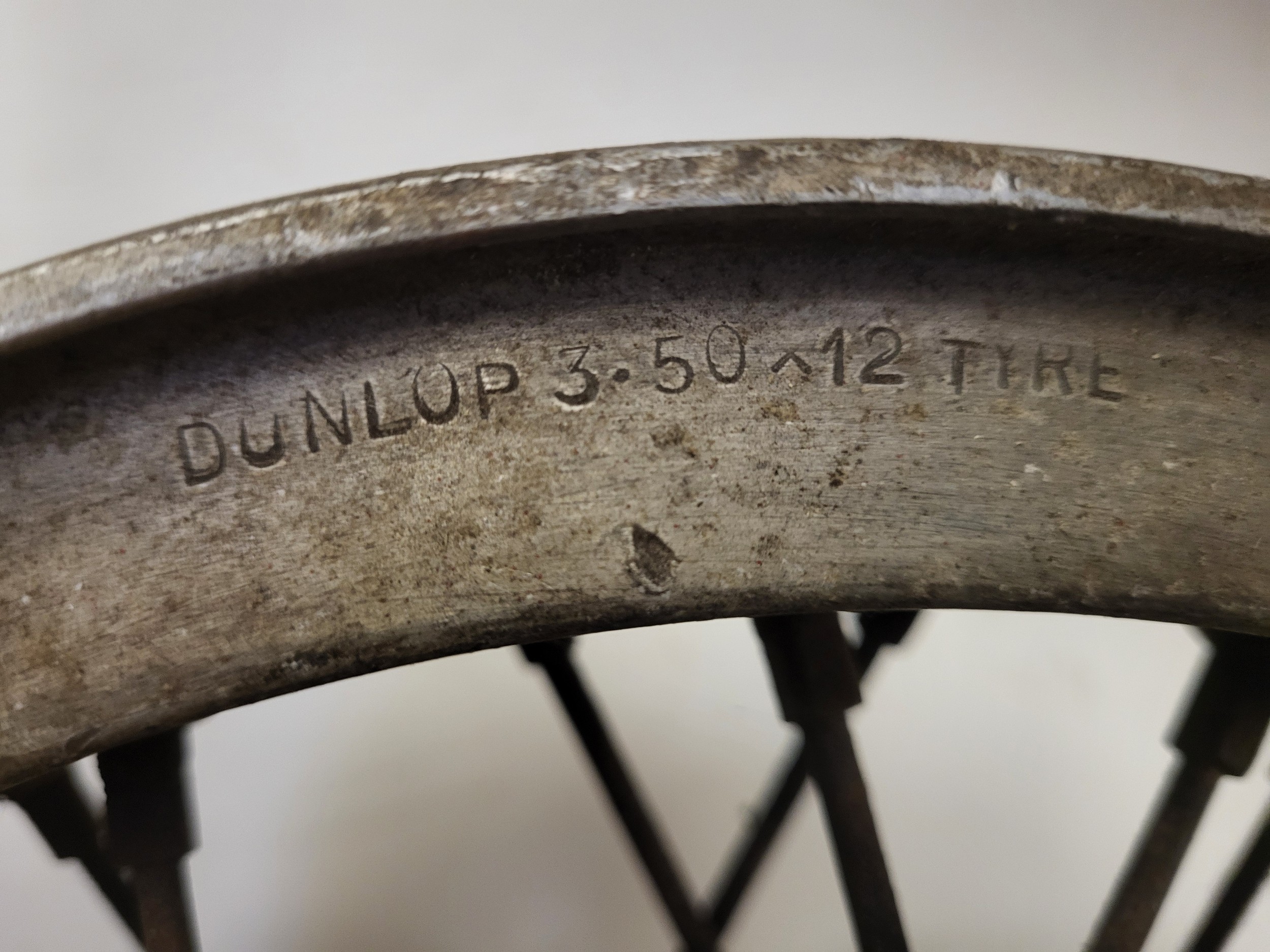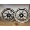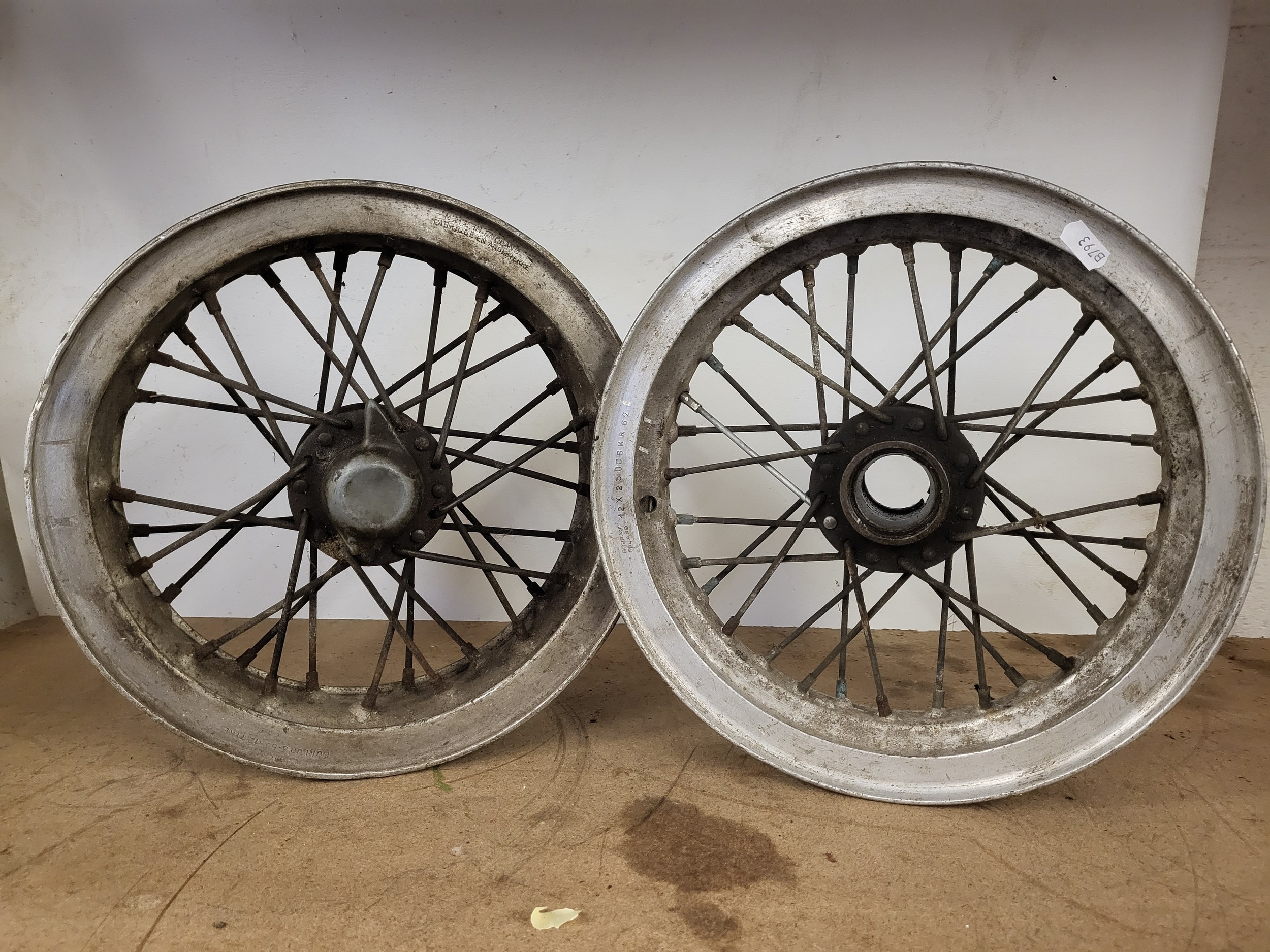 A pair of 12 inch spoked "Knock Off" wheels, one with a Dunlop rim and one with a Borrani rim.