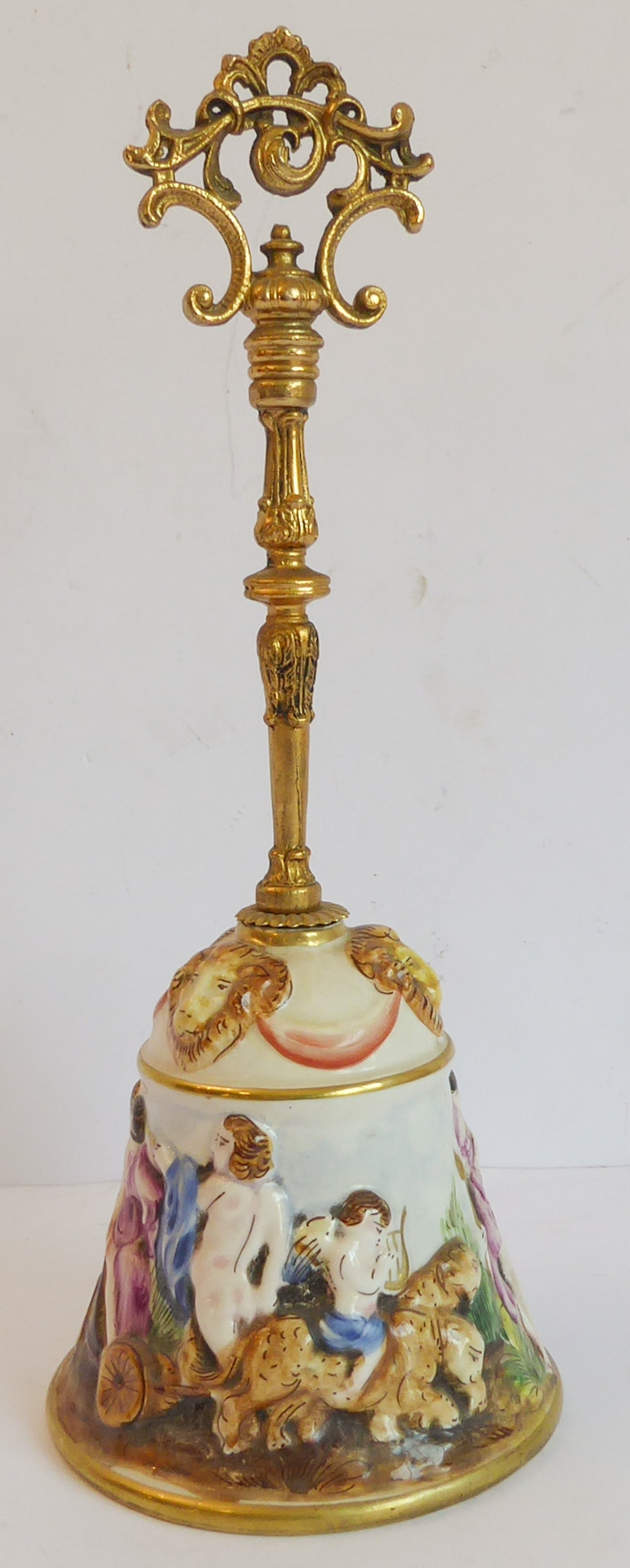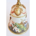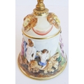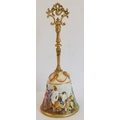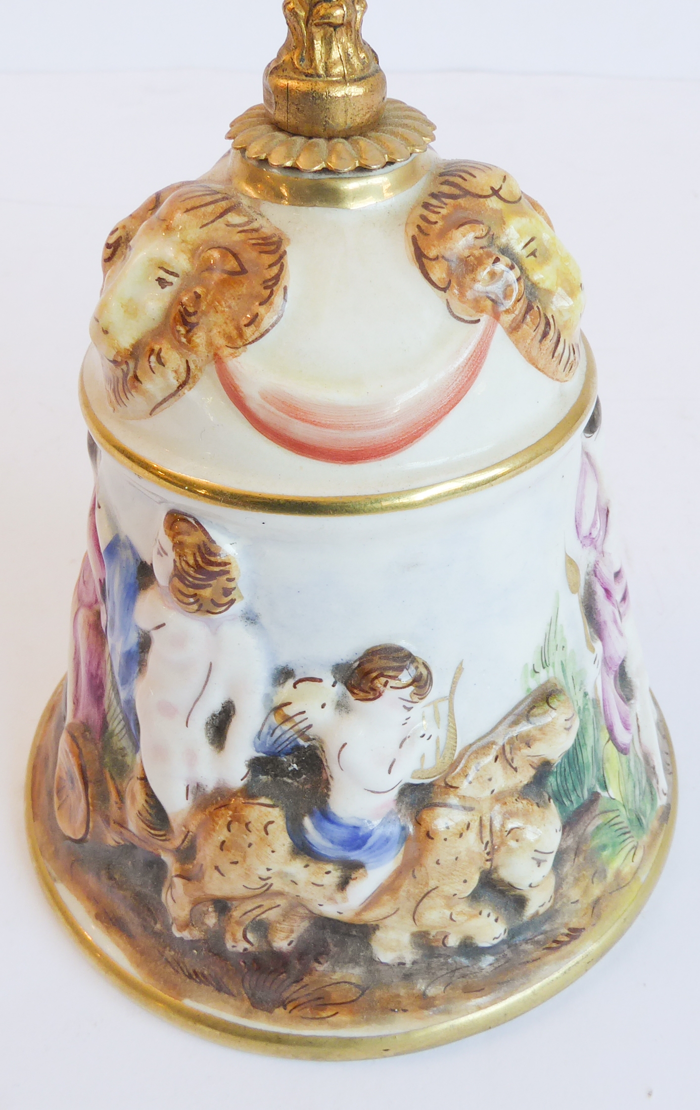 a gilt-metal-mounted Capo di Monte bell decorated in high relief with figures and ram's heads in the usual taste;