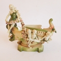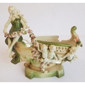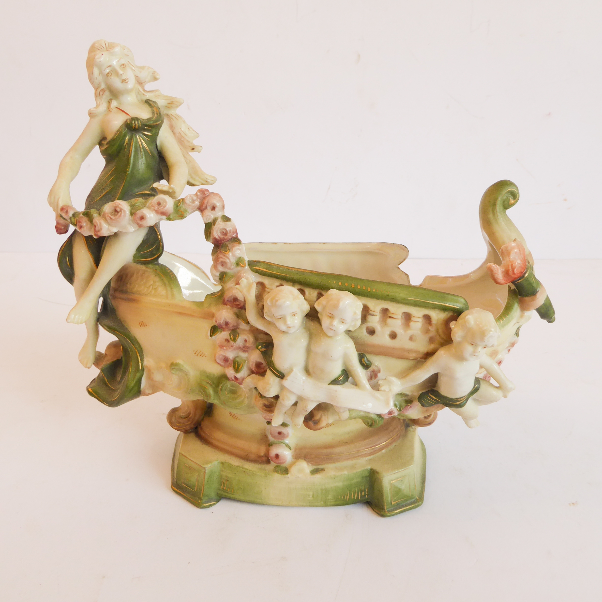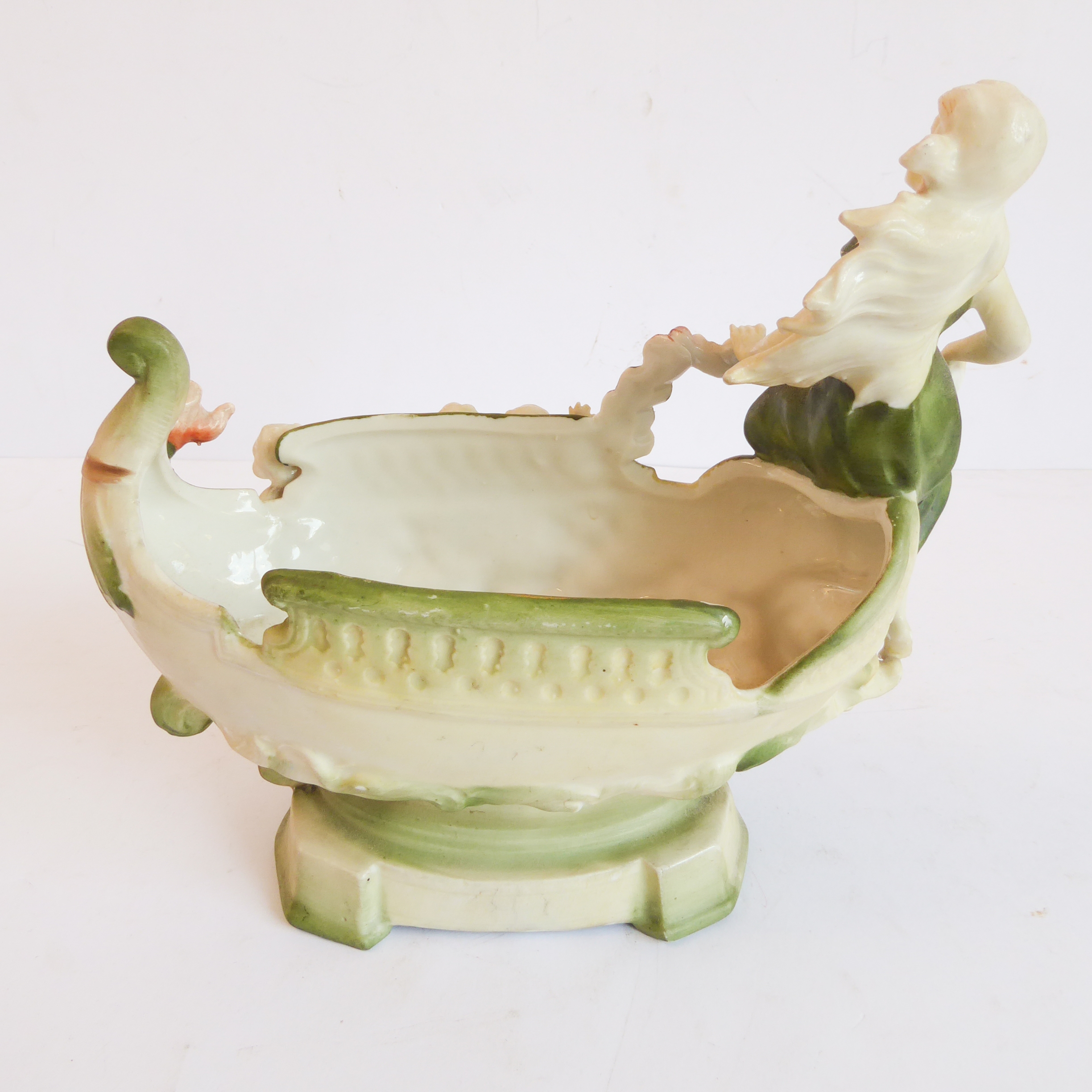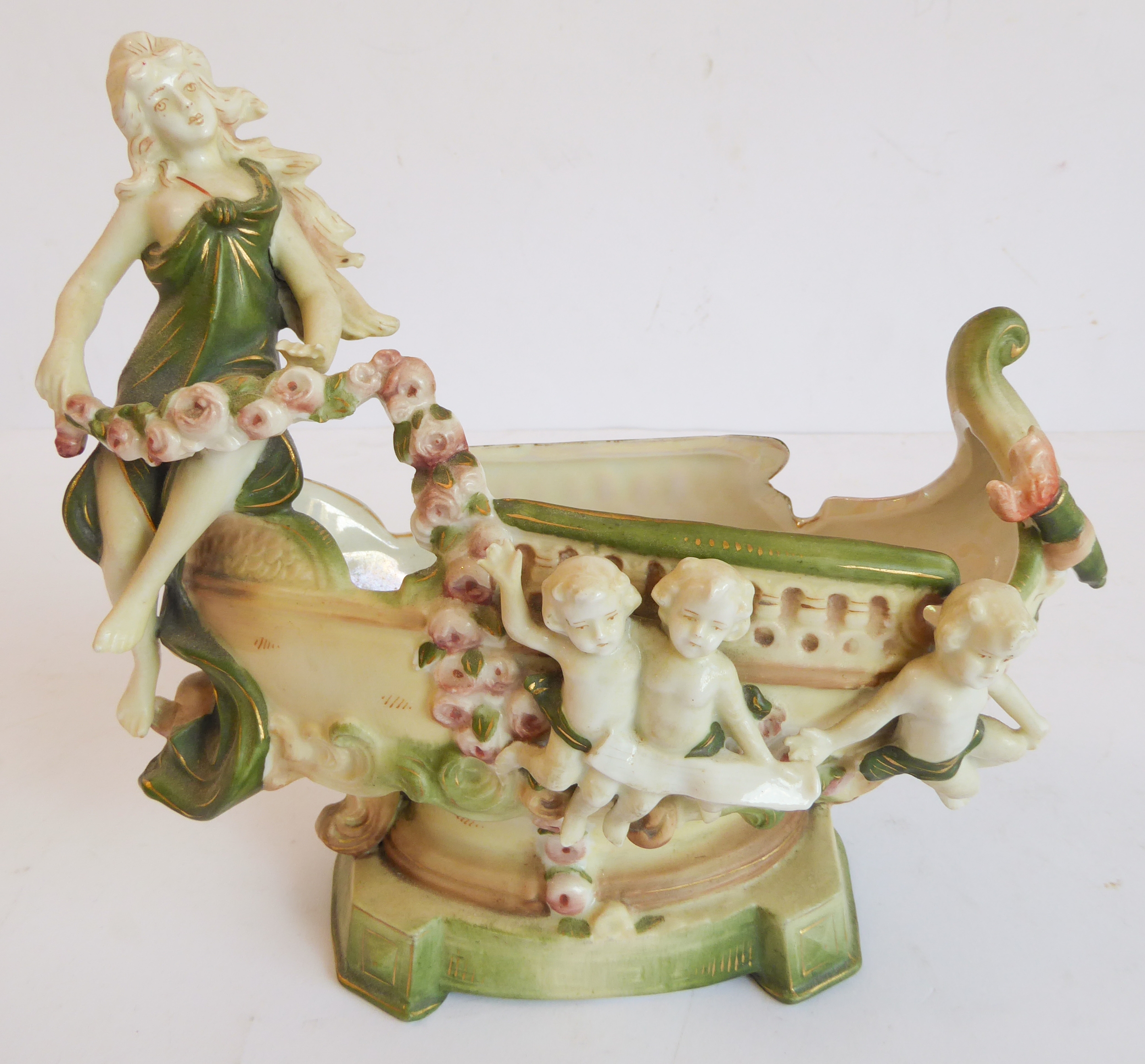 a continental bisque porcelain boat-shaped vase decorated with cherubs and a single seated female figure;