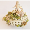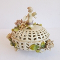 a Capo di Monte style circular potpourri surmounted with a cherub with an artist's palette and brush;