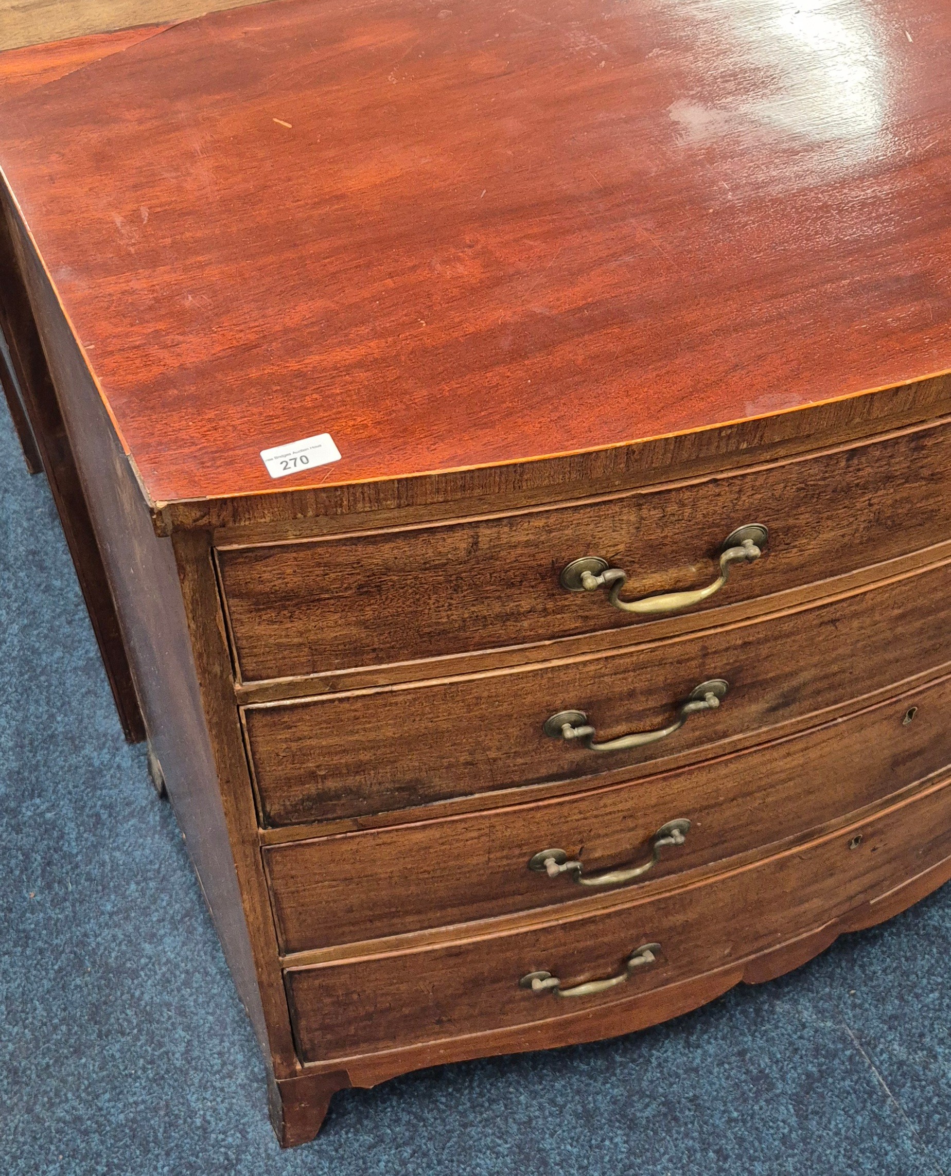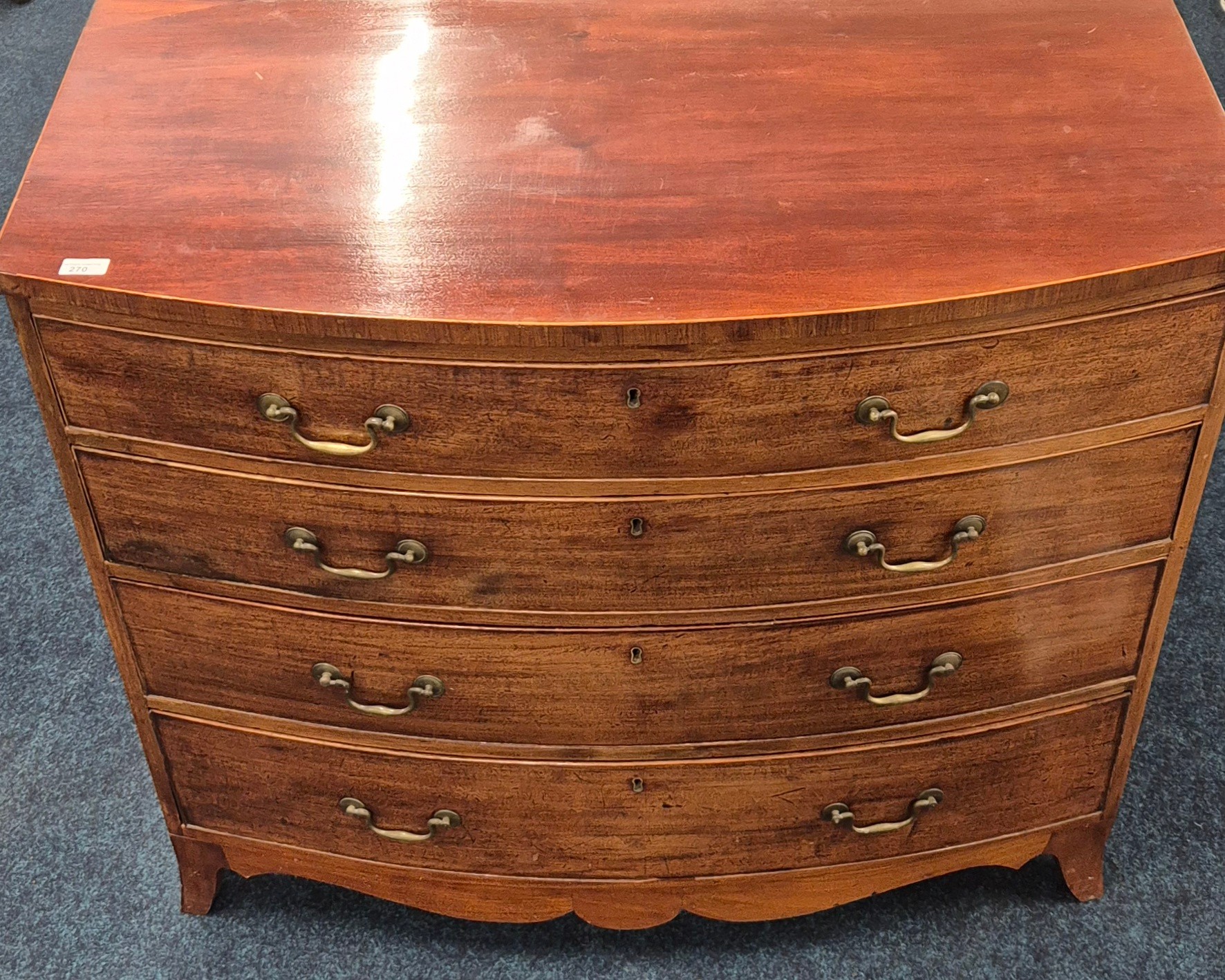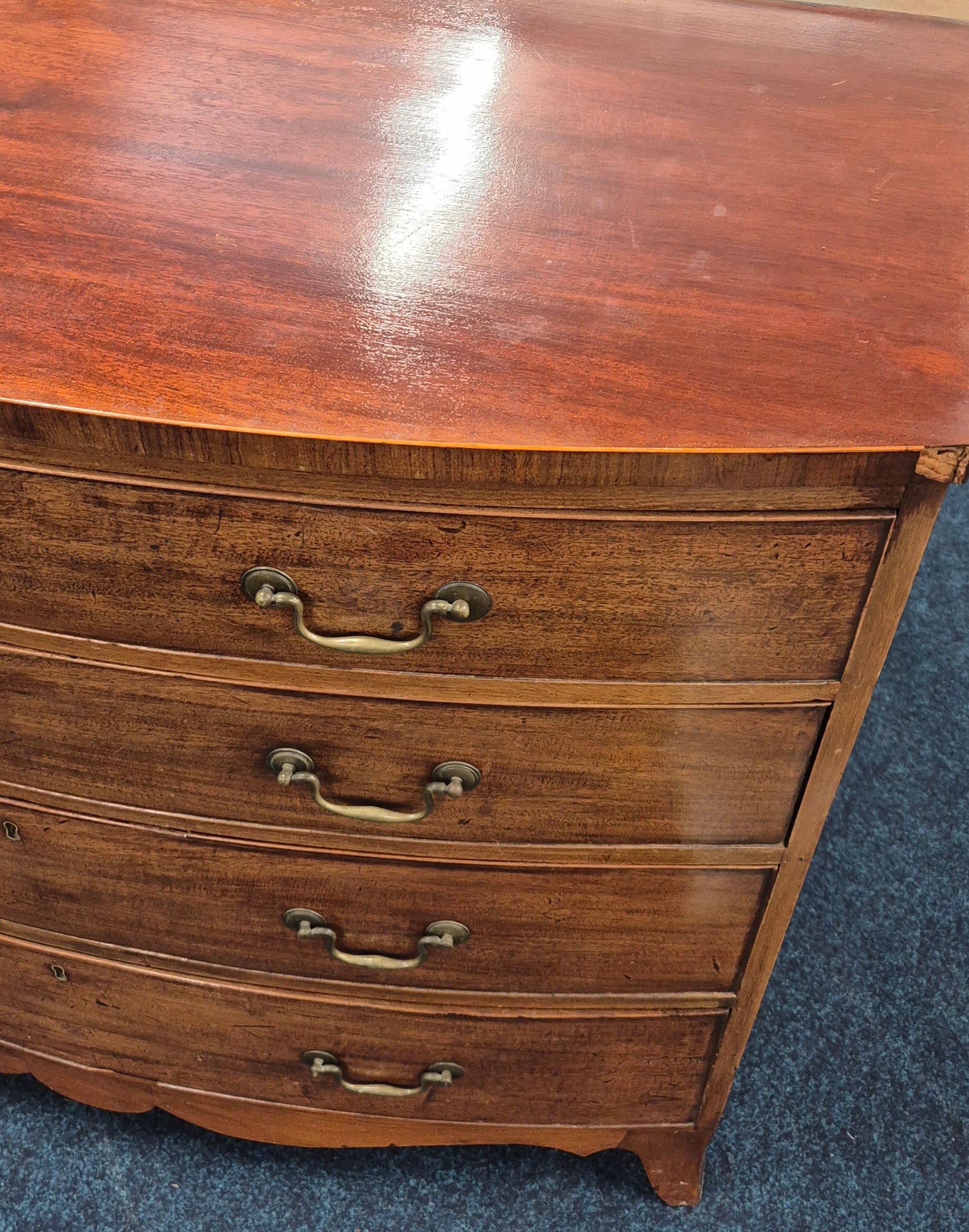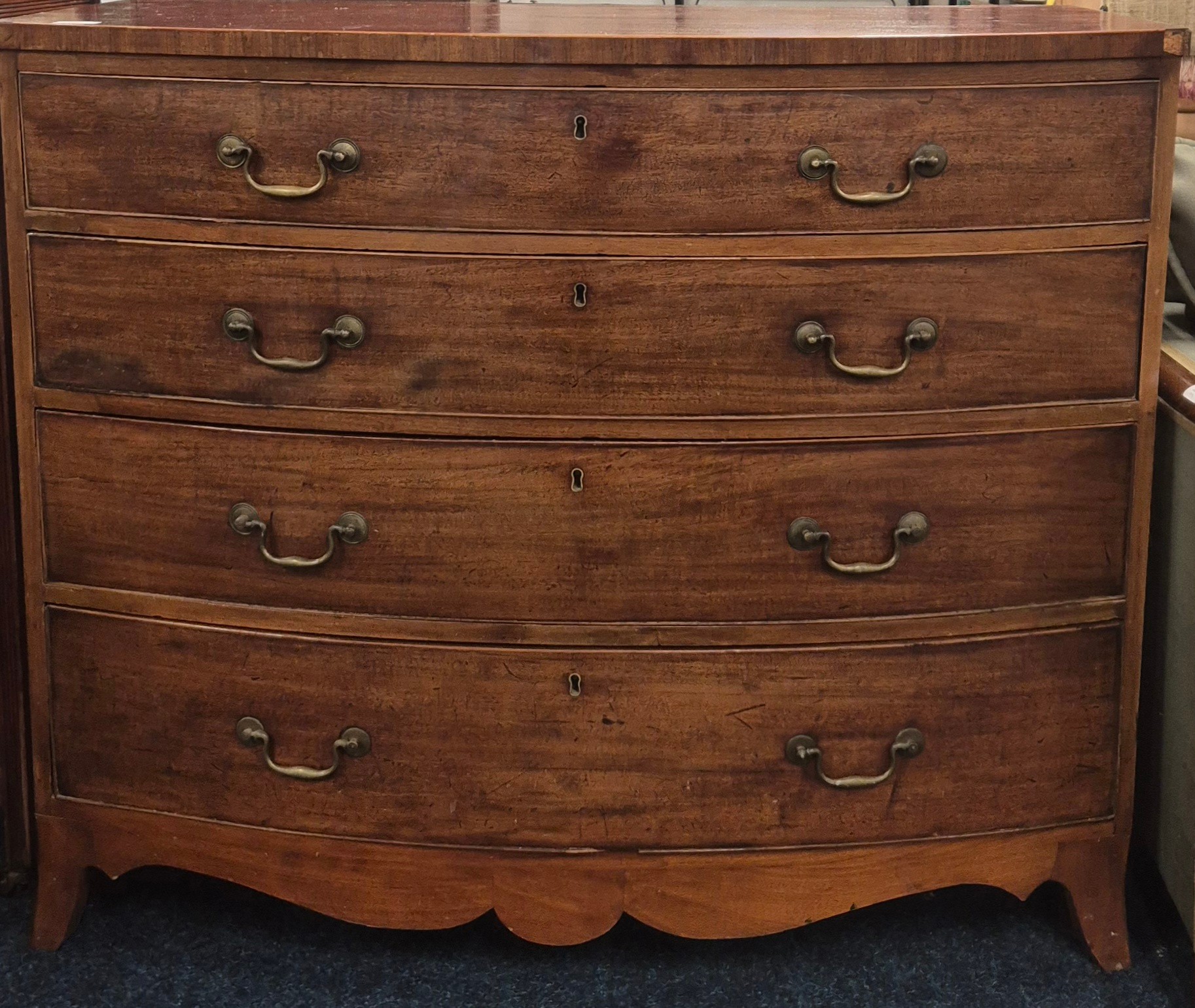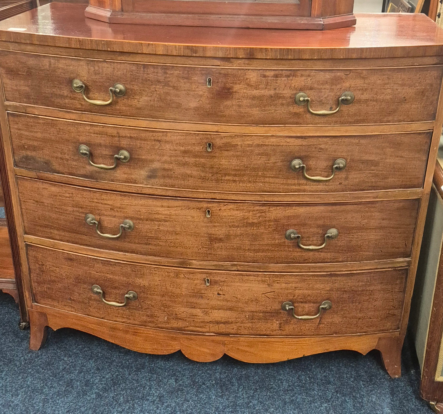 19th Century Mahogany Four Drawer Bow Fronted Chest of drawers with fitted brass handles. 91x108x57cm. As age related wear.