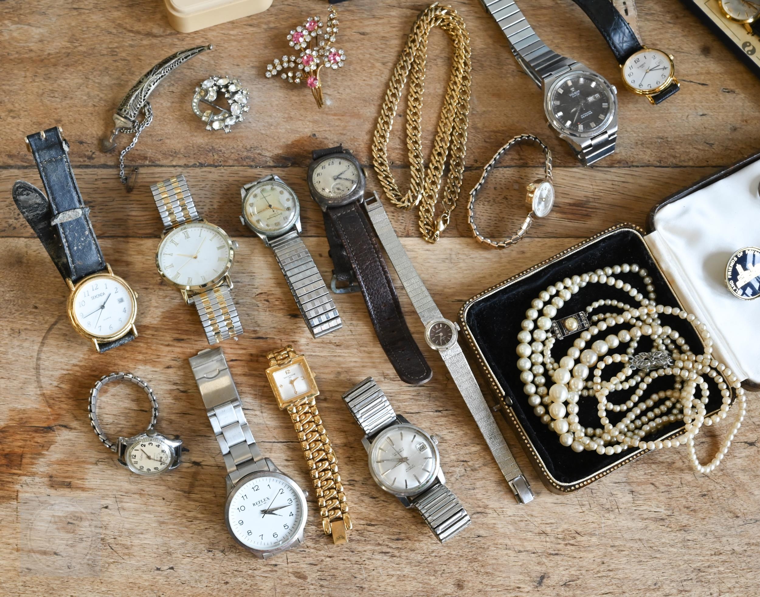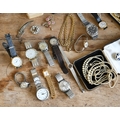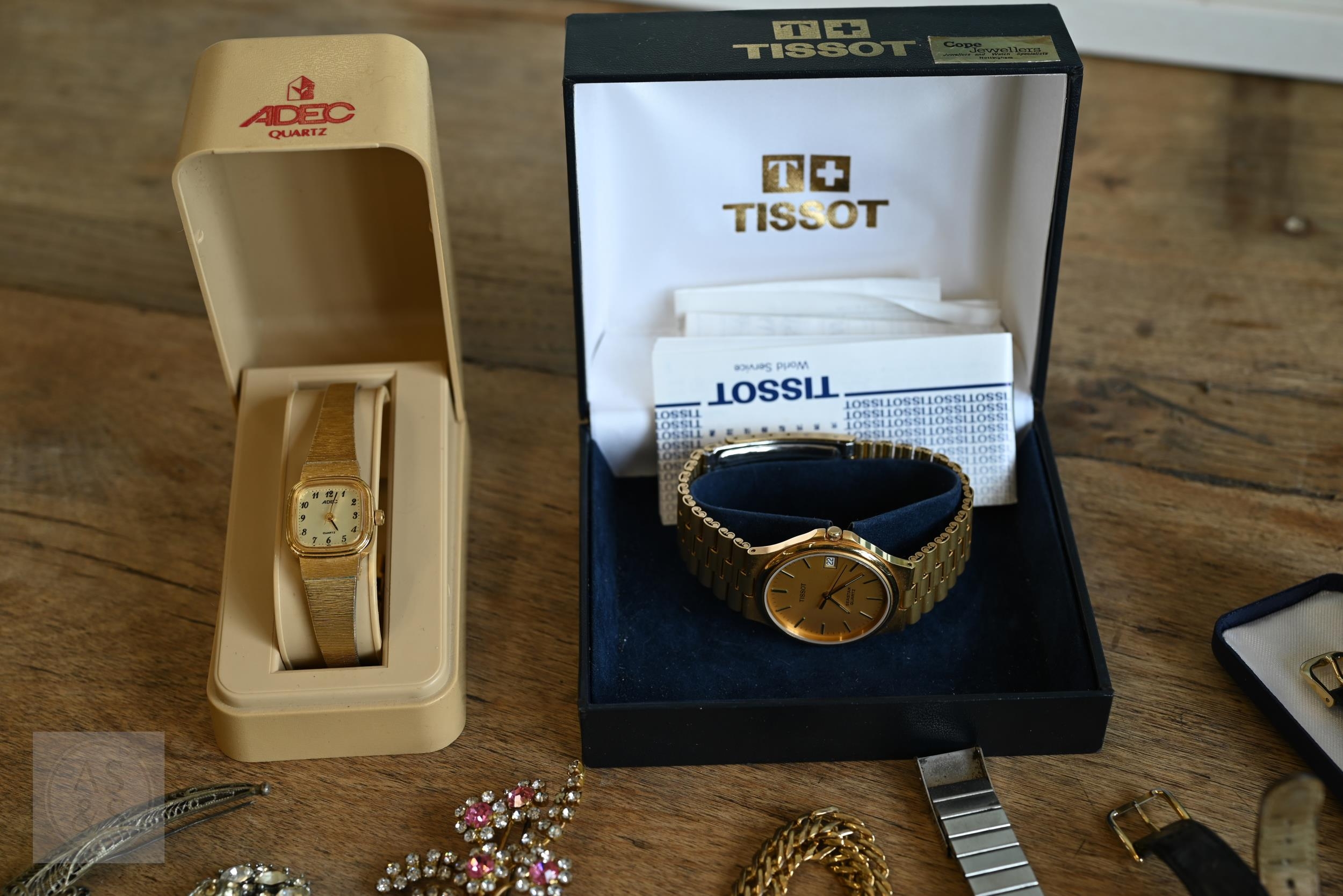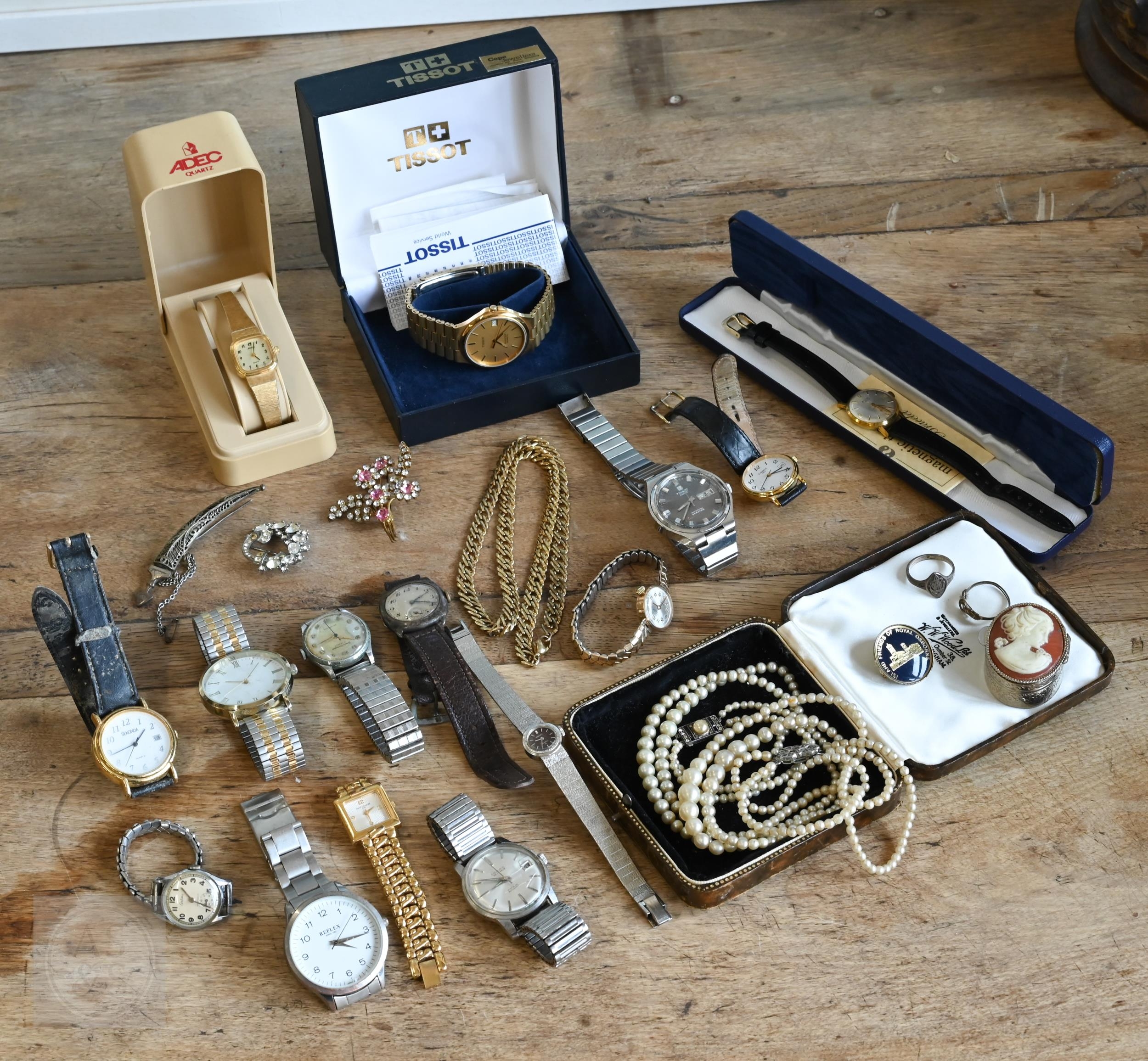 Mixed box of costume jewellery including gilt metal chain, pearls etc and a collection of various ladies and gentleman wristwatches - Tissot, Excalibur, Sekonda etc