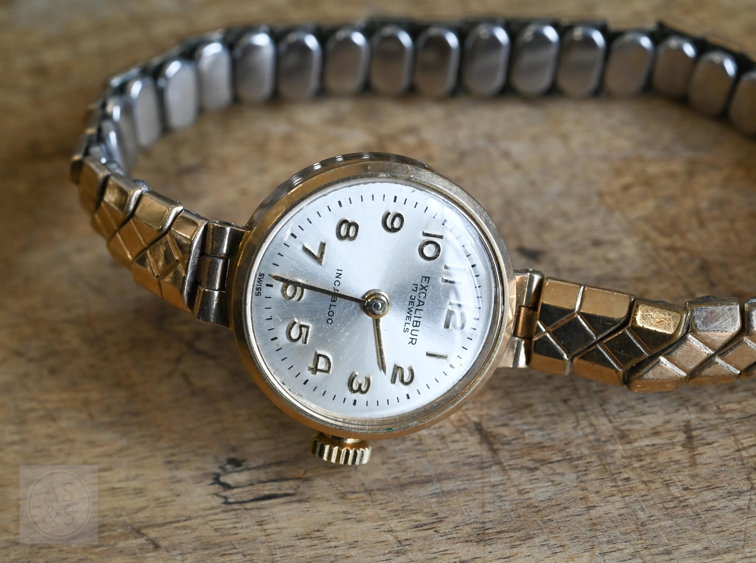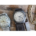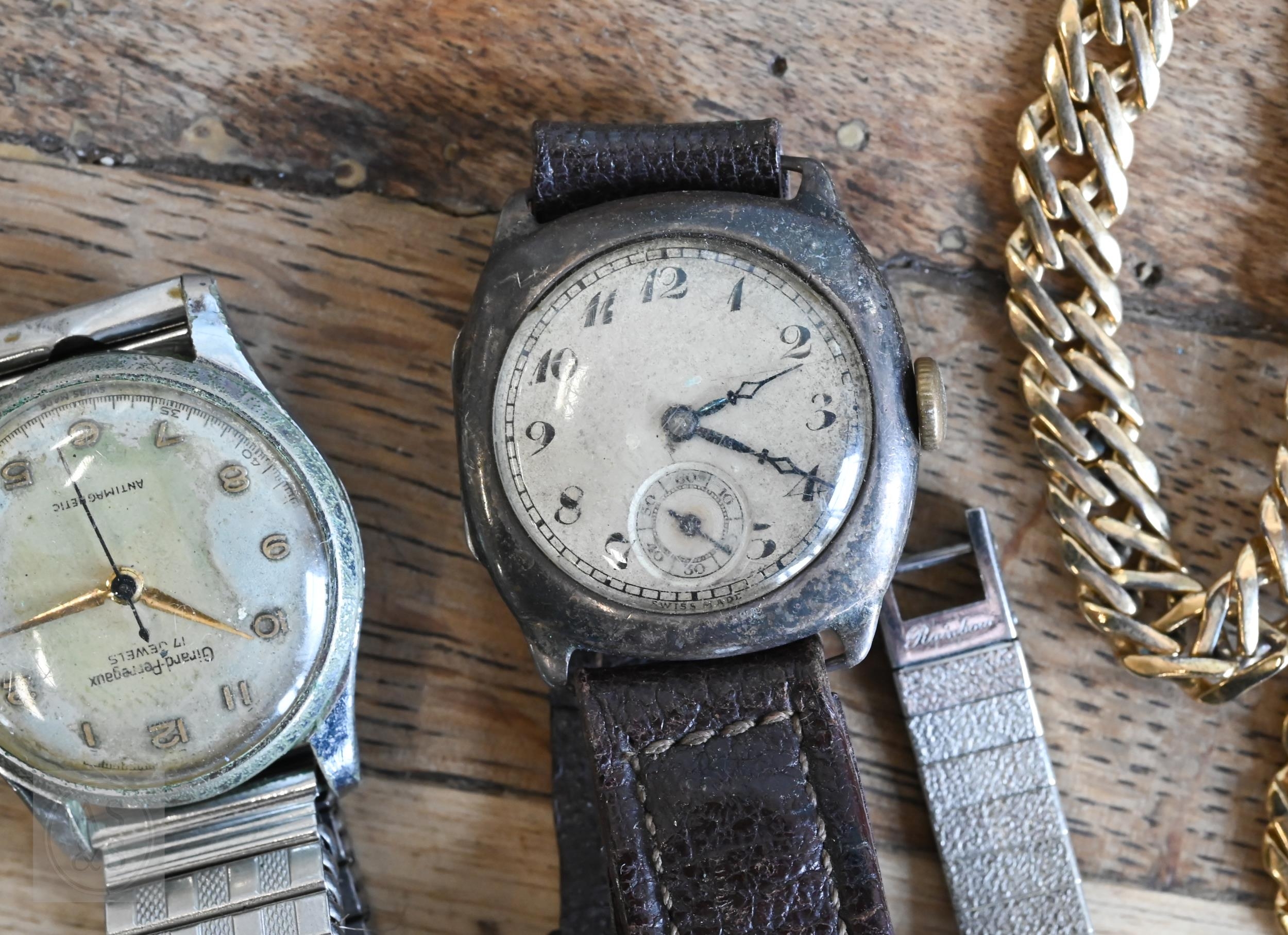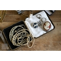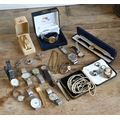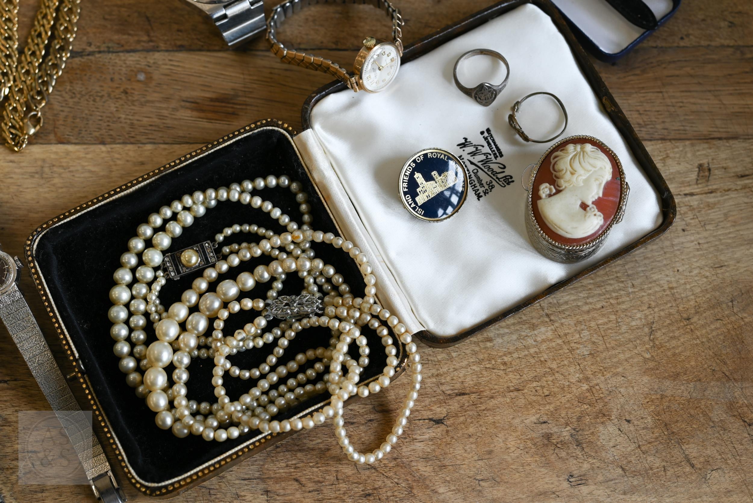 Mixed box of costume jewellery including gilt metal chain, pearls etc and a collection of various ladies and gentleman wristwatches - Tissot, Excalibur, Sekonda etc