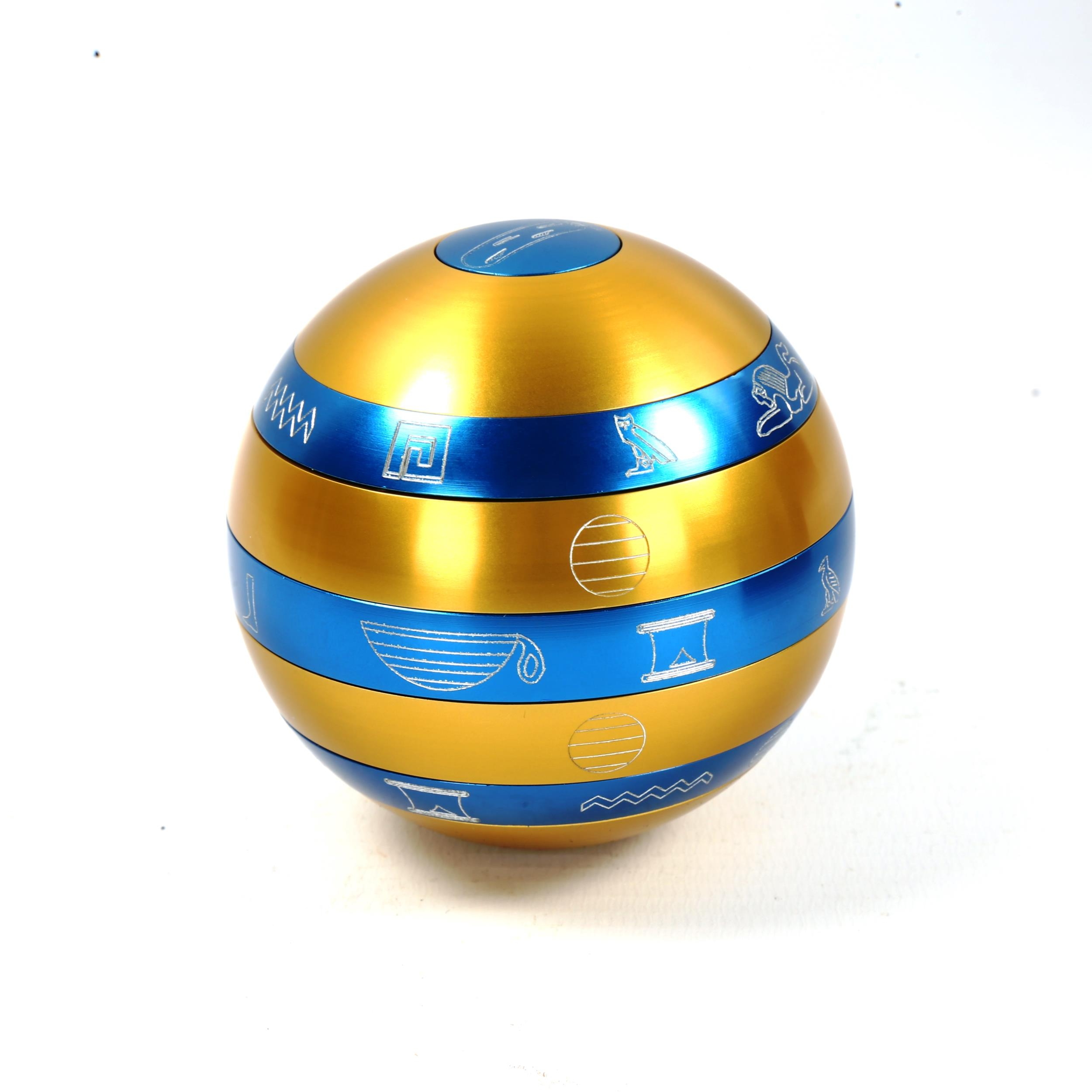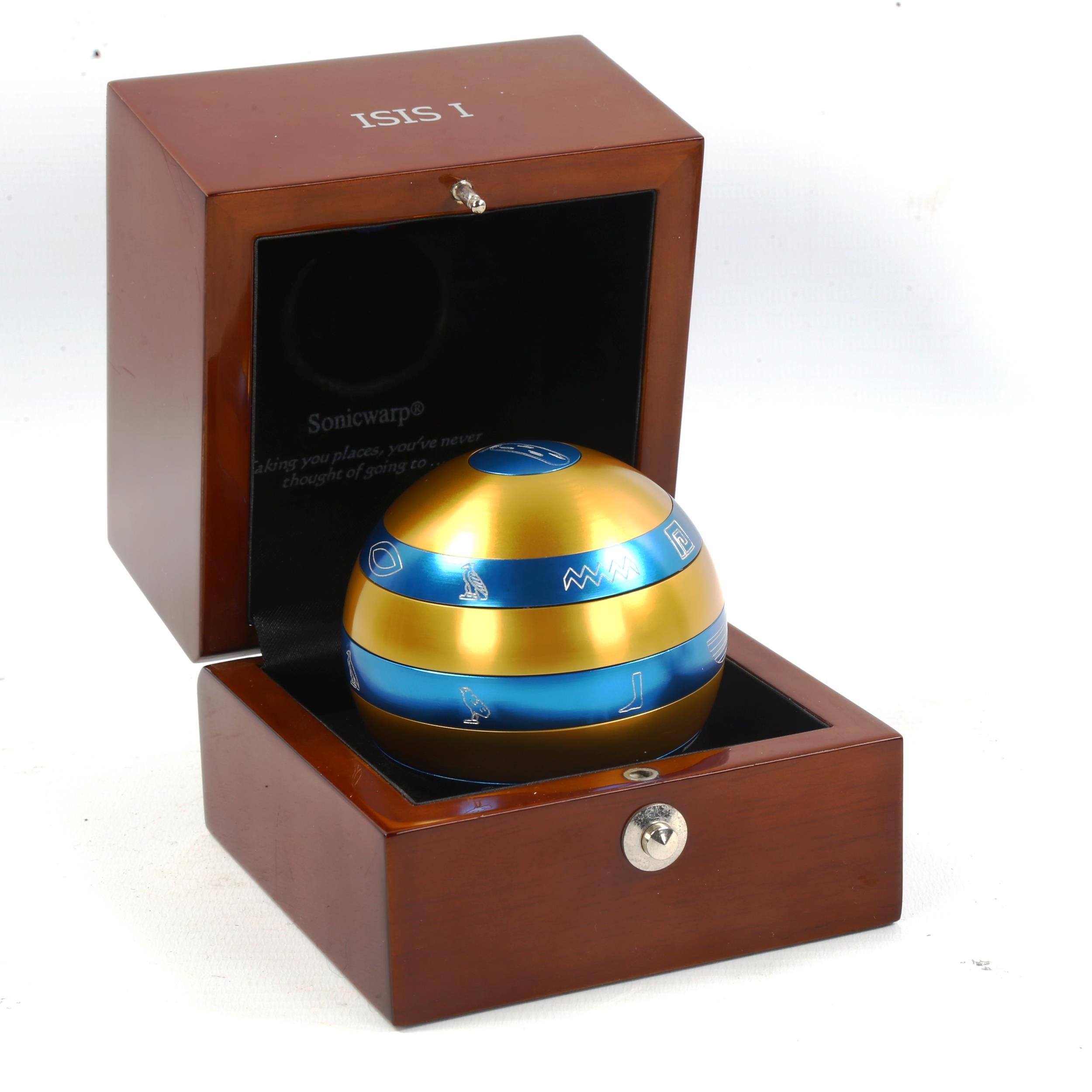 An Isis puzzle ball in original wooden case, diameter 7cm