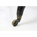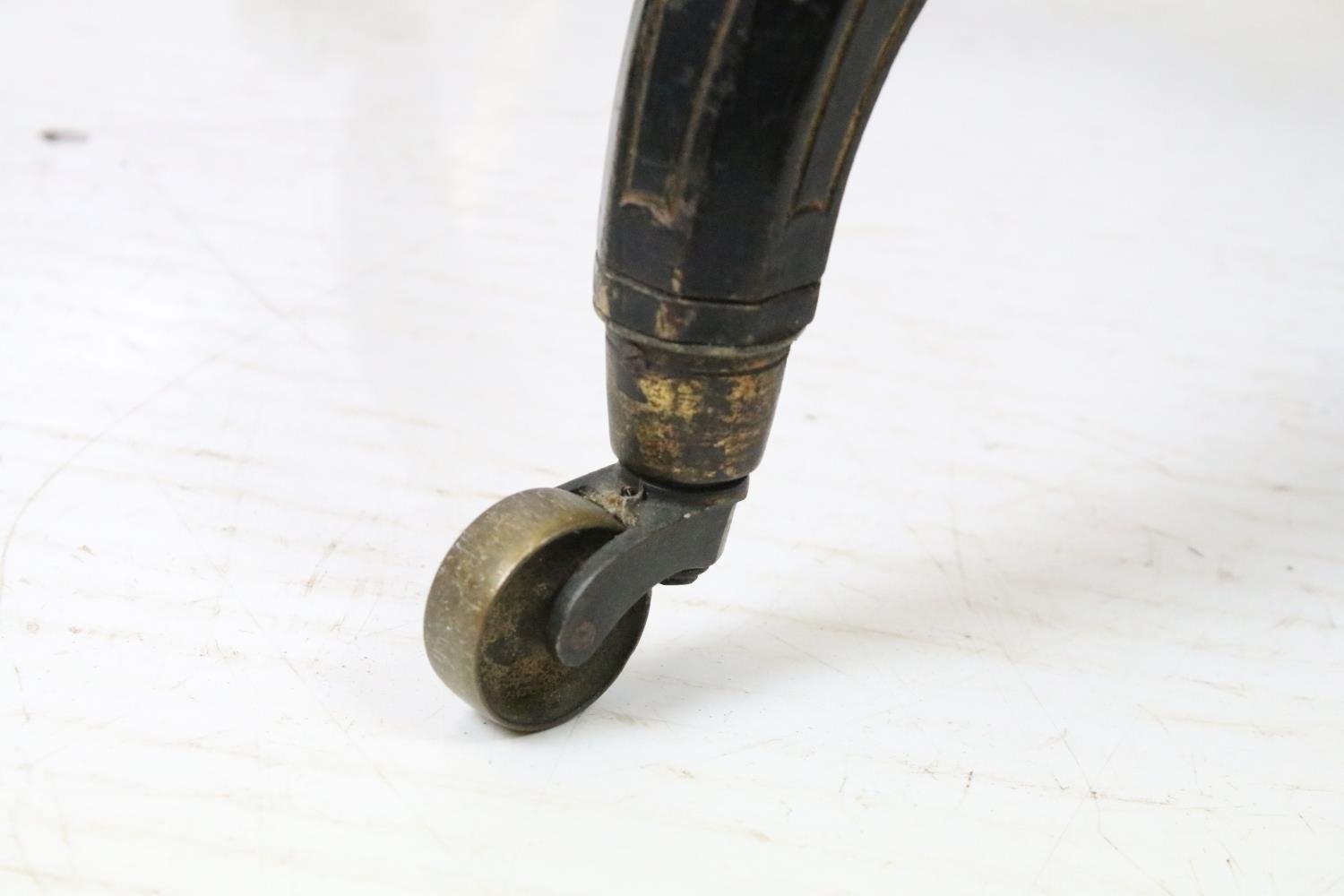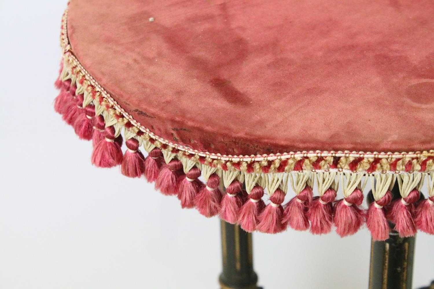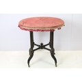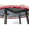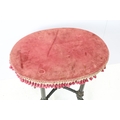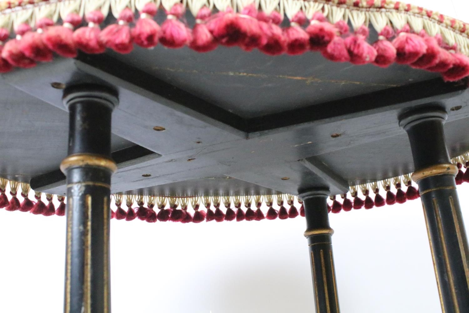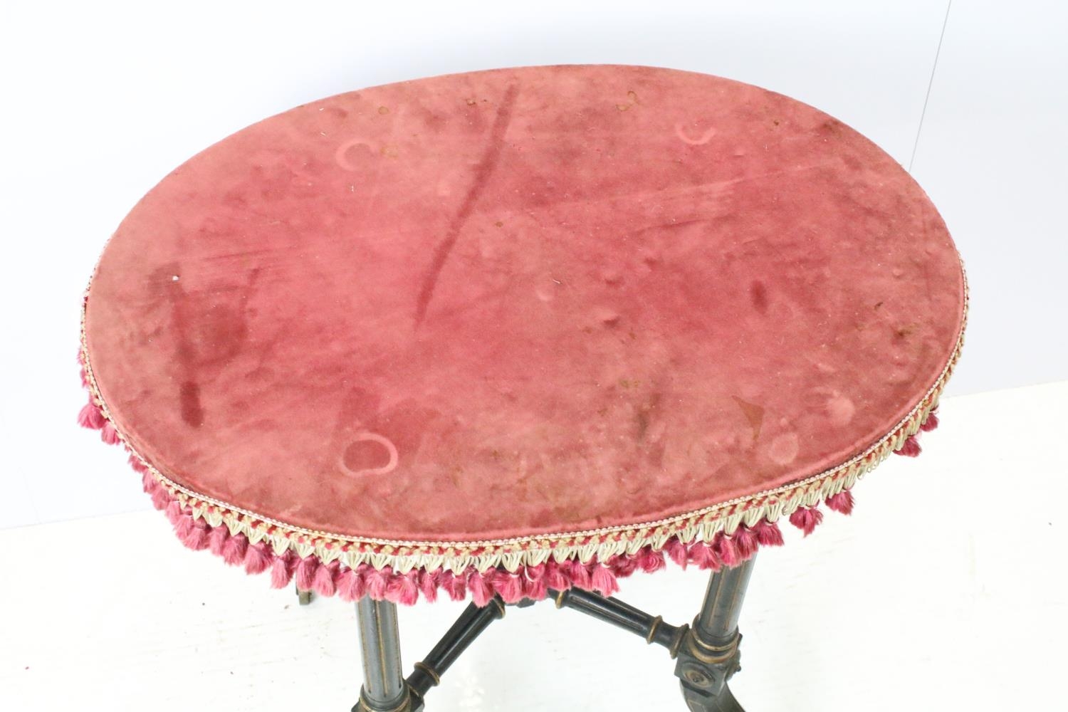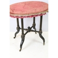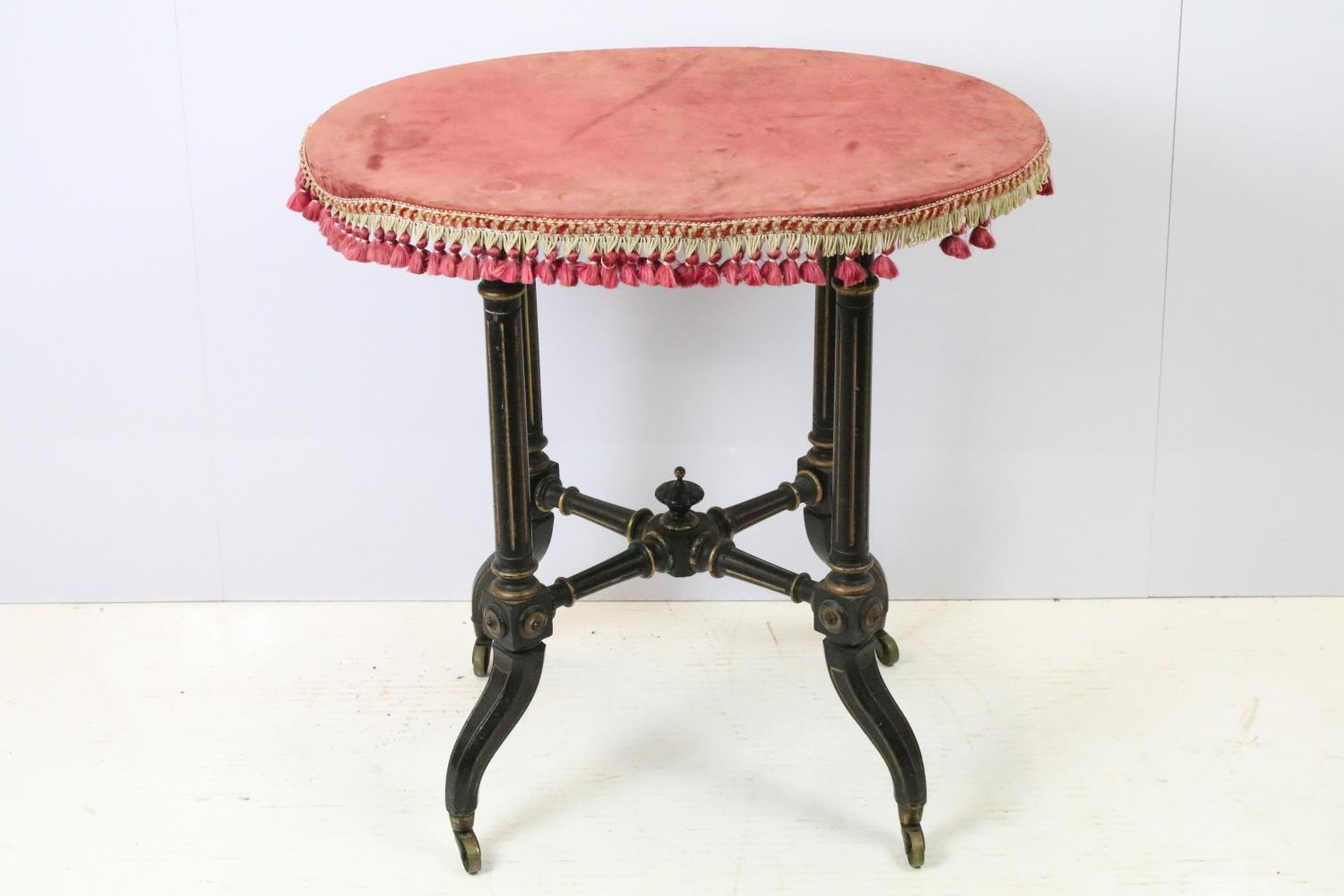 Ebonized occasional table, of x-stretcher form, with fringed velvet covered oval top, on turned curved tapering legs and castors, 64cm high x 64cm wide x 46cm deep
