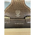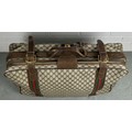 Gucci monogram throughout with brown stitched leather straps, handles and detailing.