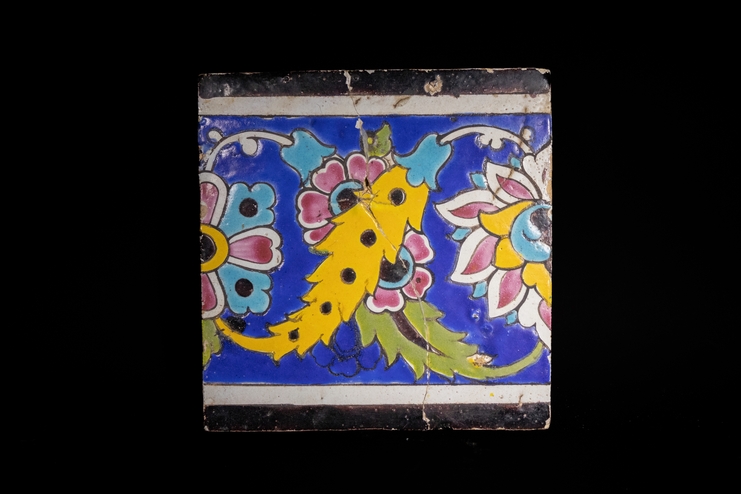A vividly glazed square tile, dating to the 18th century, either from the late Zand or early Qajar period. The composition features a central yellow feather-like motif set against a deep cobalt blue background, flanked by stylised blossoms in pink, turquoise, and white with black detailing. The floral elements are framed by arching vines, all bordered by black and white bands at the top and bottom edges.