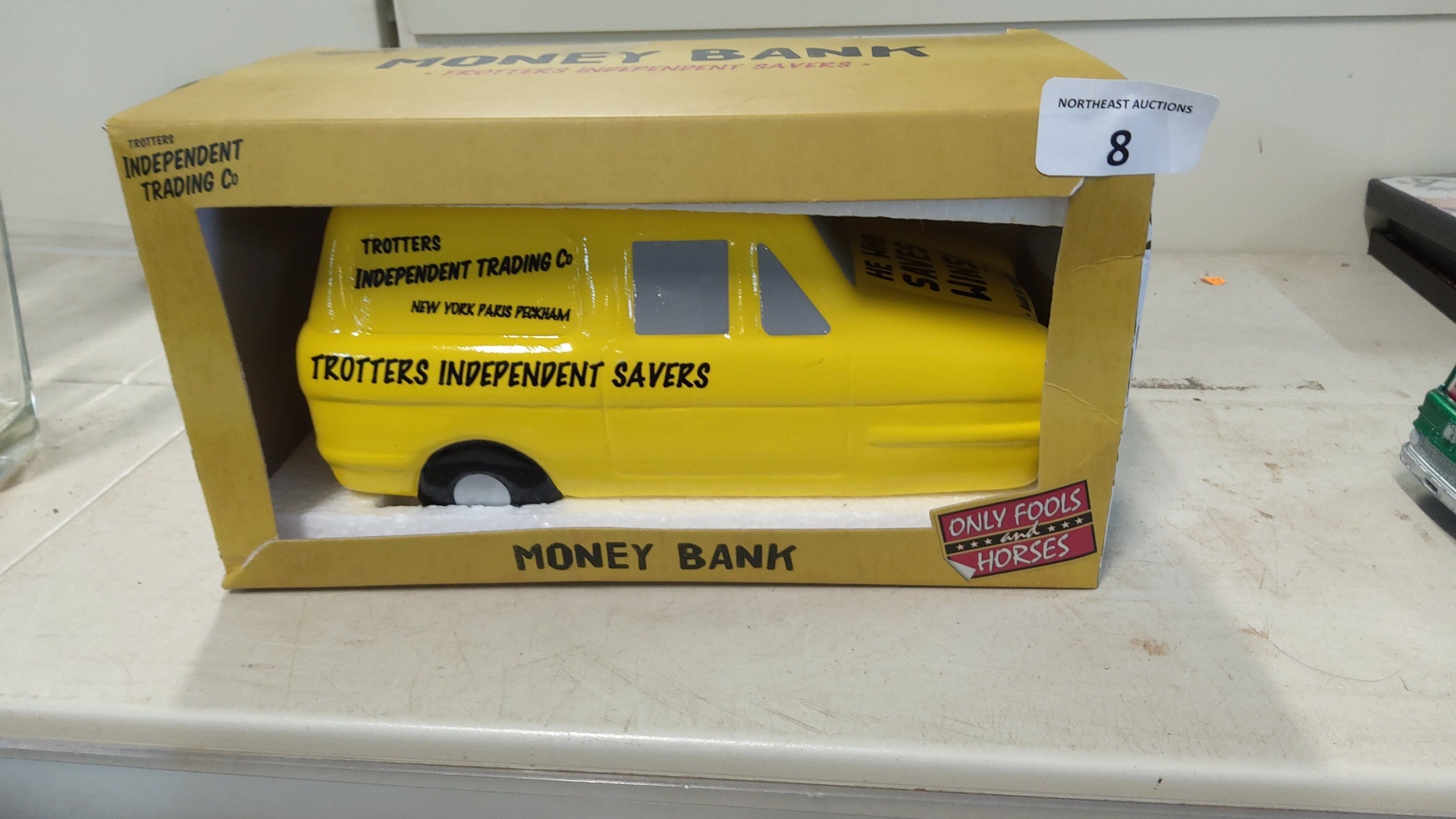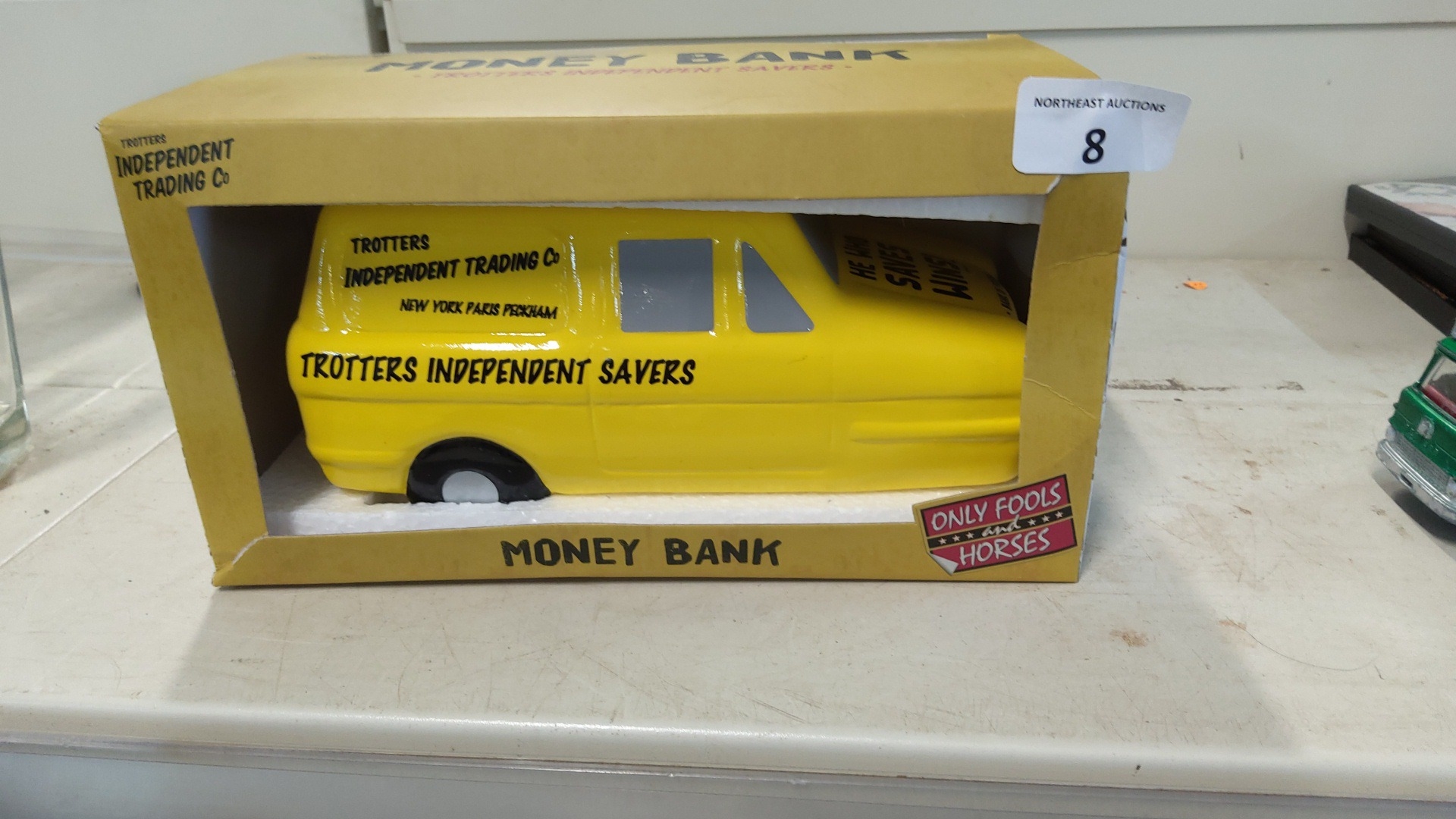 A boxed "Only Fools and Horses" novelty money bank modelled as the yellow "Trotters Independent Trading Co" three-wheeled van, with printed livery and display packaging.