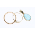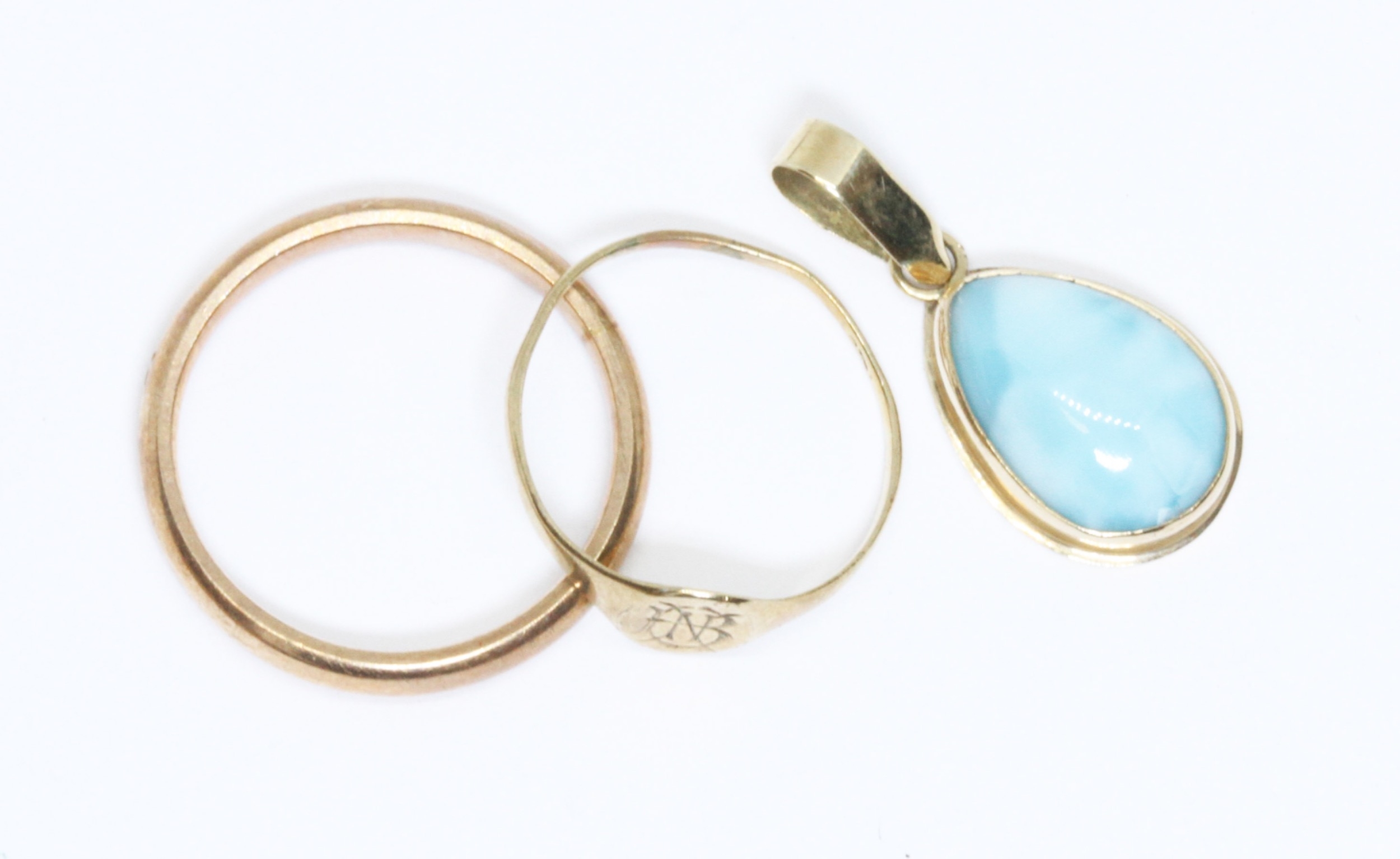 A mixed lot comprising a hallmarked 9ct gold ring and a signet ring indistinctly marked, weight 3g, together with a cabochon pendant marked '14K', weight1.4g.