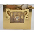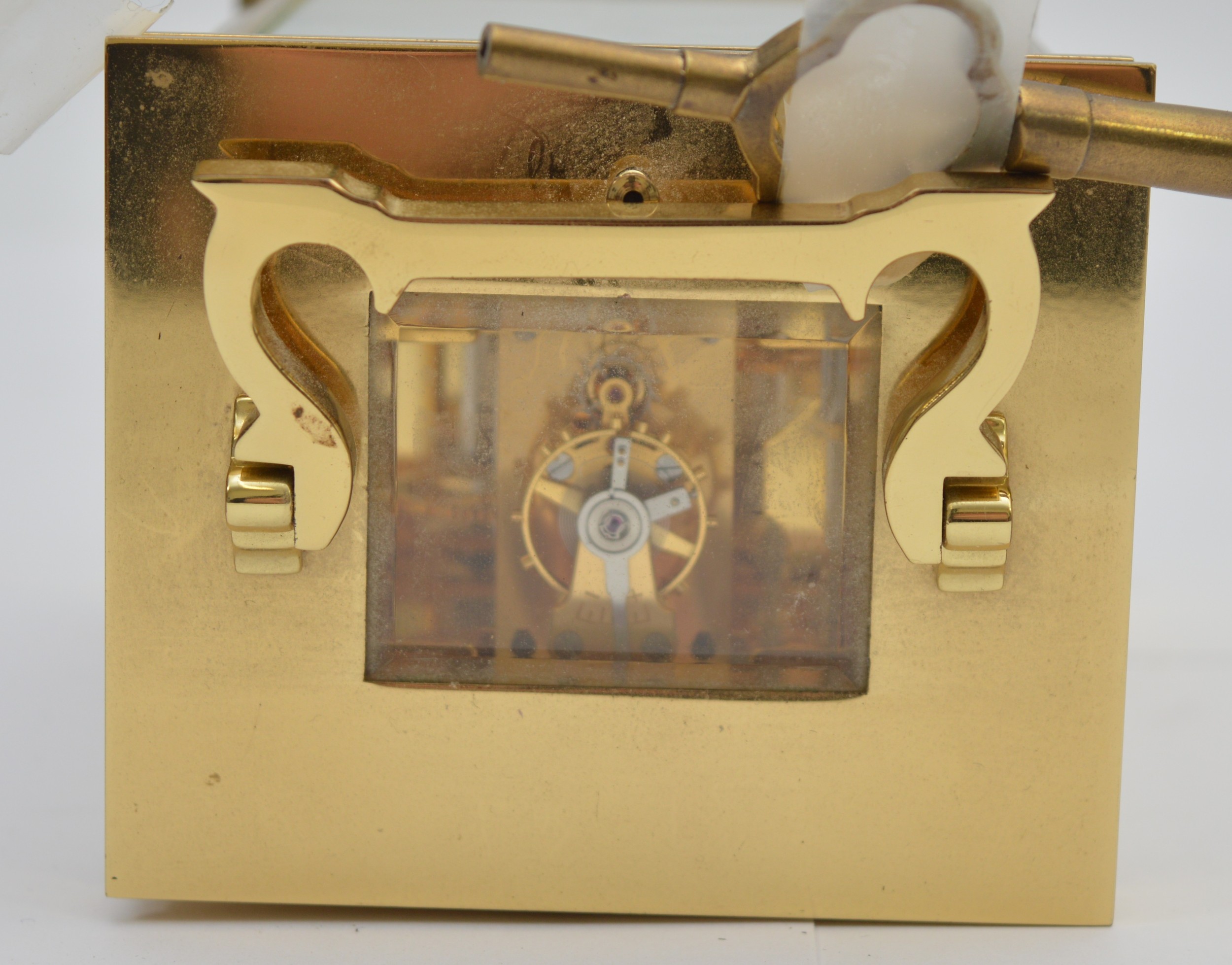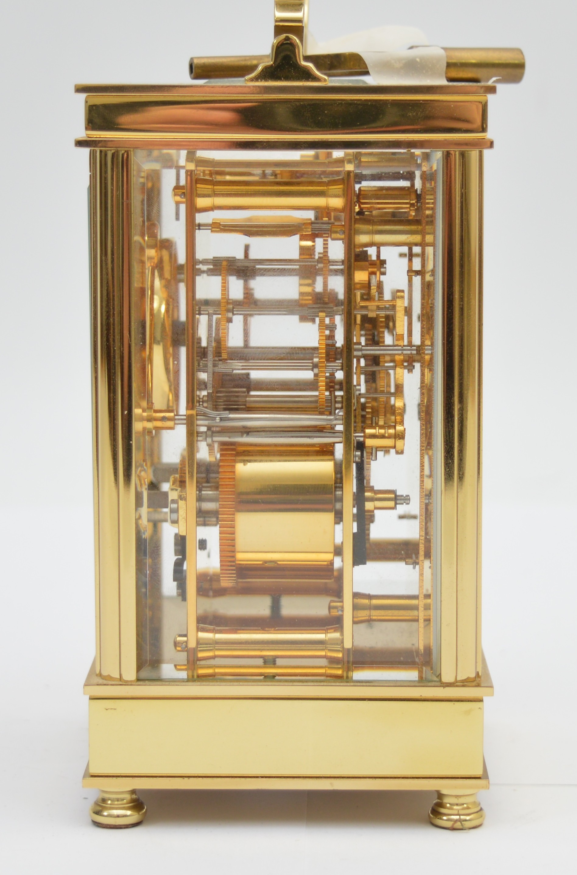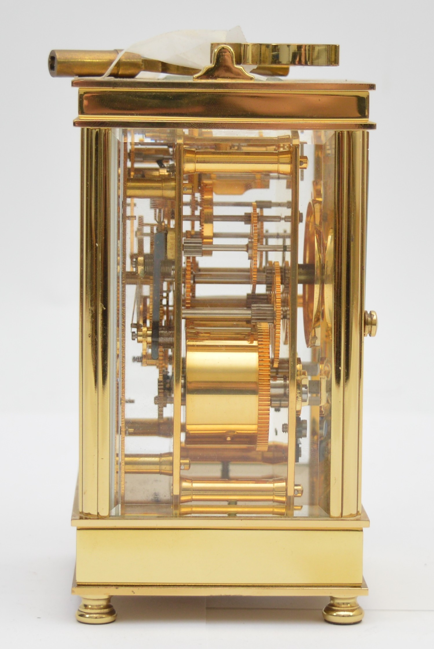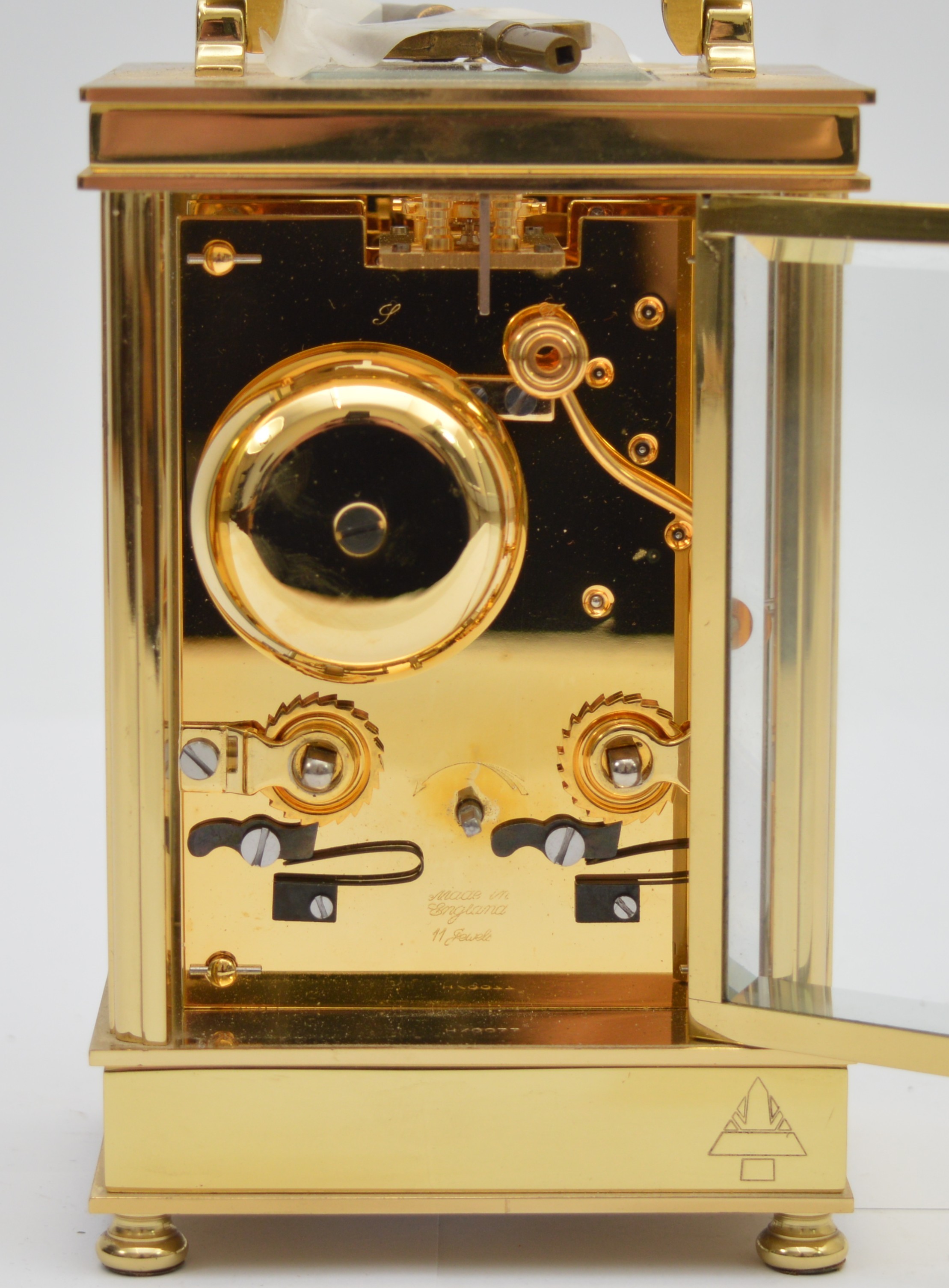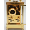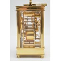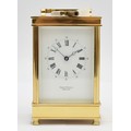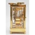 David Peterson, an English brass repeating and striking carriage clock, signed white enamel dial with Roman numerals, the eight day 11 jewel English movement striking the hours and half on a bell, case numbered H/0077, key, 15cm.