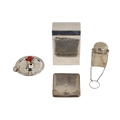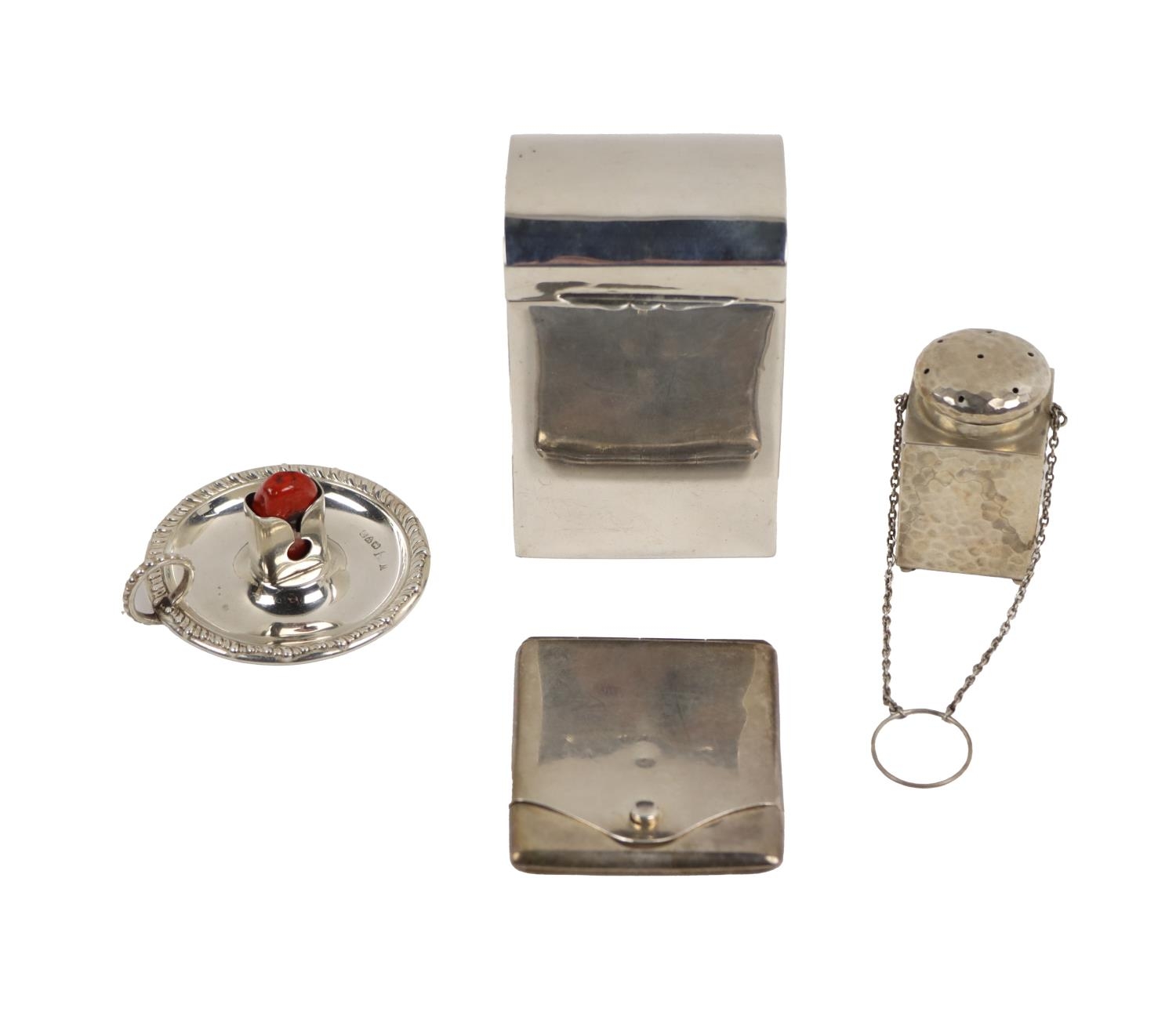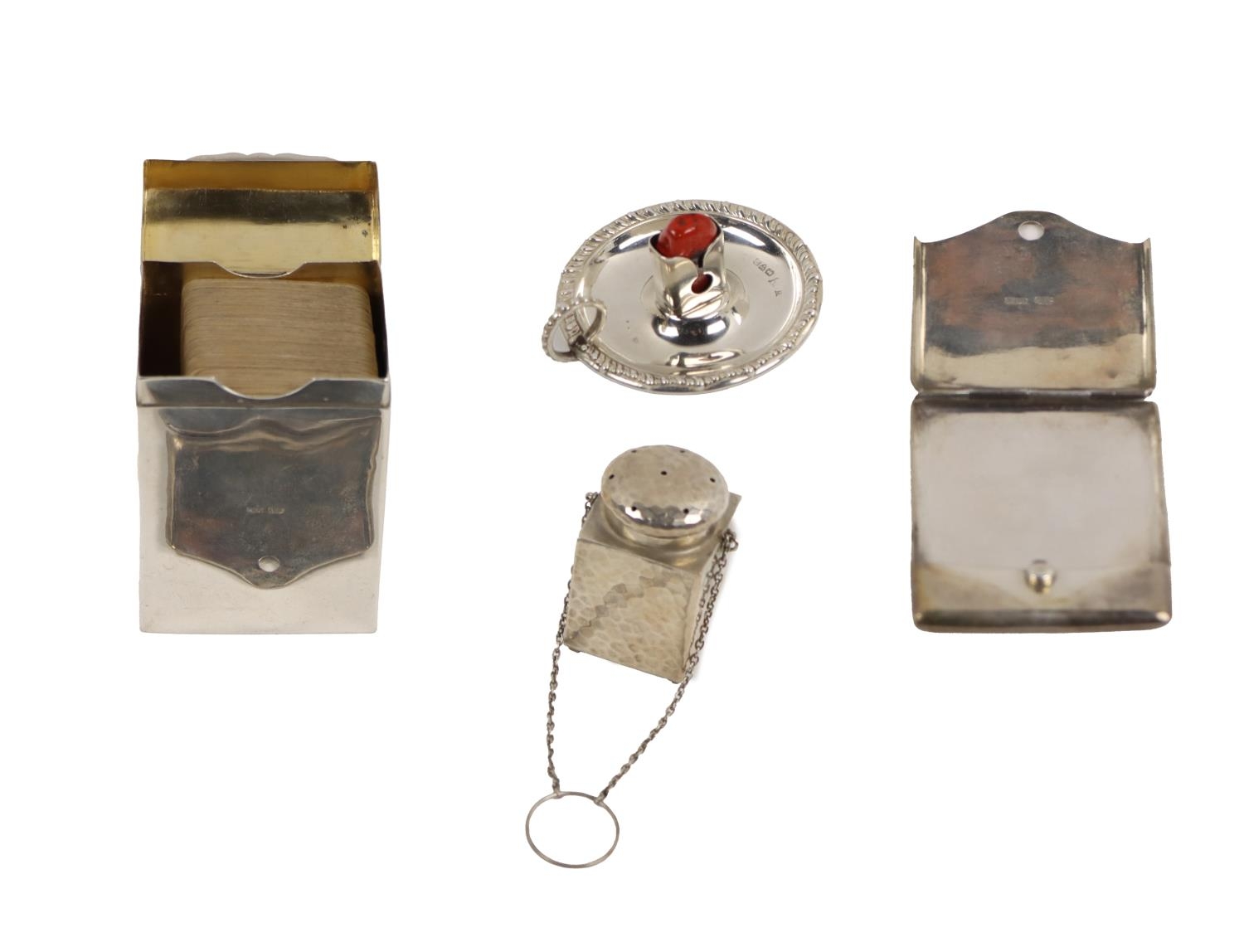 Silverware: An Edwardian silver Bridge turn deck Playing Cards Box, Chester, Nathan & Hayes 1900, approx. 3.2 ounces; an American Sterling silver Pepper Shaker' designed as Tea Holder; an early 20th Century Chinese silver Match Book Holder, Wang Hing, 1920; an early 20th Century English silver Wax Holder, Chester, J. Denham & Sons, 1902, as a lot. (4)