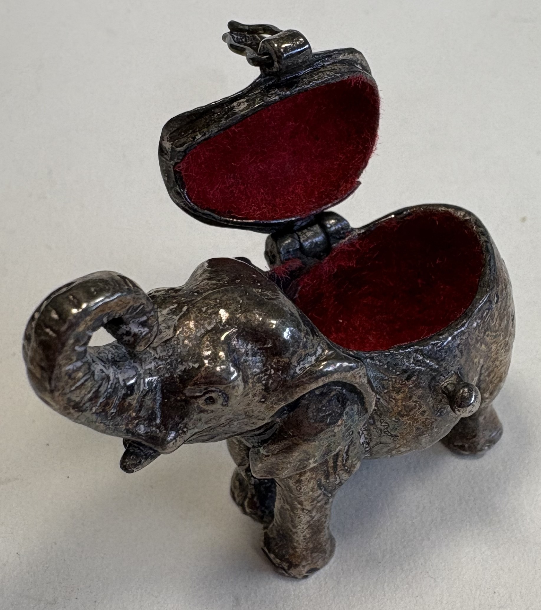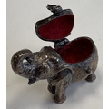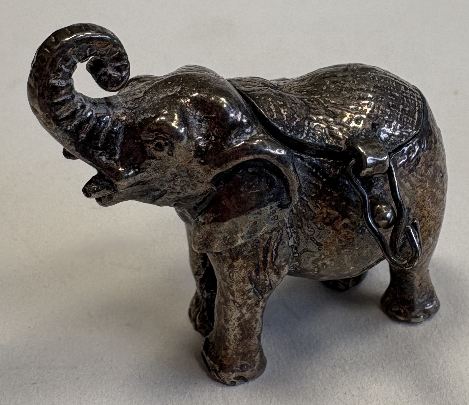 A small silver pill box in the form of an elephant with hinged cover. Approx. 43 grams. Est. £60 - £80.
