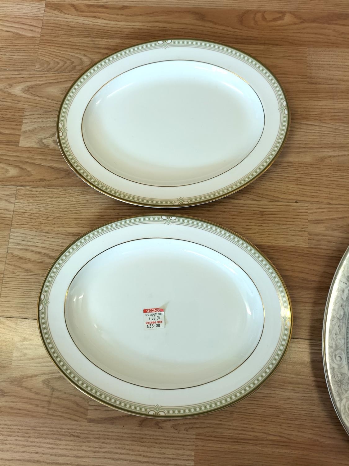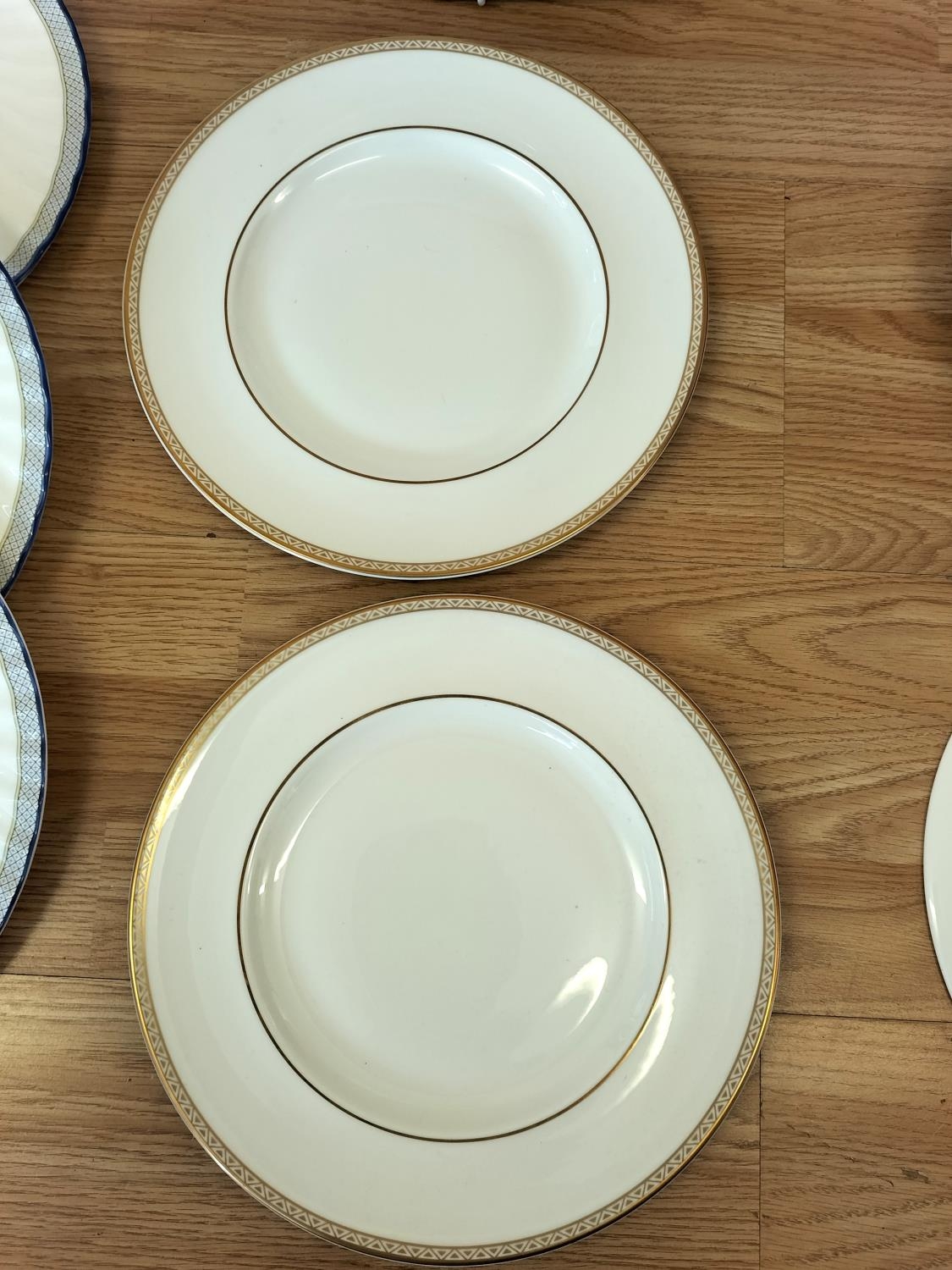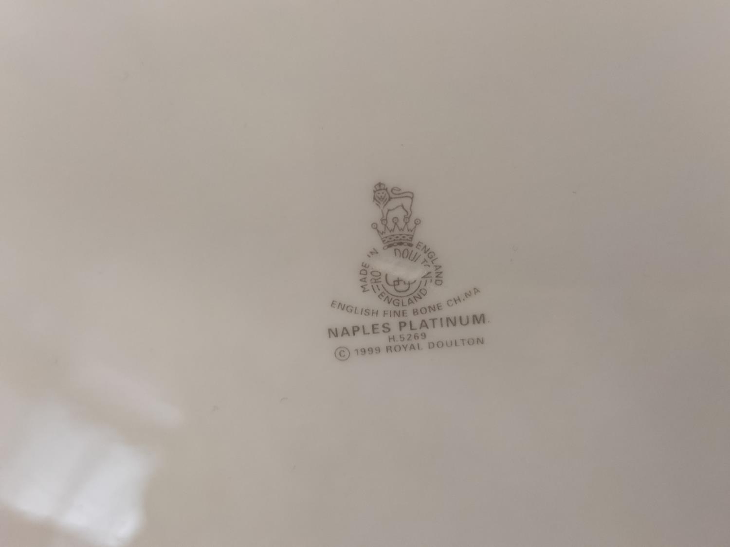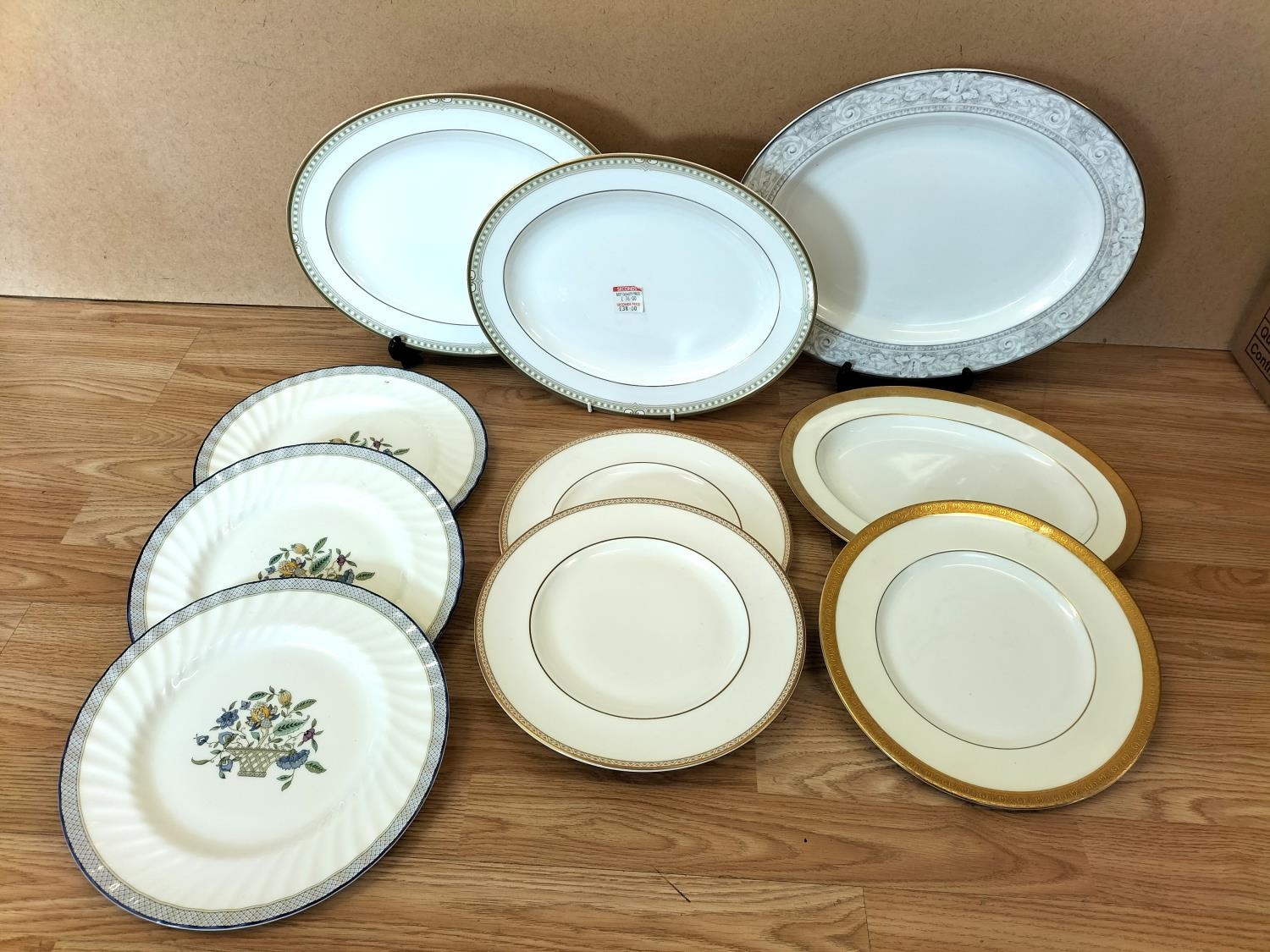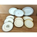 Collection of China Platters and Dinner Plates to include Minton 'Haddon Hall Trellis Blue', Minton 'Buckingham', Royal Doulton 'Henley' (2nds), 'Naples Platinum' (2nds) and 'Lichfield' (2nds).