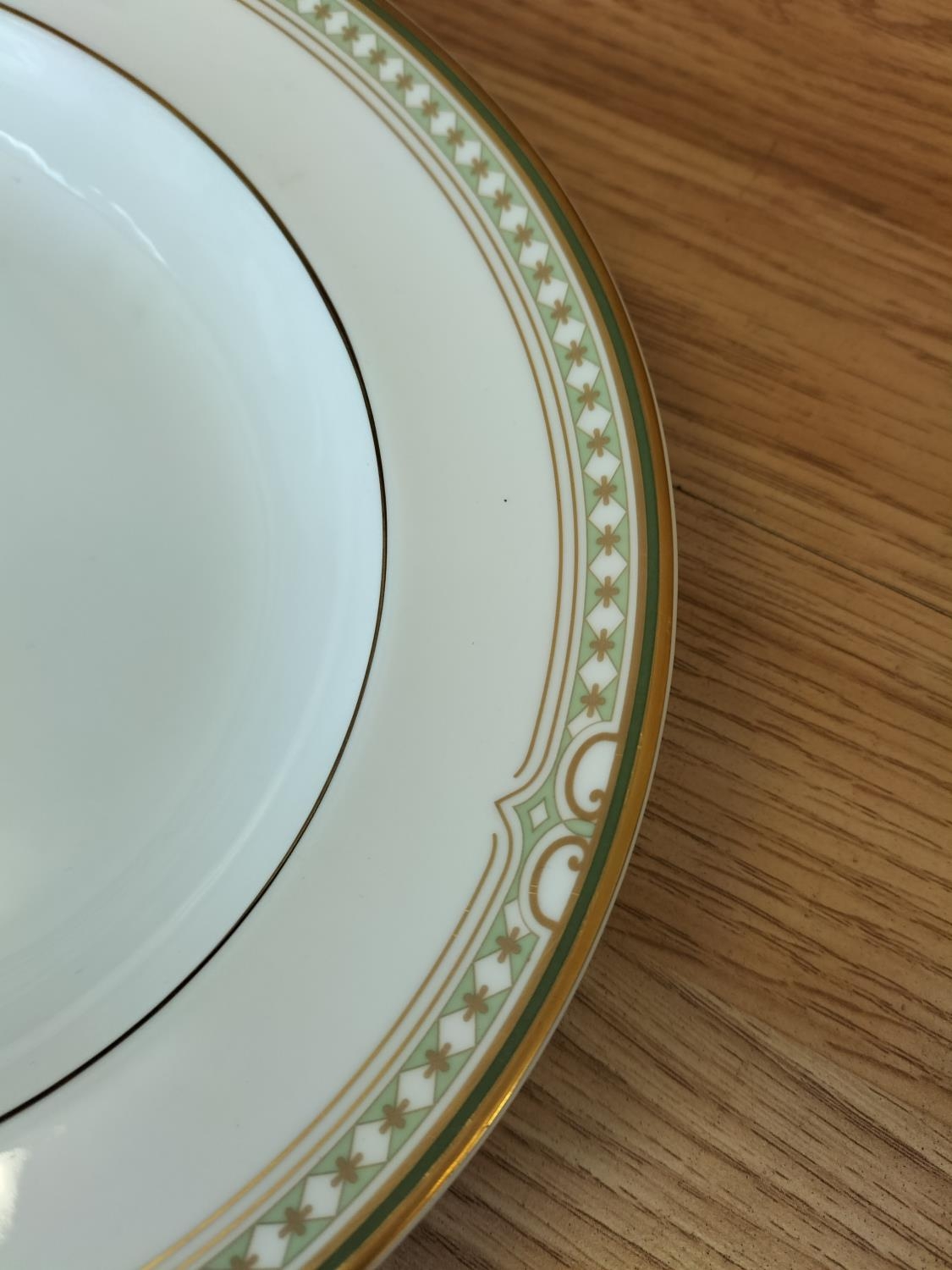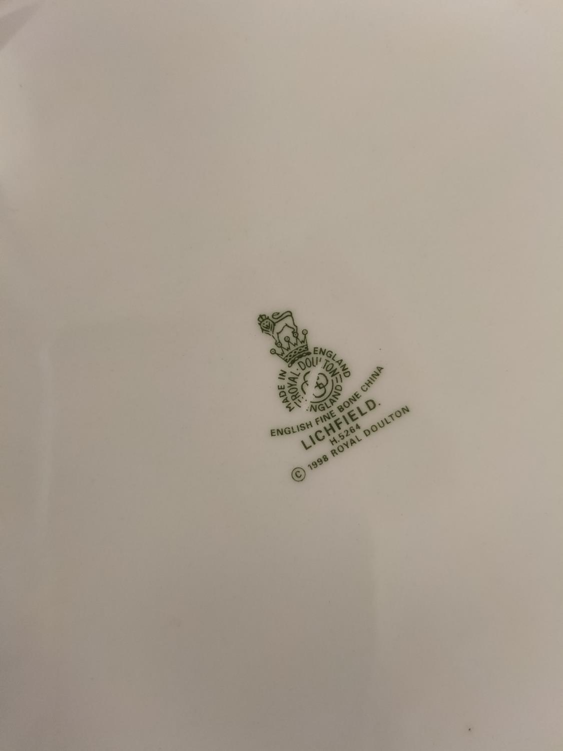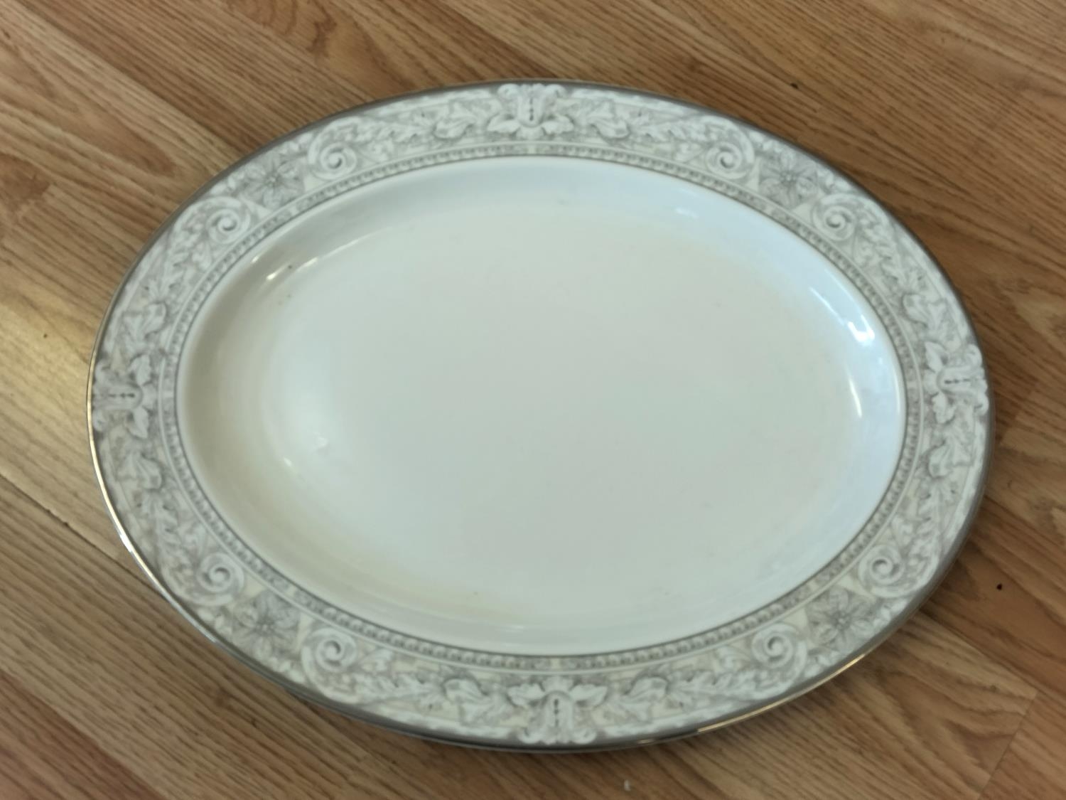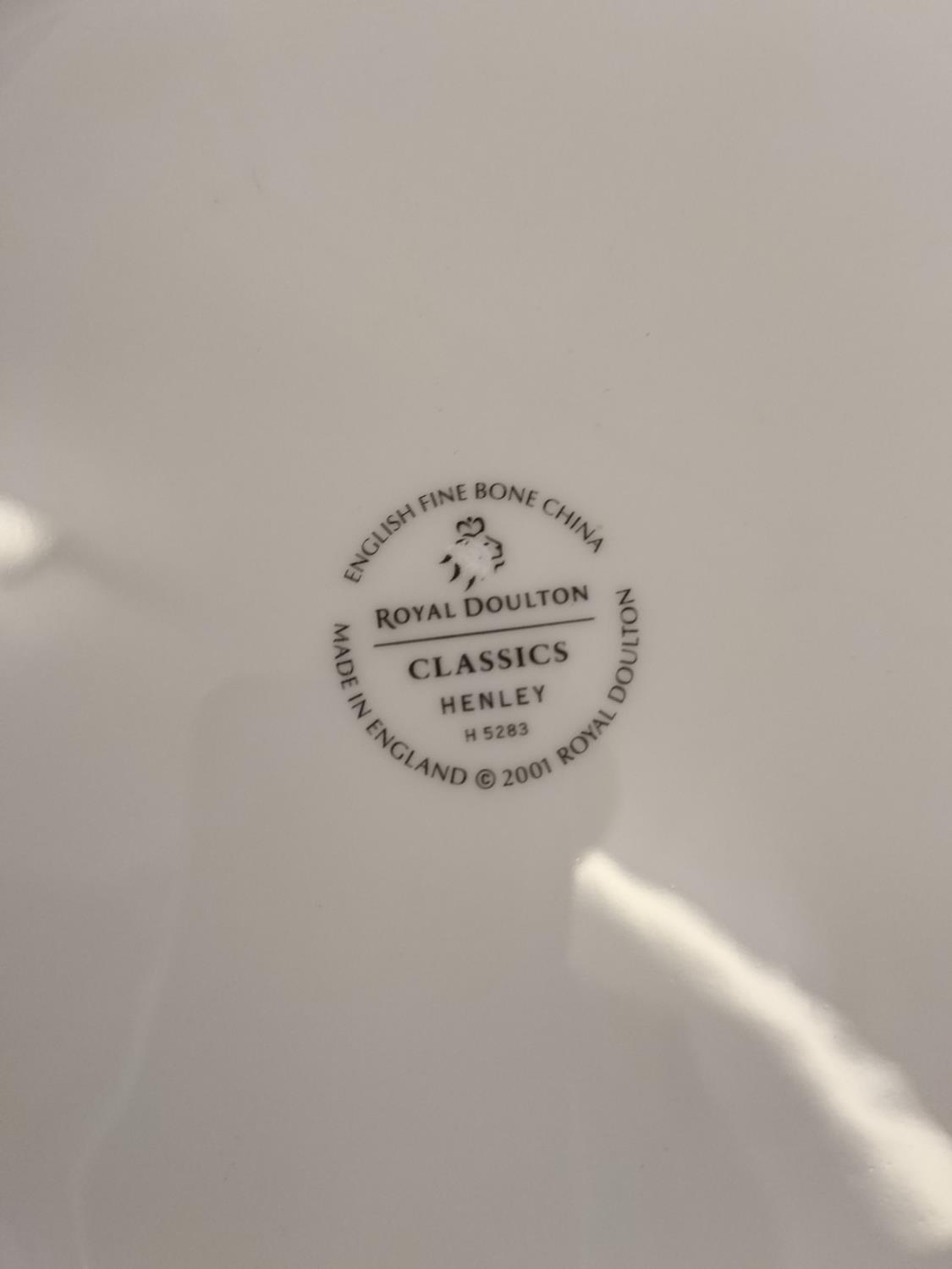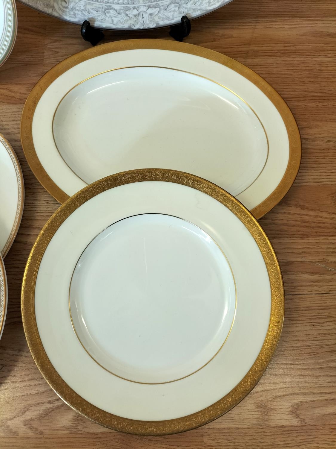 Collection of China Platters and Dinner Plates to include Minton 'Haddon Hall Trellis Blue', Minton 'Buckingham', Royal Doulton 'Henley' (2nds), 'Naples Platinum' (2nds) and 'Lichfield' (2nds).
