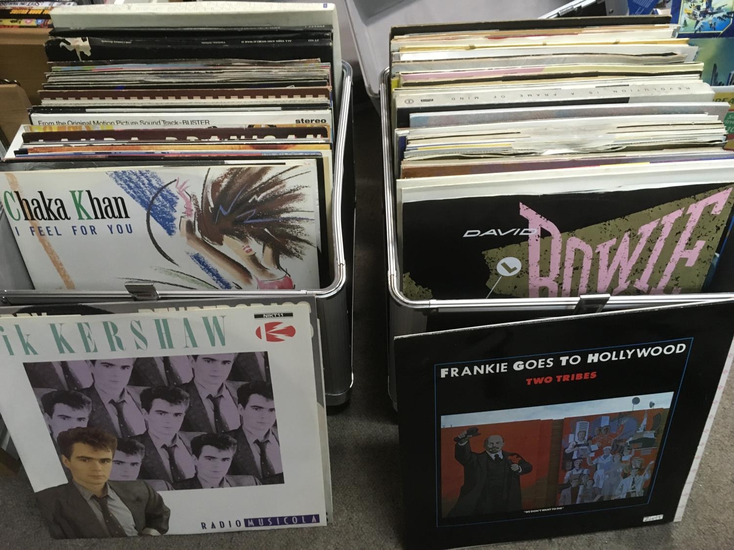 Two record cases of LPs and 12 inch singles by various artists including David Bowie, Pet Shop Boys, Dead Or Alive and others.