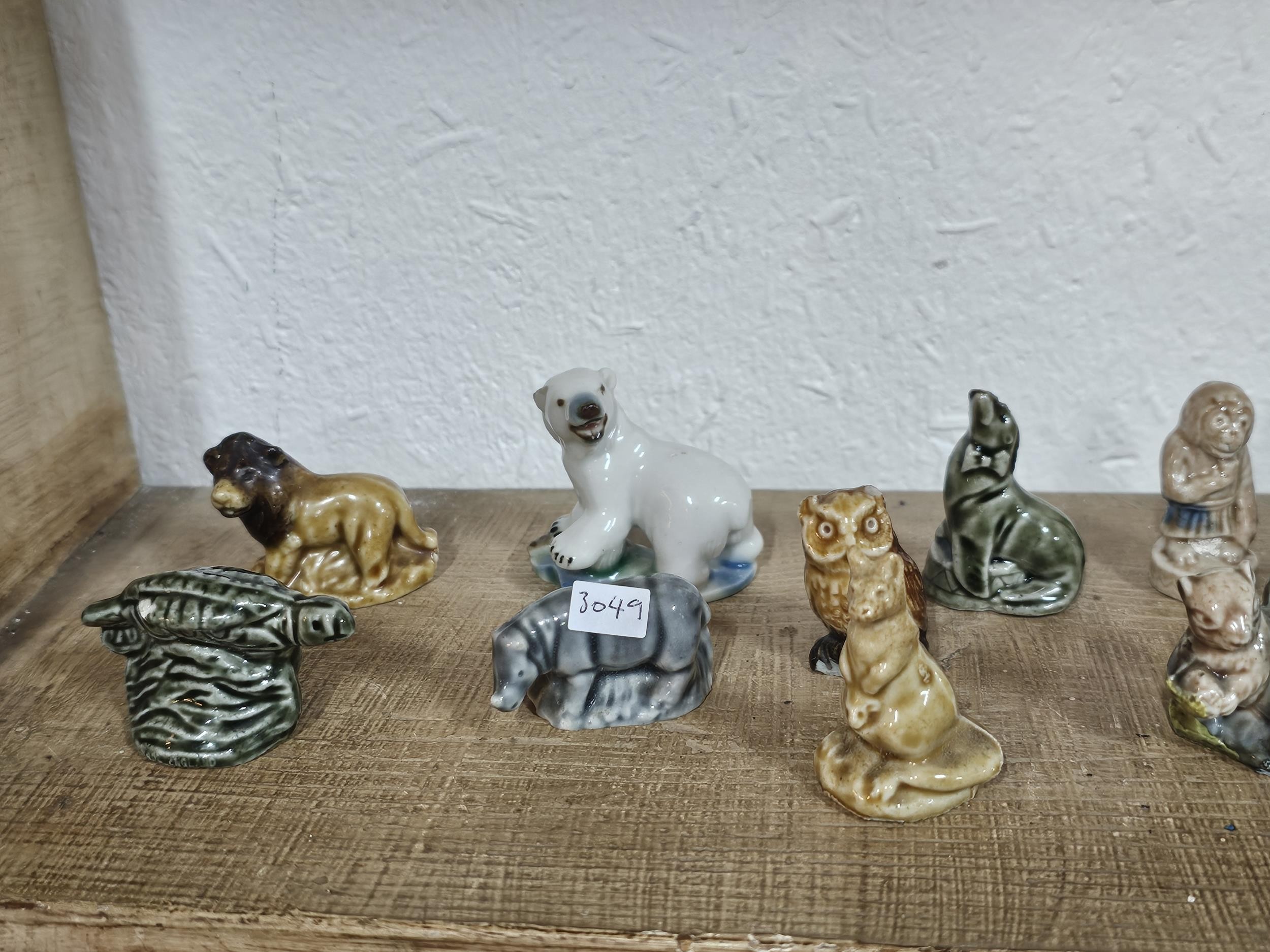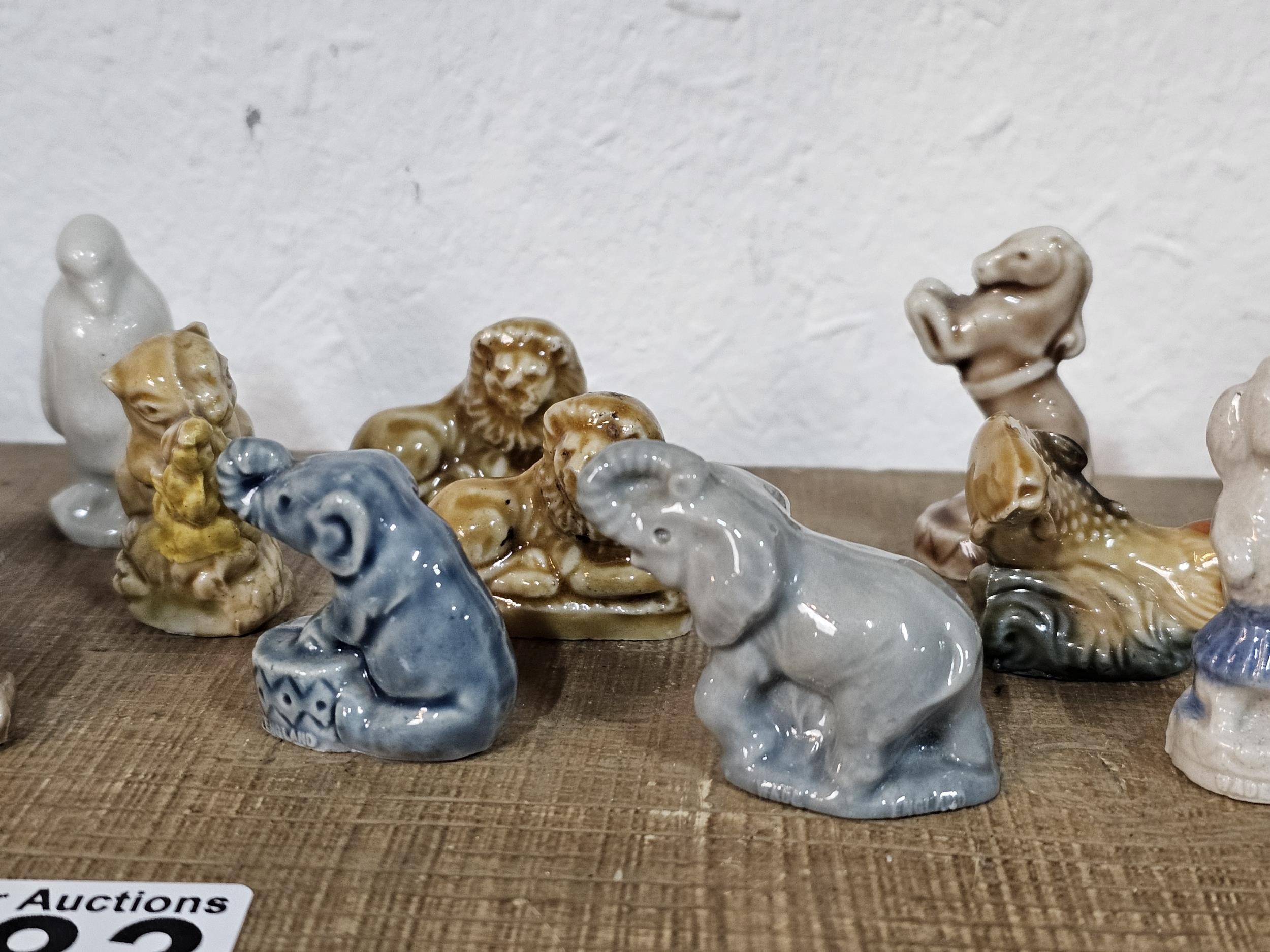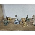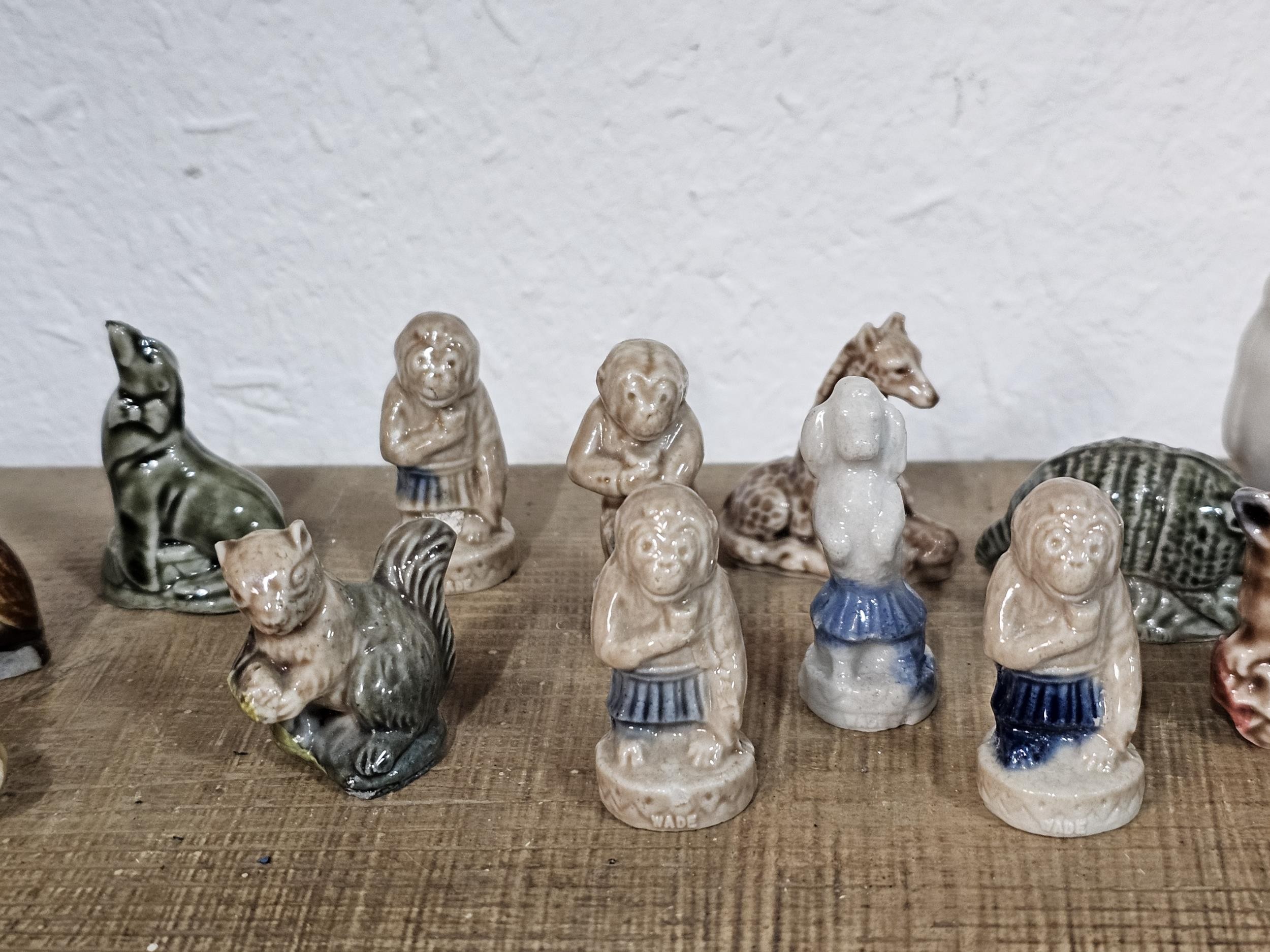 A collection of 25 Wade Whimsies covering a selection of different animals to include chimpanzees, poodles, kangaroo turtle, bush baby, rearing horse, along with 3 additional animal figurines which are unmarked to include a begging dog, an owl and a teddy bear with a bouquet of flowers. All the pieces appear to be in good condition with the exception of the turtle which has a chip to its flipper.