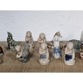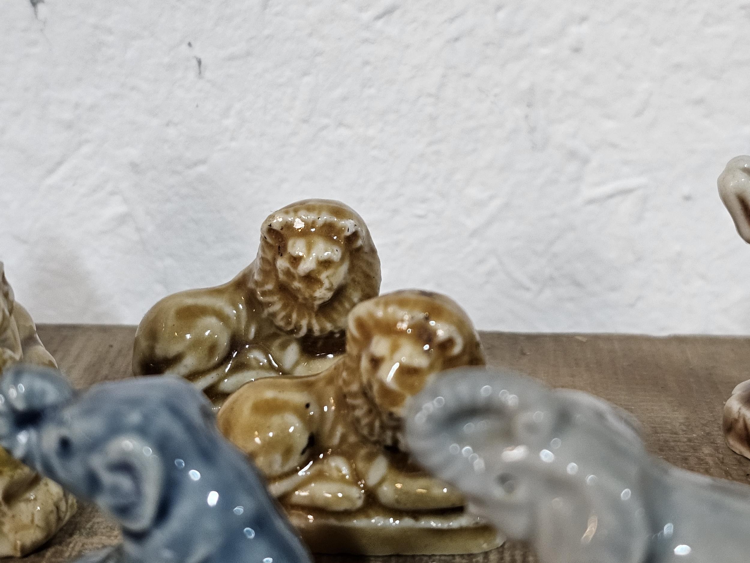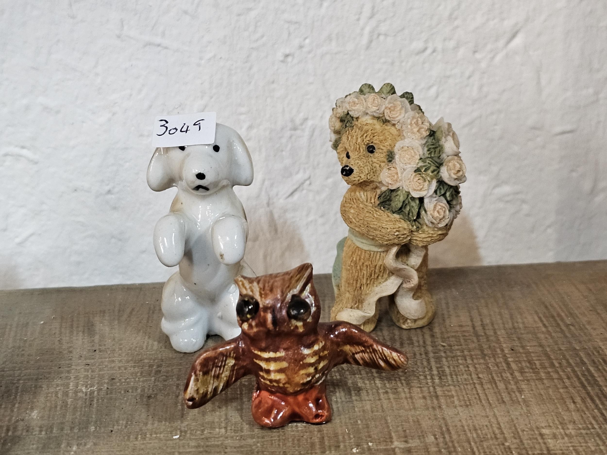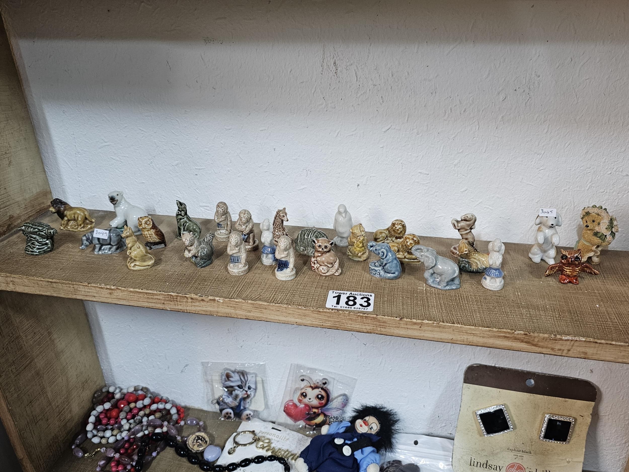 A collection of 25 Wade Whimsies covering a selection of different animals to include chimpanzees, poodles, kangaroo turtle, bush baby, rearing horse, along with 3 additional animal figurines which are unmarked to include a begging dog, an owl and a teddy bear with a bouquet of flowers. All the pieces appear to be in good condition with the exception of the turtle which has a chip to its flipper.