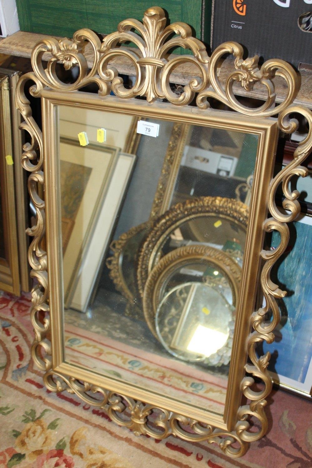 A REPRODUCTION GILT PIERCED FRAMED WALL MIRROR OVERALL SIZE - 90CM X 57CM