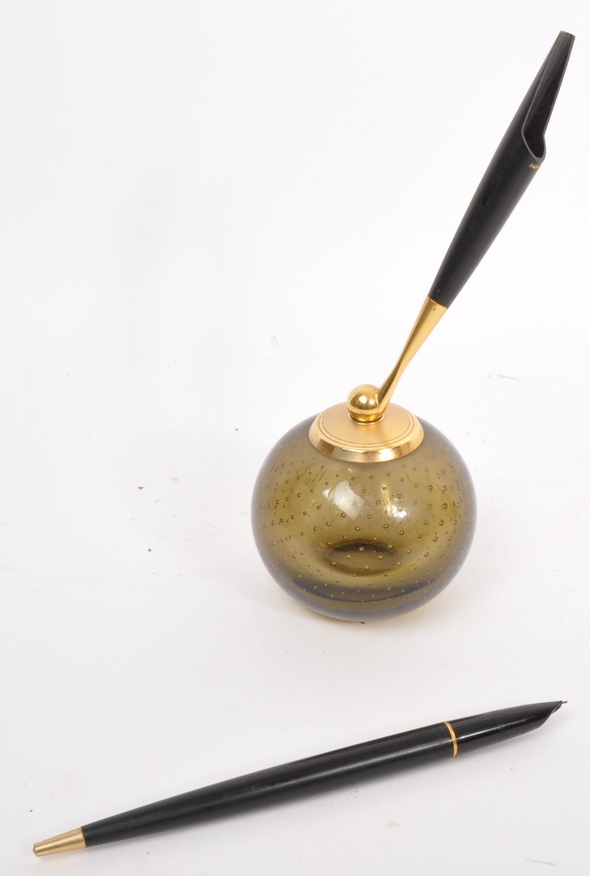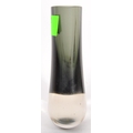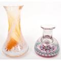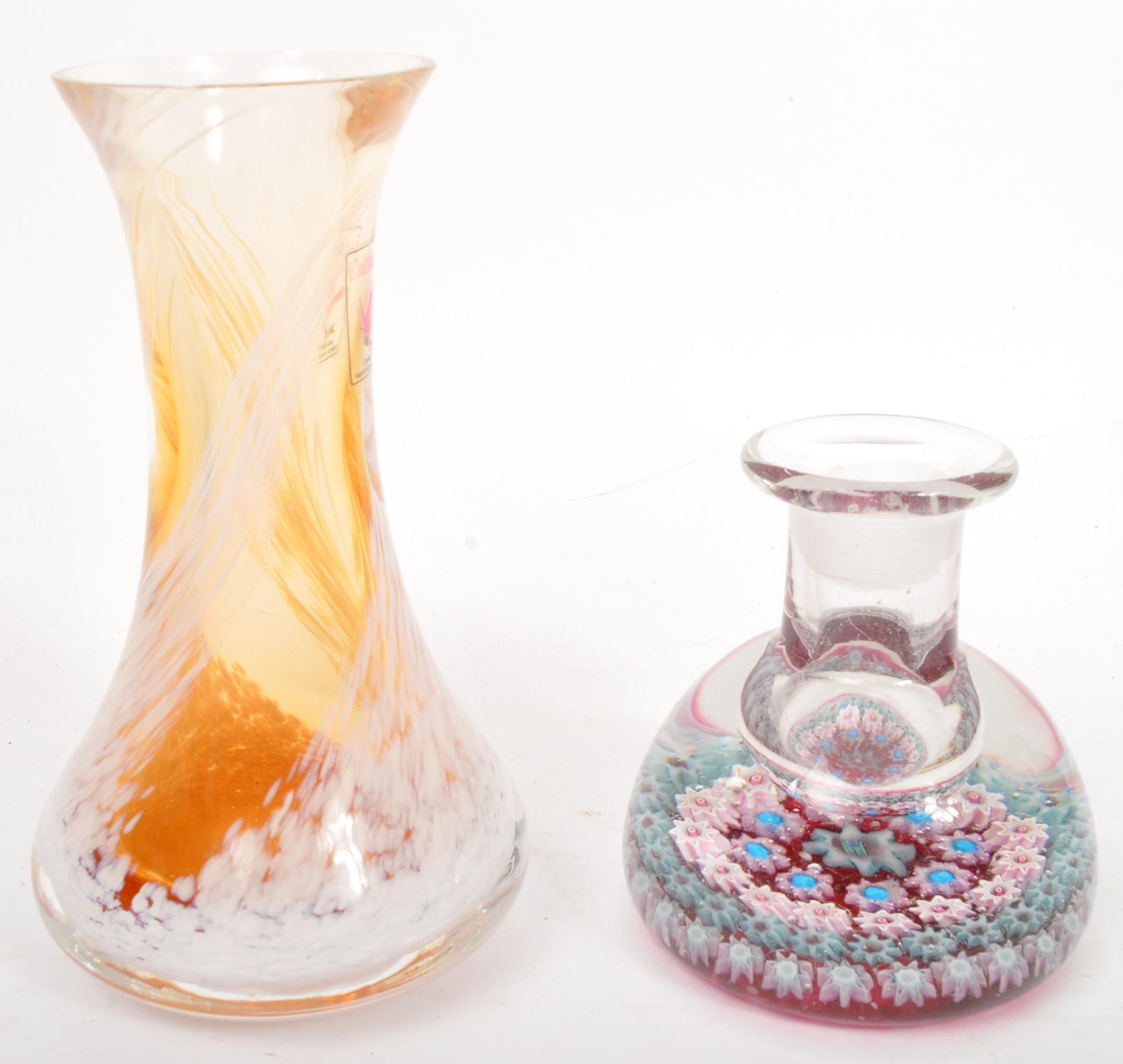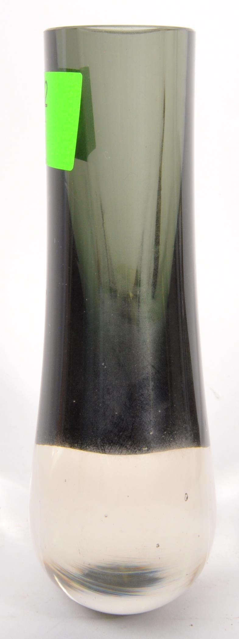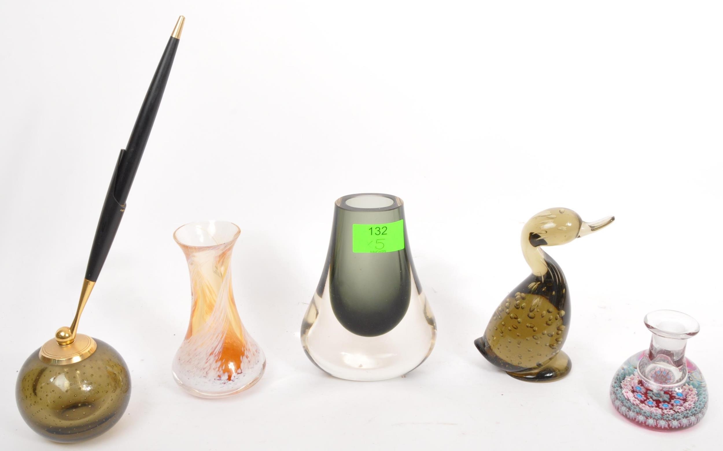 A collection of five vintage retro mid 20th Century art glass pieces. Lot consists of; Whitefriars control bubble pen holder / paperweight in a pewter colourway with original Parker Pen. Controlled Bubble Dilly Duck Twilight by Whitefriars in a pewter colourway, teardrop vase by Whitefriars in a willow grey colourway, crystal glass bud vase by Caithness in an amber colourway and a millefiori bud vase / paperweight by Perthshire glass. Largest measures 29cm (height).