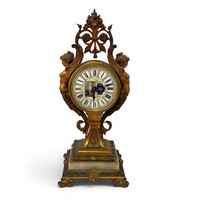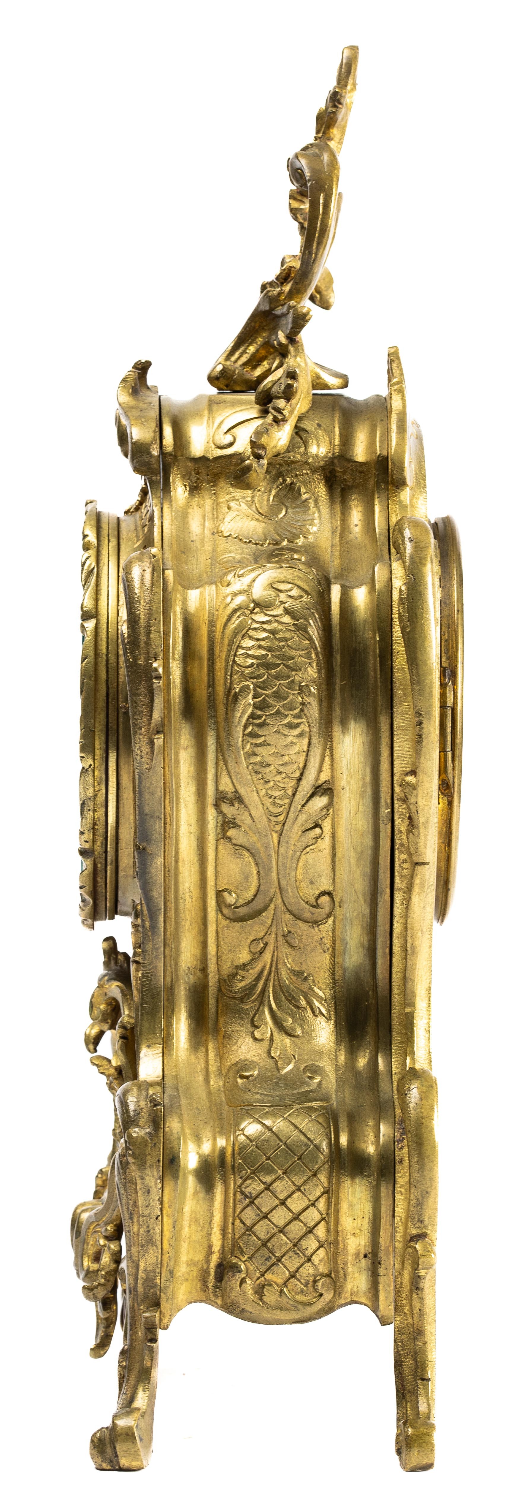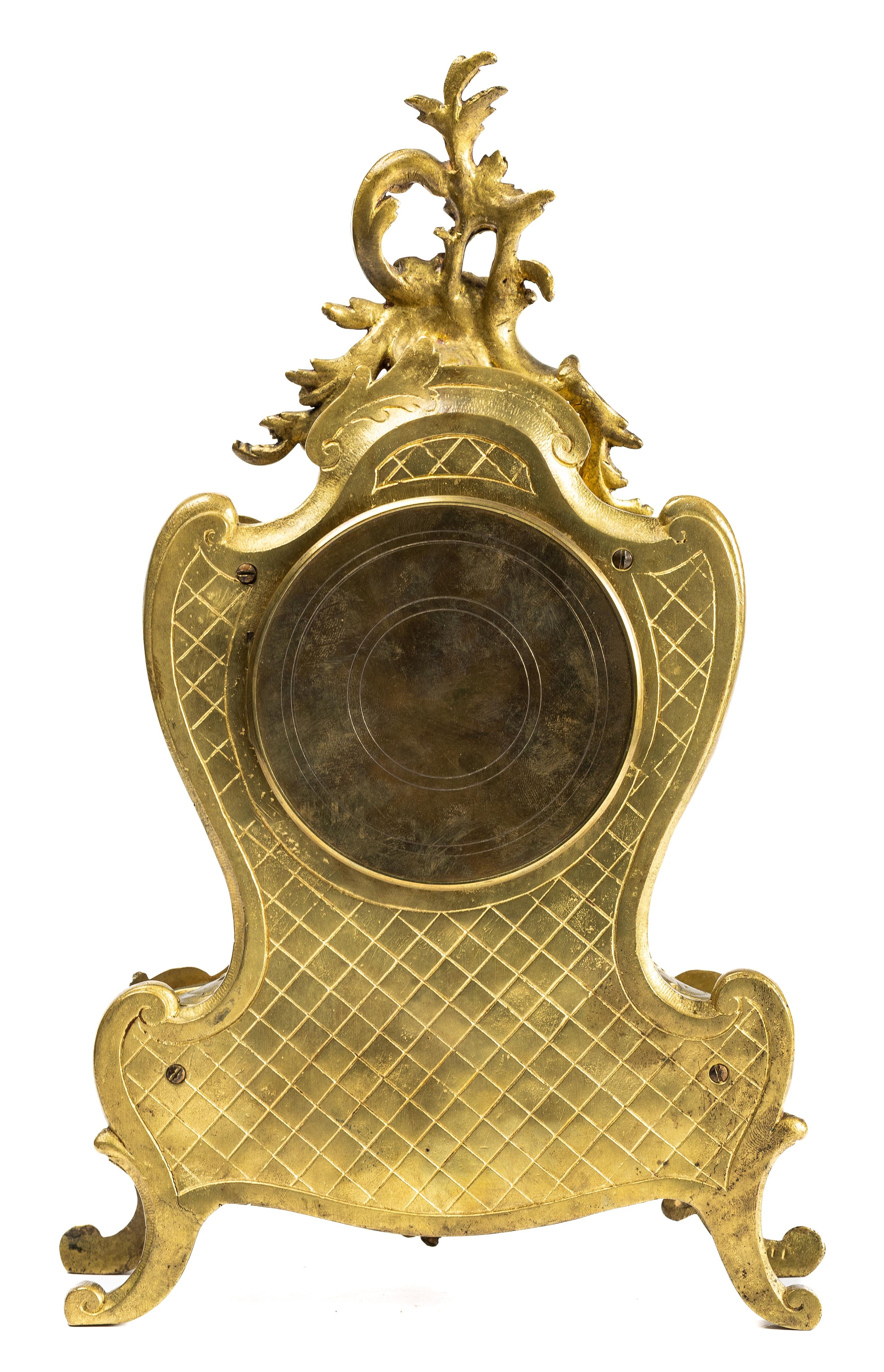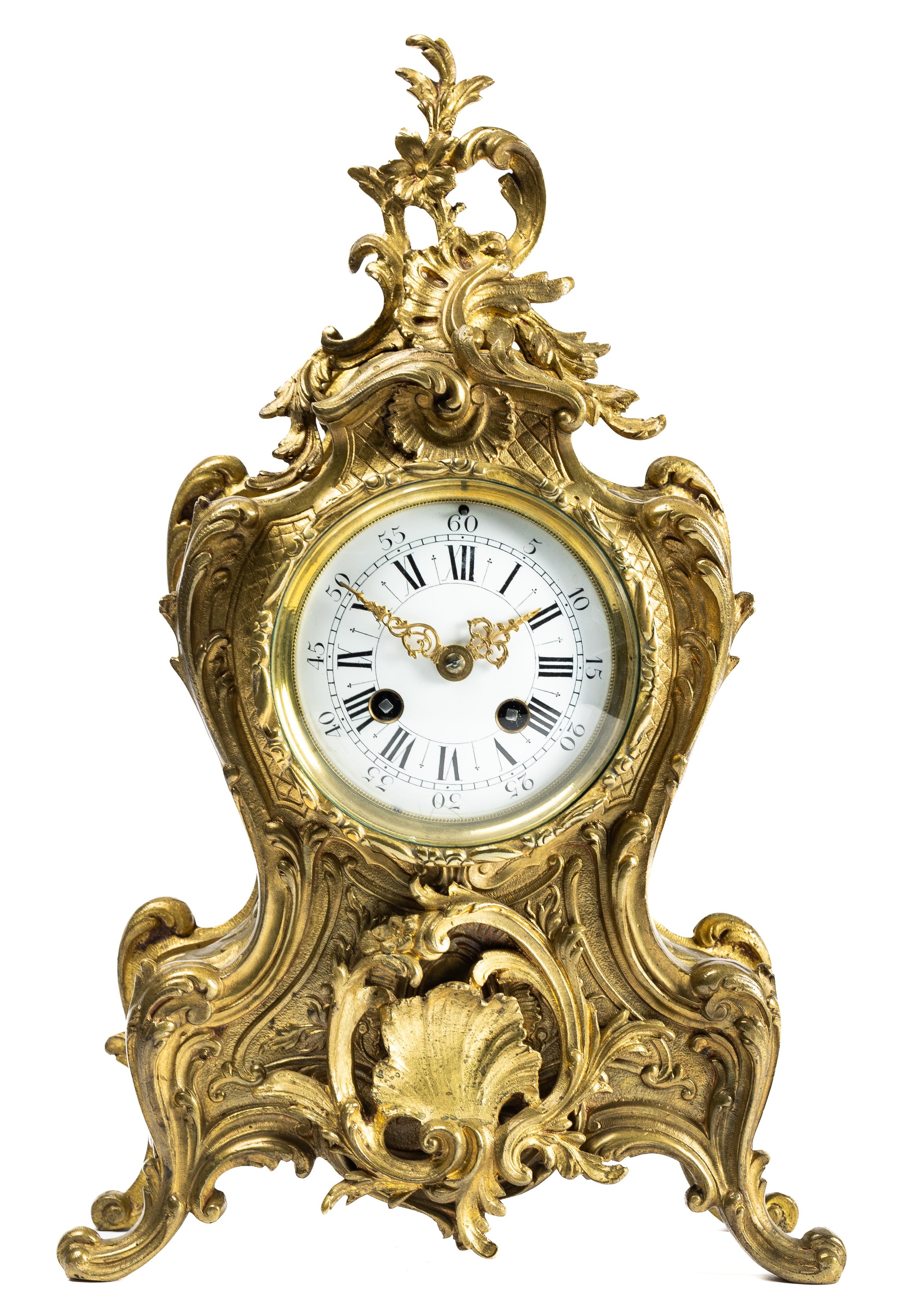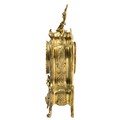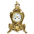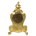 French 19th Century Louis XV style mantel clock with Rococo design. Gilt brass with foliate decoration. With key. Movement marked for RACK FRENCH MAKE 13458 4 11. Height 38cm.