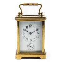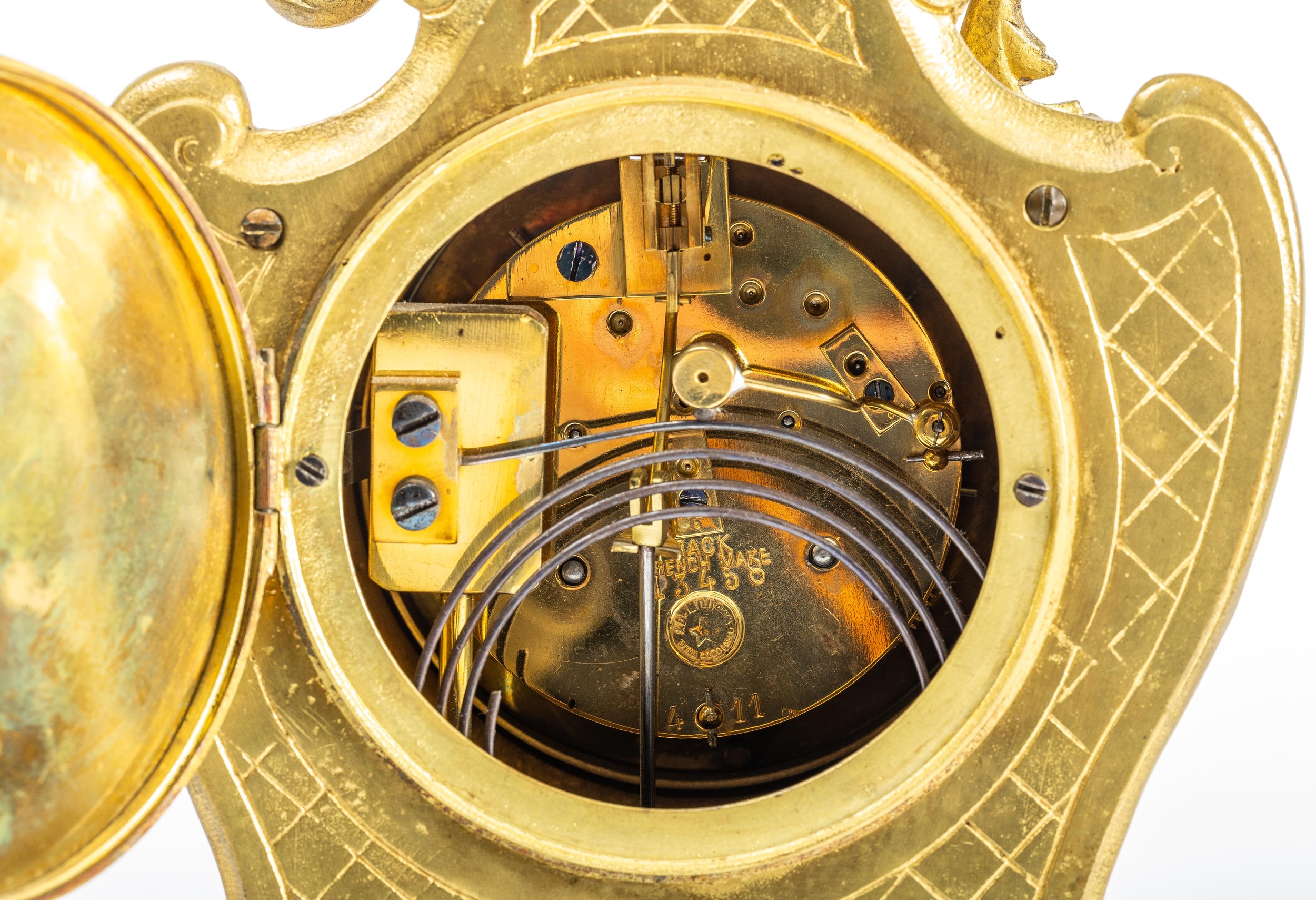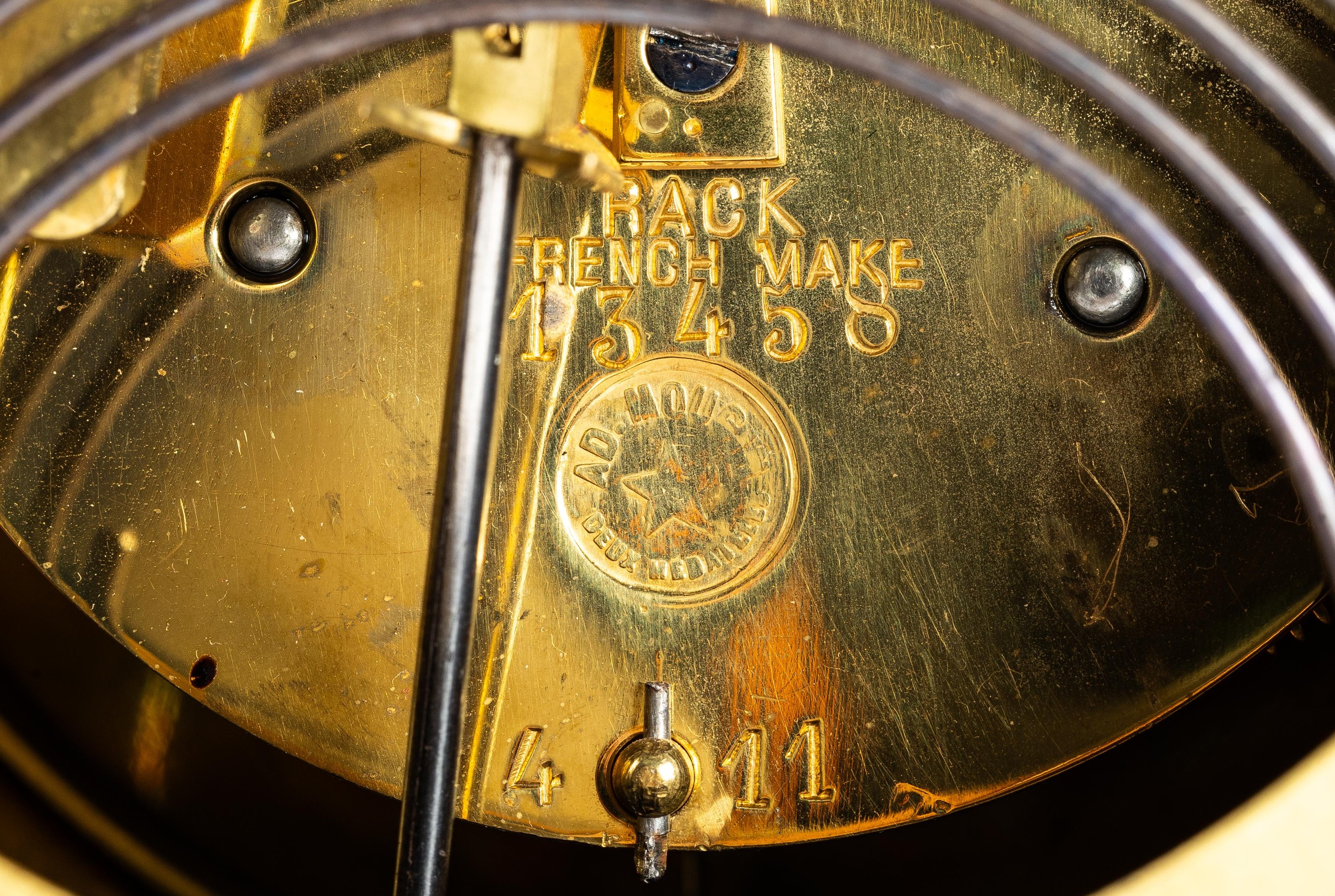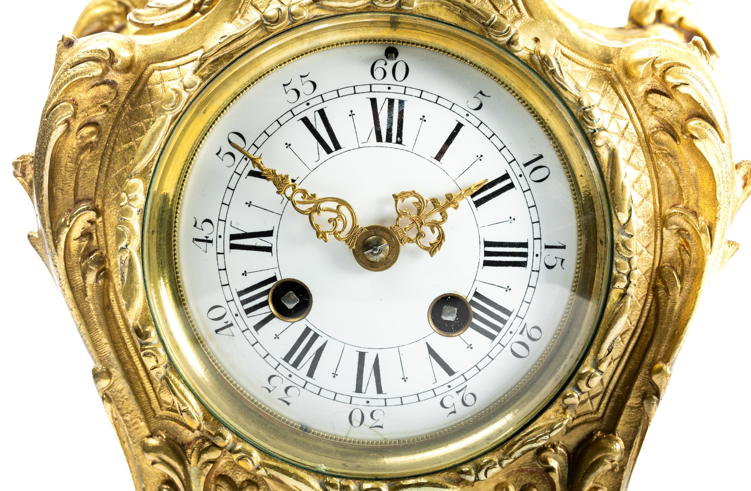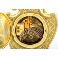 French 19th Century Louis XV style mantel clock with Rococo design. Gilt brass with foliate decoration. With key. Movement marked for RACK FRENCH MAKE 13458 4 11. Height 38cm.
