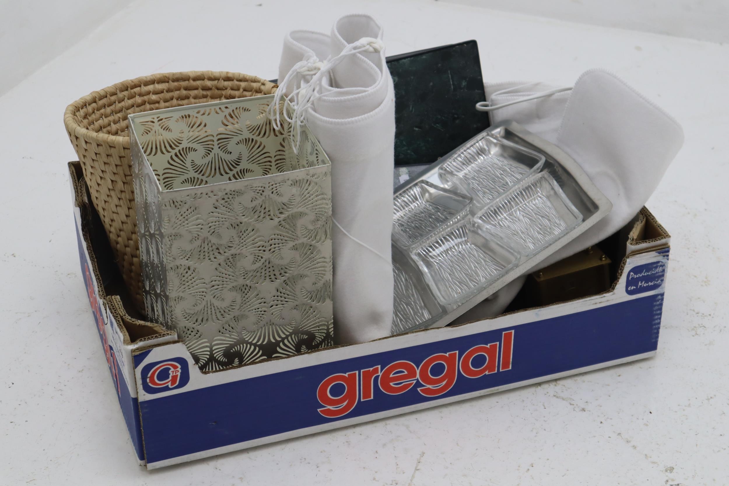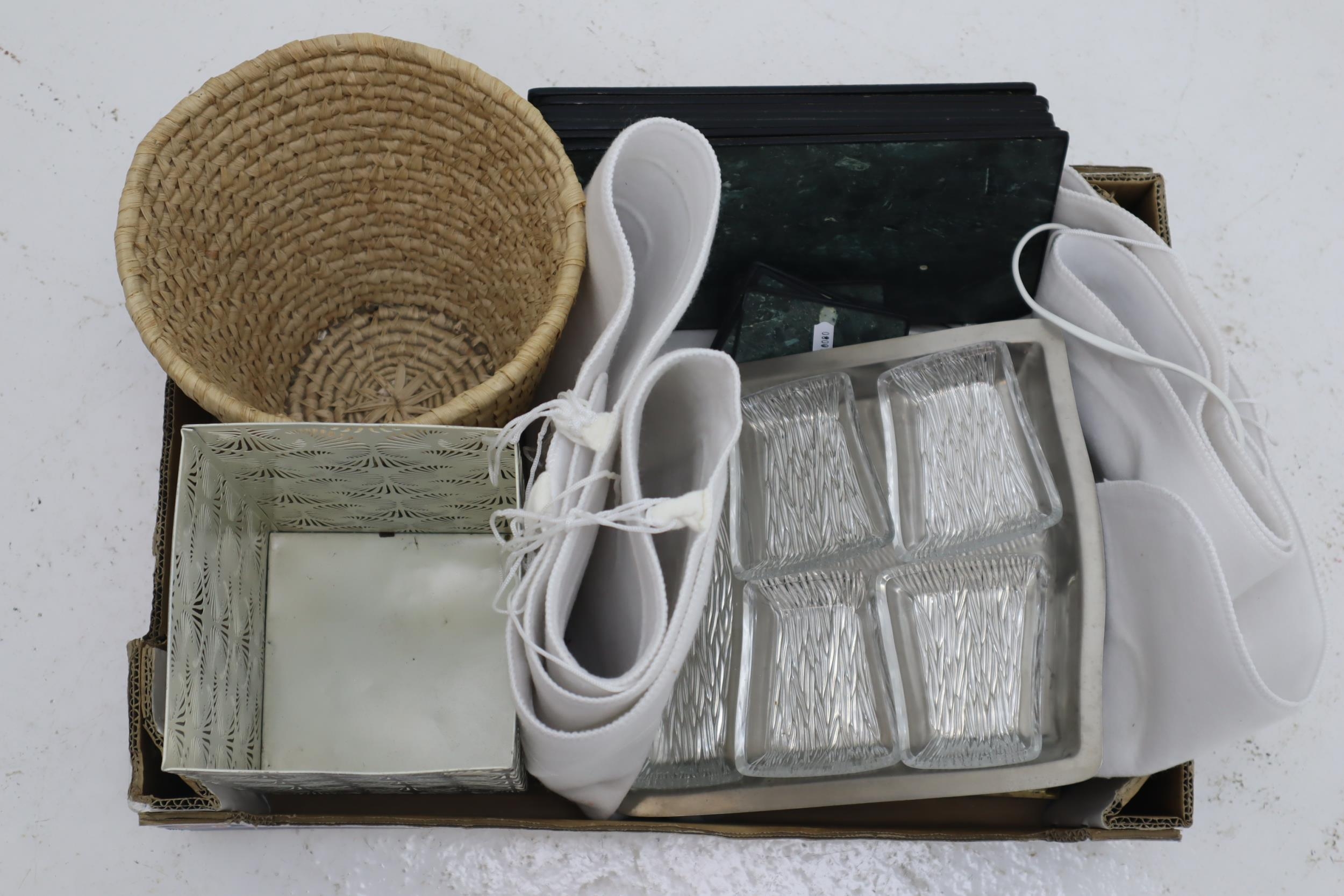 Collection of Household Items To Include Dreamland Single Electric Blanket ( Powers On When Tested ) Battery Operated Mantle Clock, Two Waste Paper Bins, Serving Platter and Cork Table mats in Slate Design
