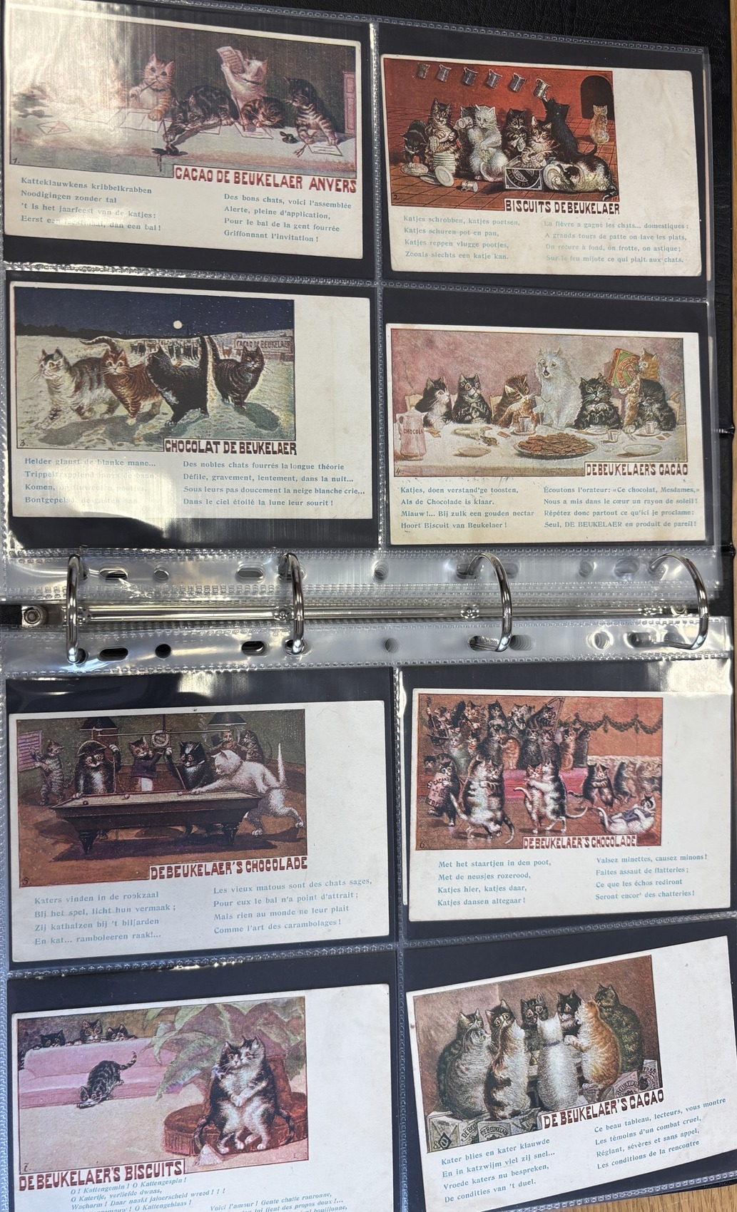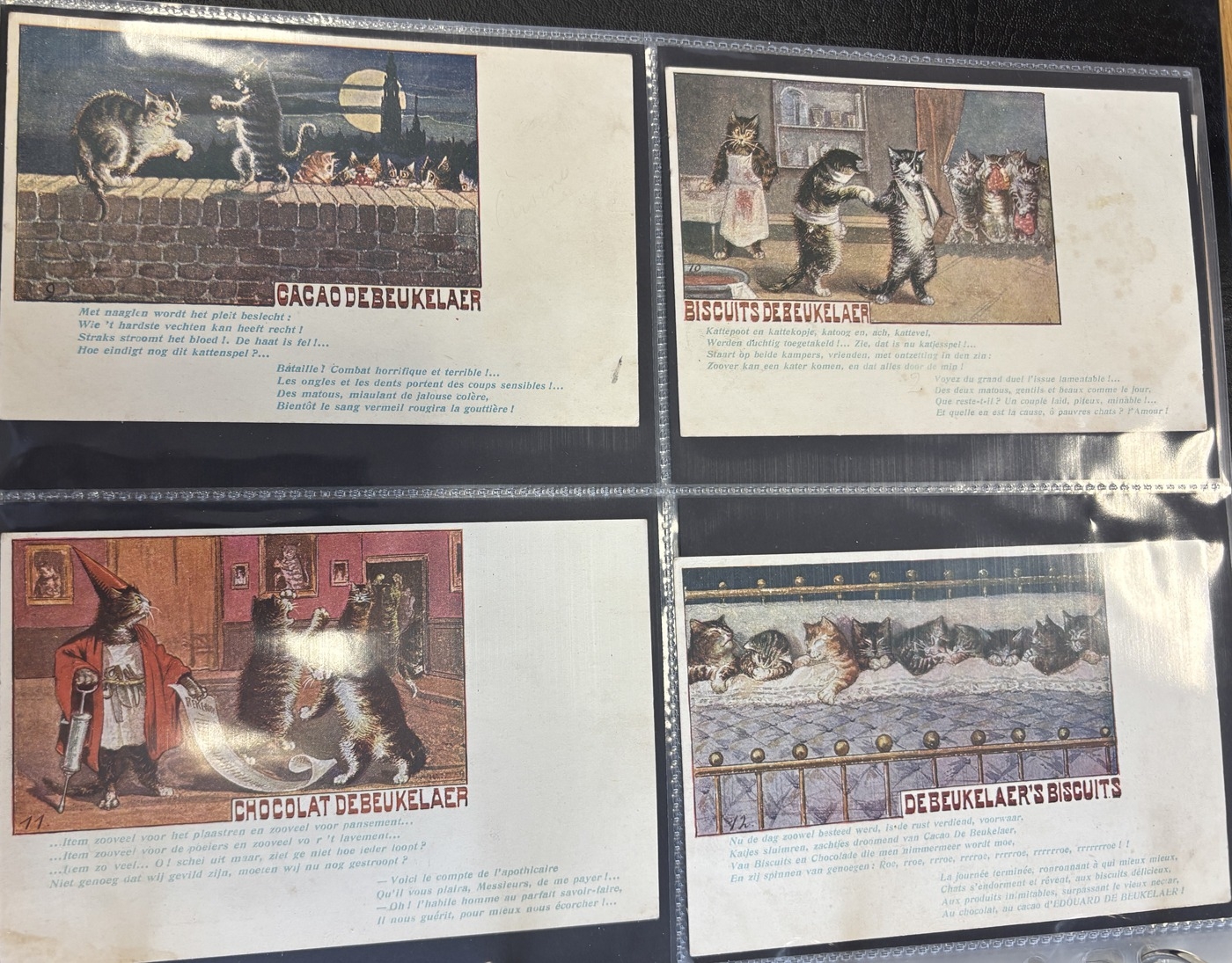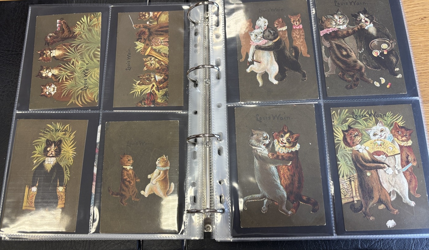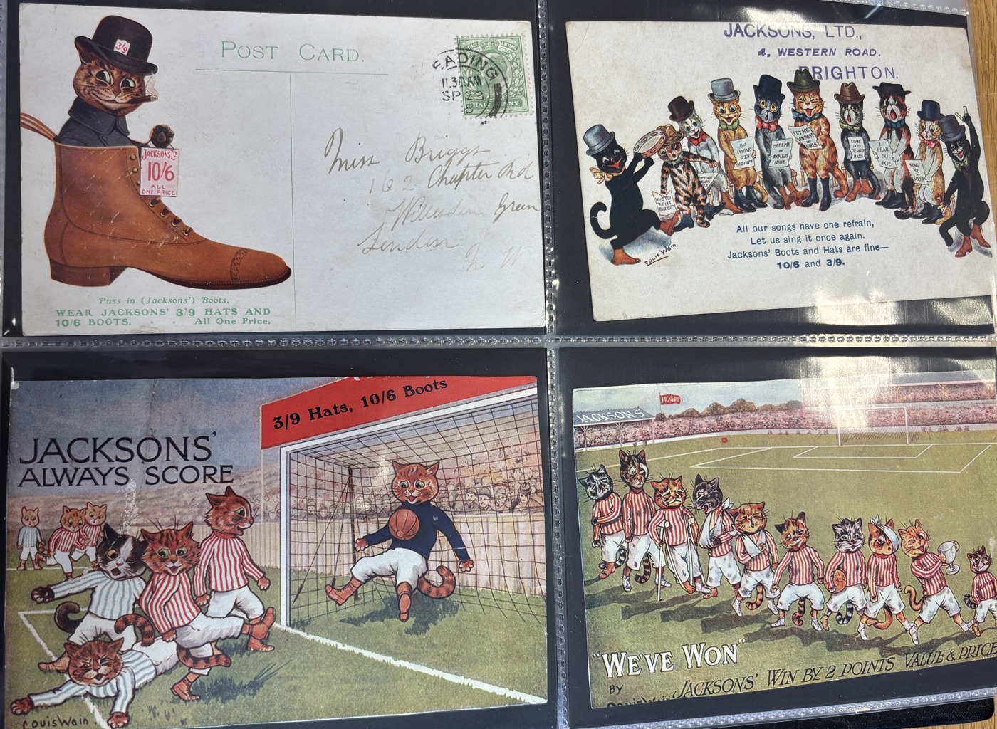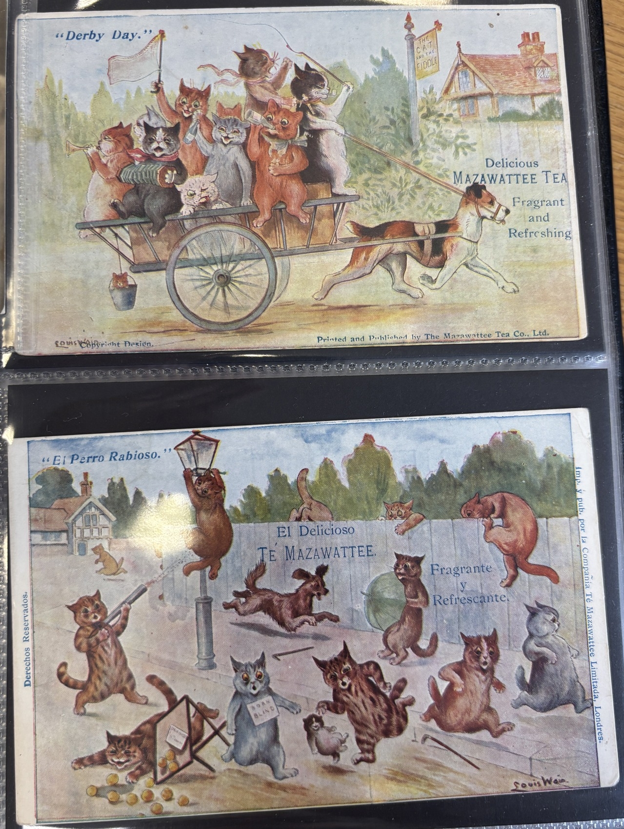 Artists. Louis Wain. Coln. in one modern album with slip case, with scrapbook pieces and ephemera incl. greetings, comic, advertisements with Jacksons cards (14), De Beukelaer set of 12 and Mazawattee Tea set of 12. Qty 164. (V)