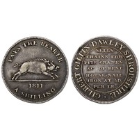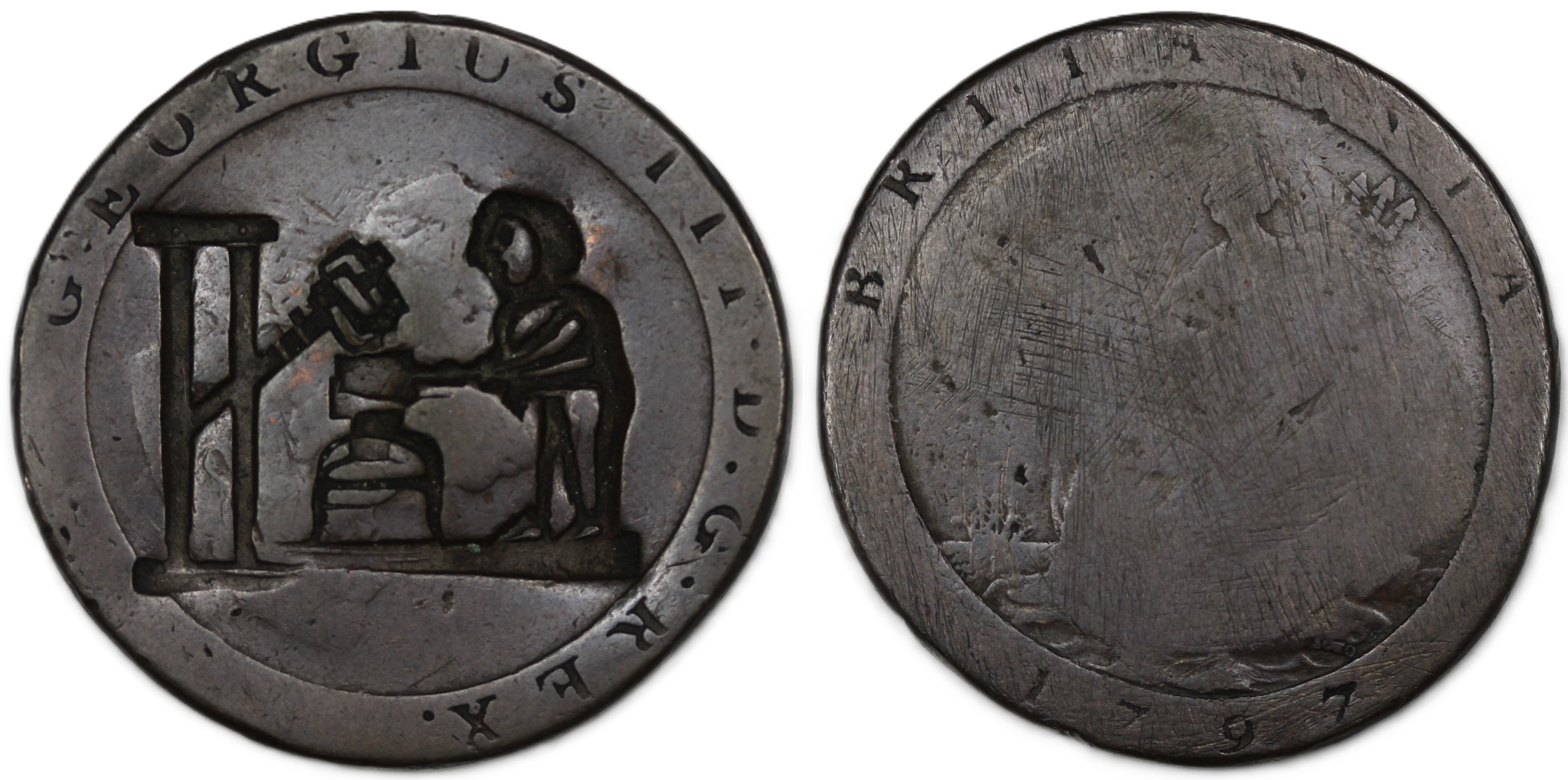 1797 engraved "Cartwheel" penny, George III. A curios piece with the obverse engraved to depict a mechanical coin striking scene, whether a mechanised hammering technique, or more likely an image of the SOHO steam presses in operation at the time. A fun piece.