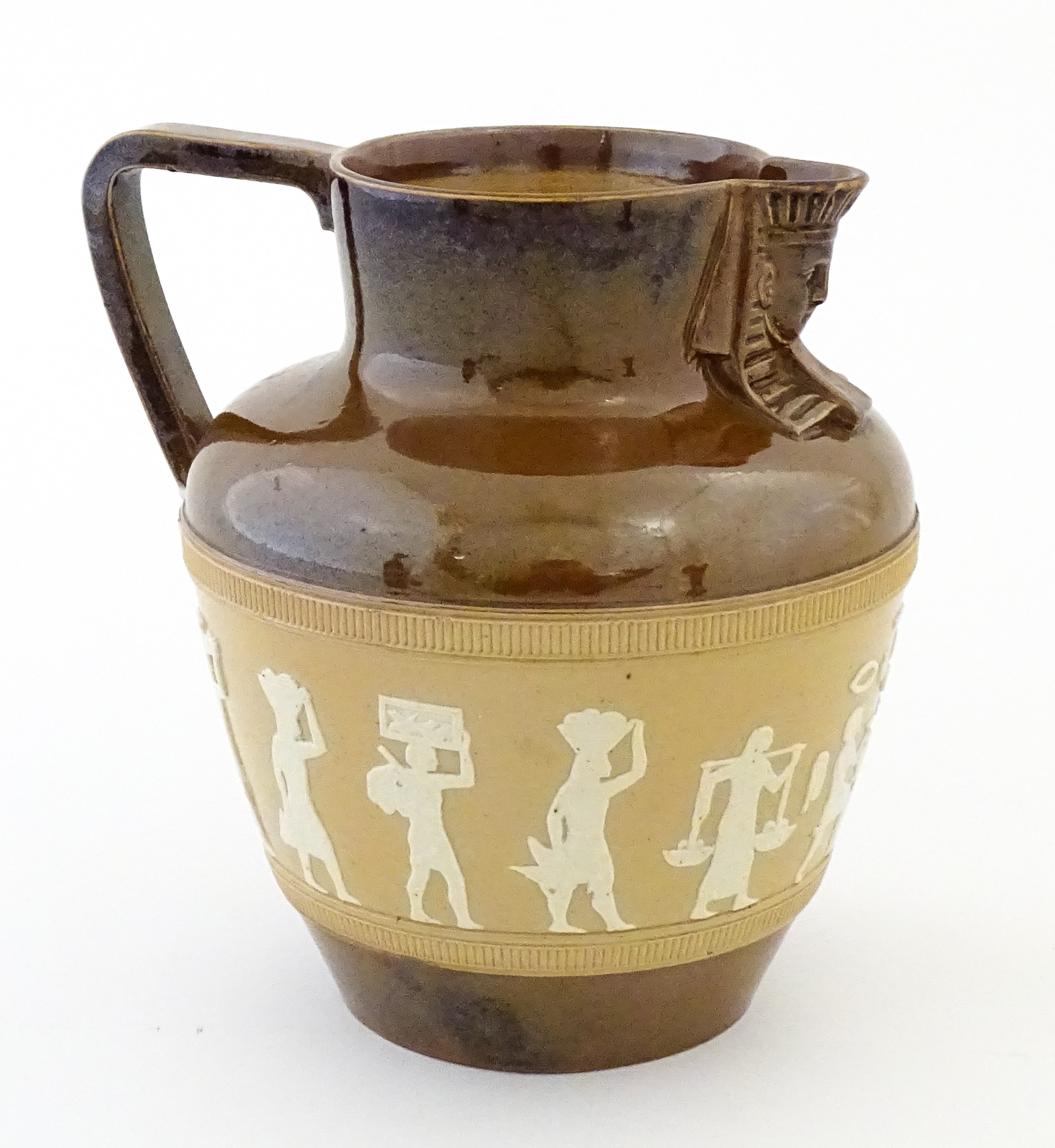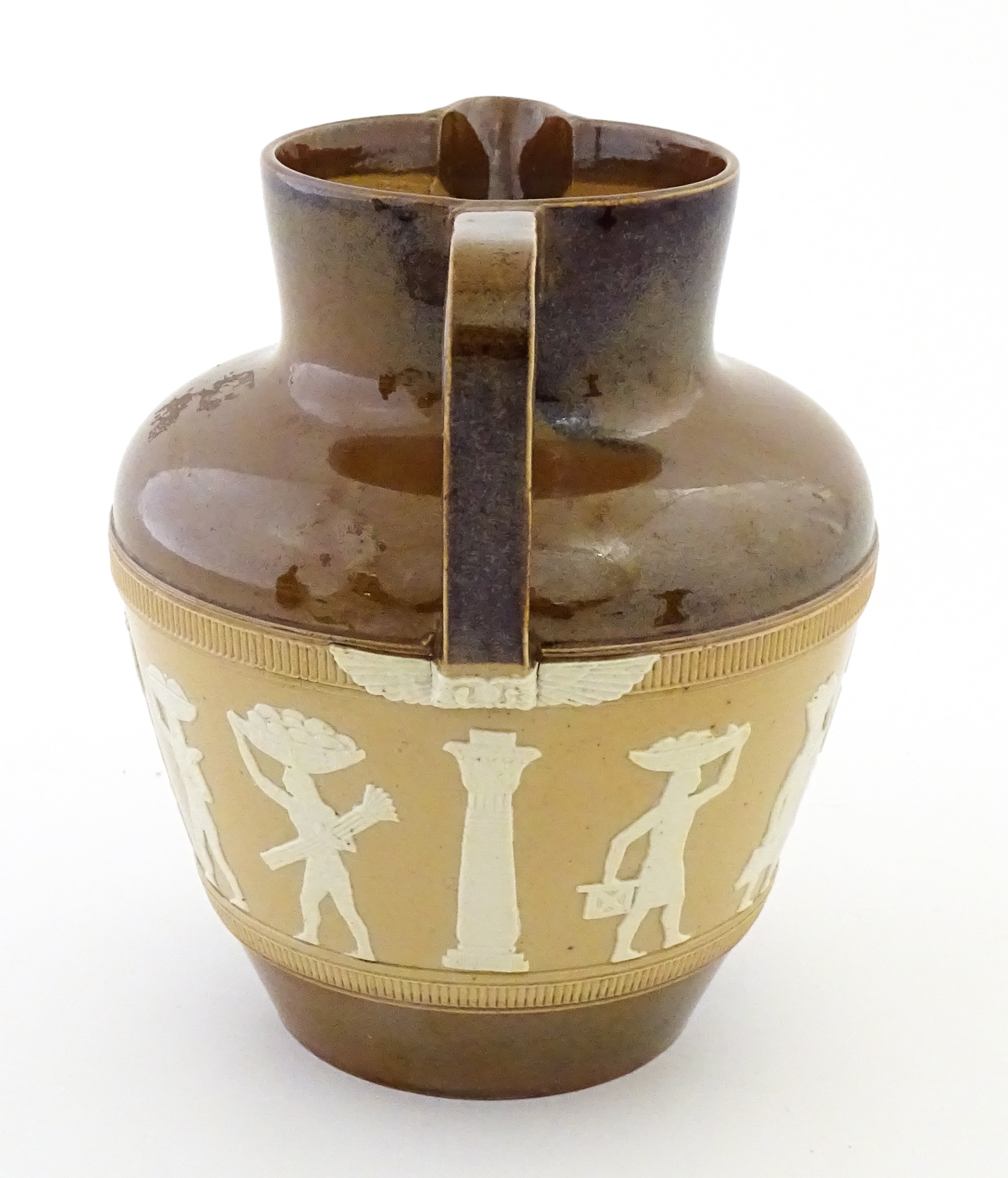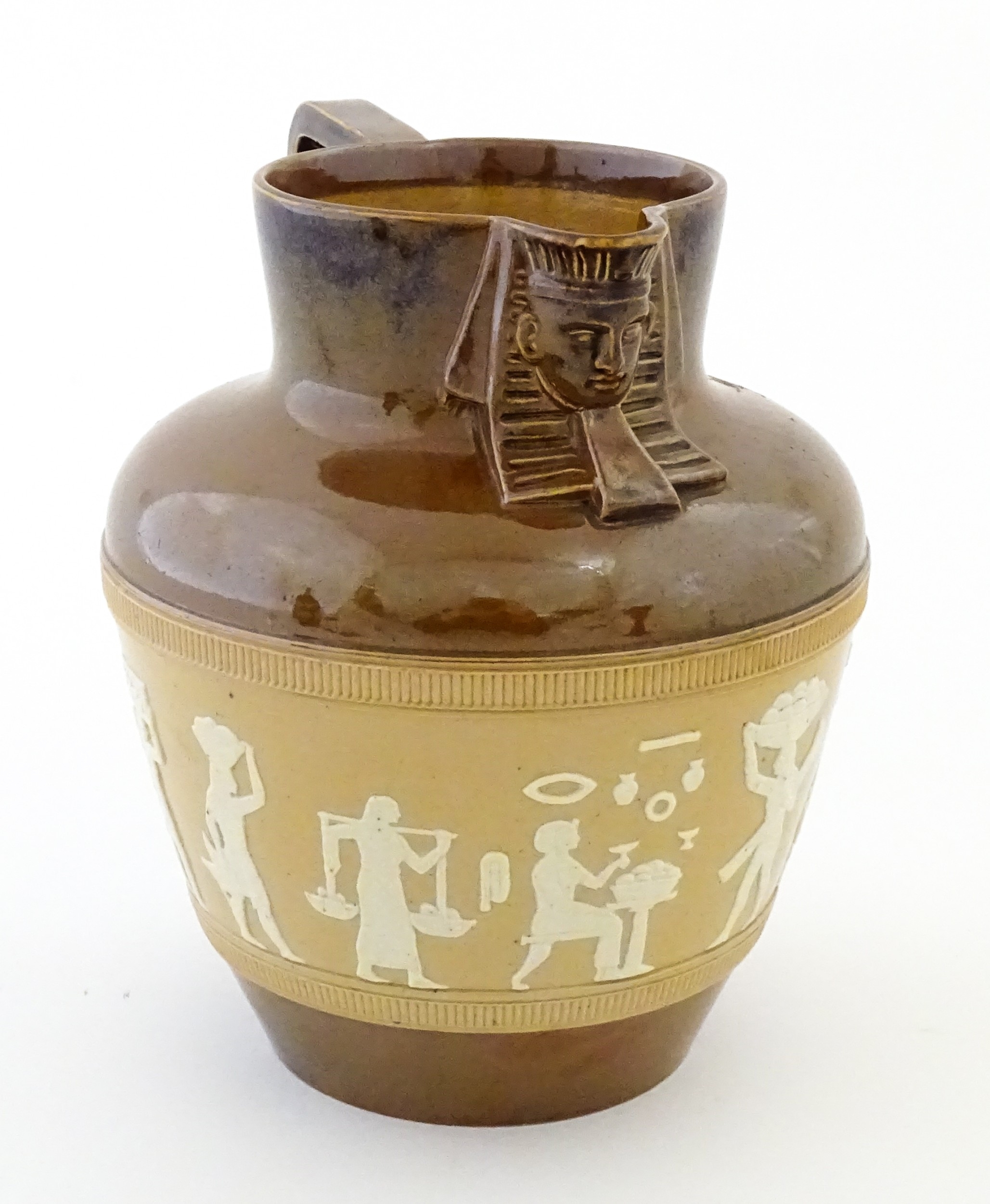 A Doulton Lambeth Egyptian Revival two tone jug. Marked under. Approx. 7 1/4" high