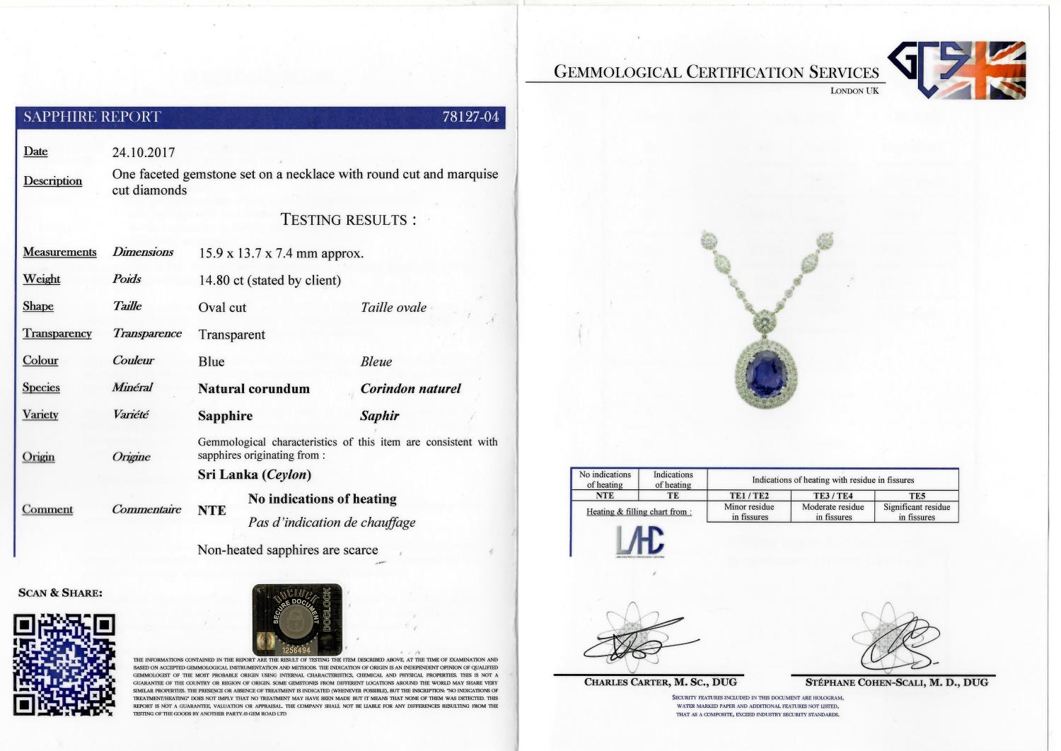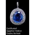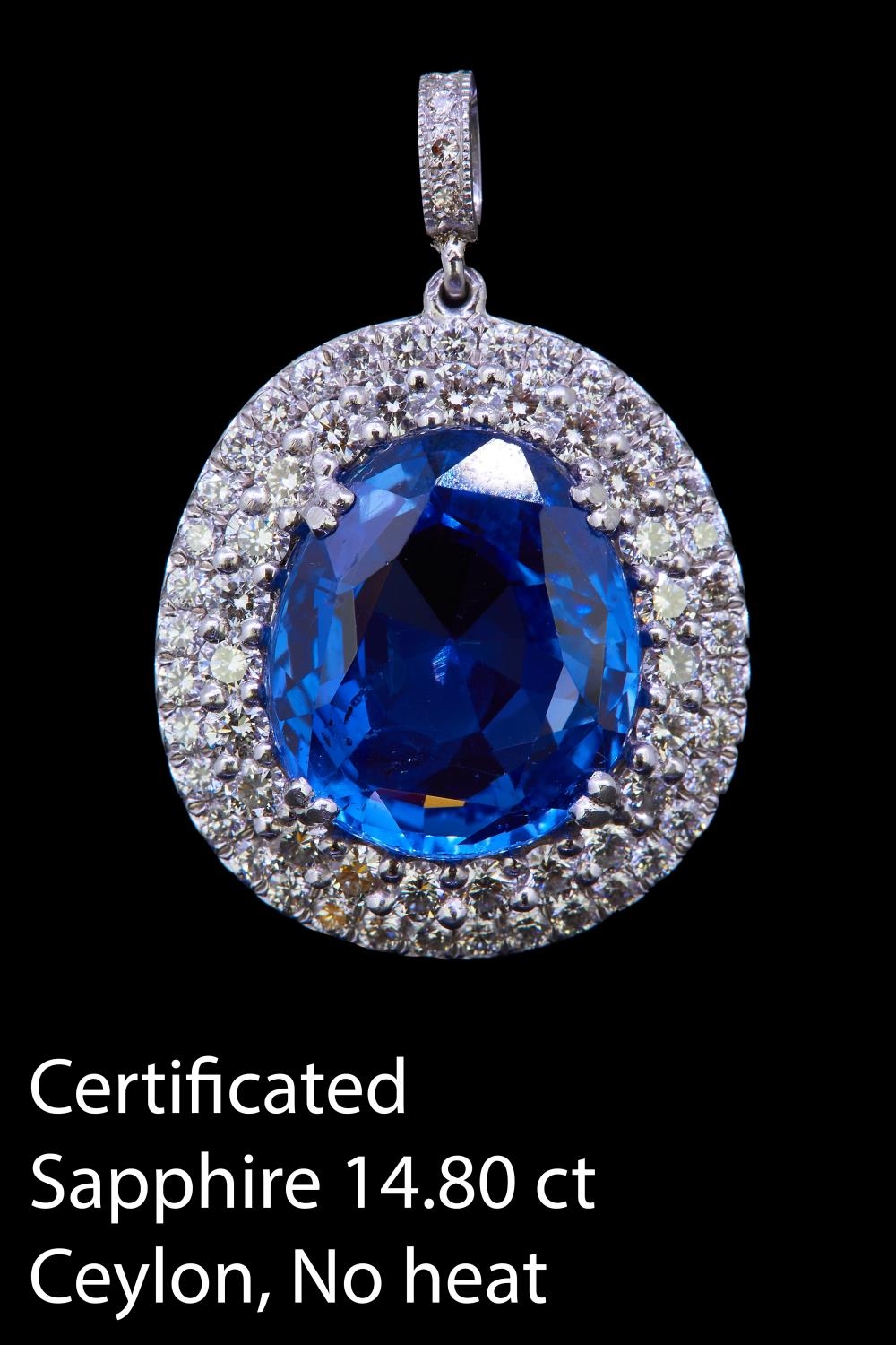 IMPORTANT 14.80 CTL CEYLON NO HEAT BLUE SAPPHIRE AND DIAMOND PENDANT, set to the center with a 14.80 ct. Ceylon no heat blue sapphire, surrounded by diamonds totalling approx. 2.20 ct. L. 3.2 cm. 9.9 grams. With a fitted box. Accompanied by GCS London report No. 78127-04 stating that the blue sapphire is Natural, Ceylon origin, with no indications of heating.