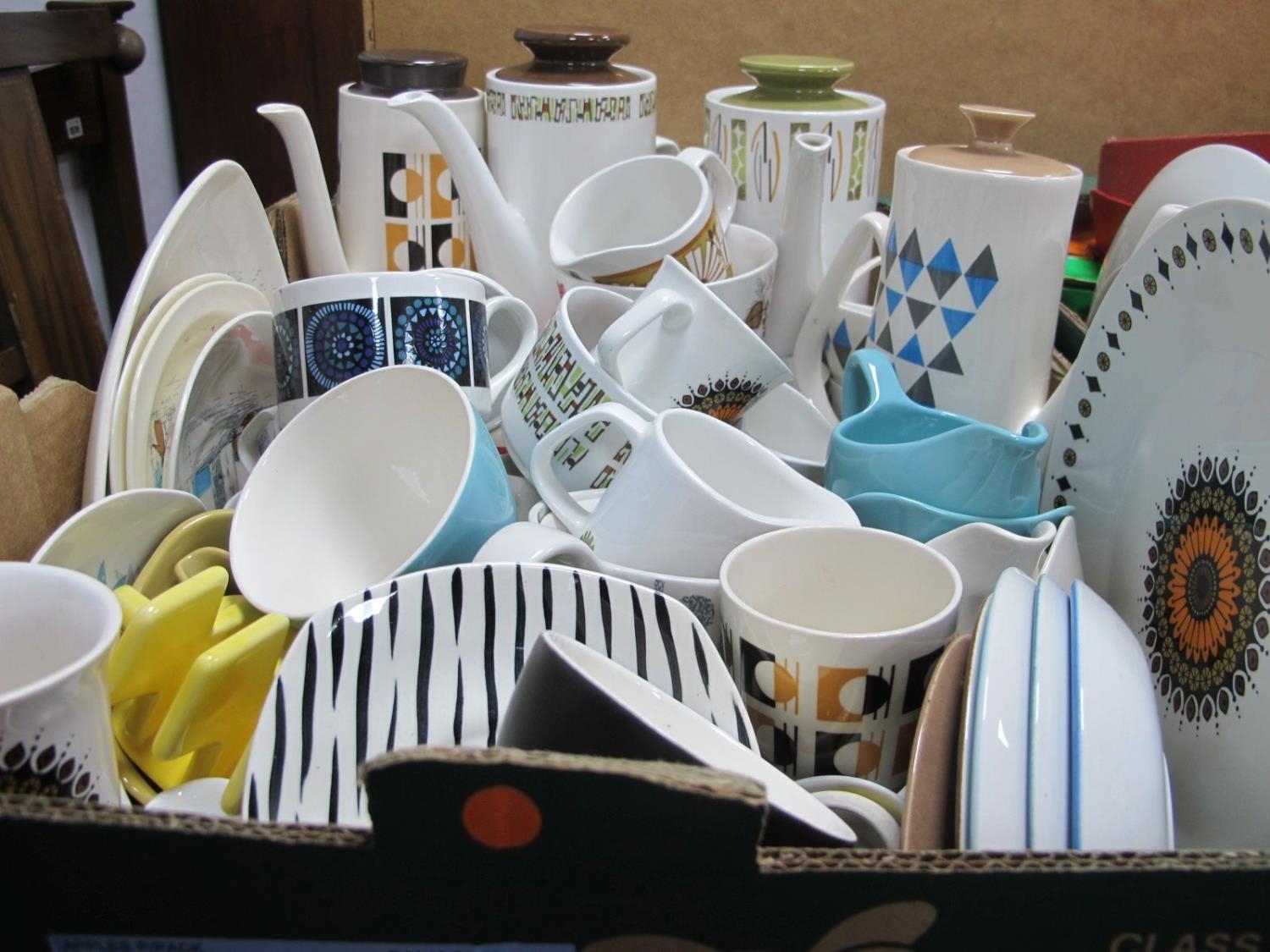 Midwinter Stylecraft Cup-Saucer. J & G Meakin 'Studio' vintage coffee pots. Staffordshire Checkmate coffee pot, cream jug, sugar bowl, et:- One Box.