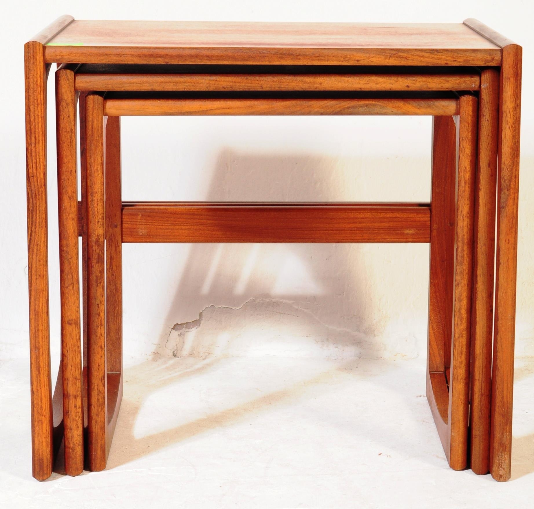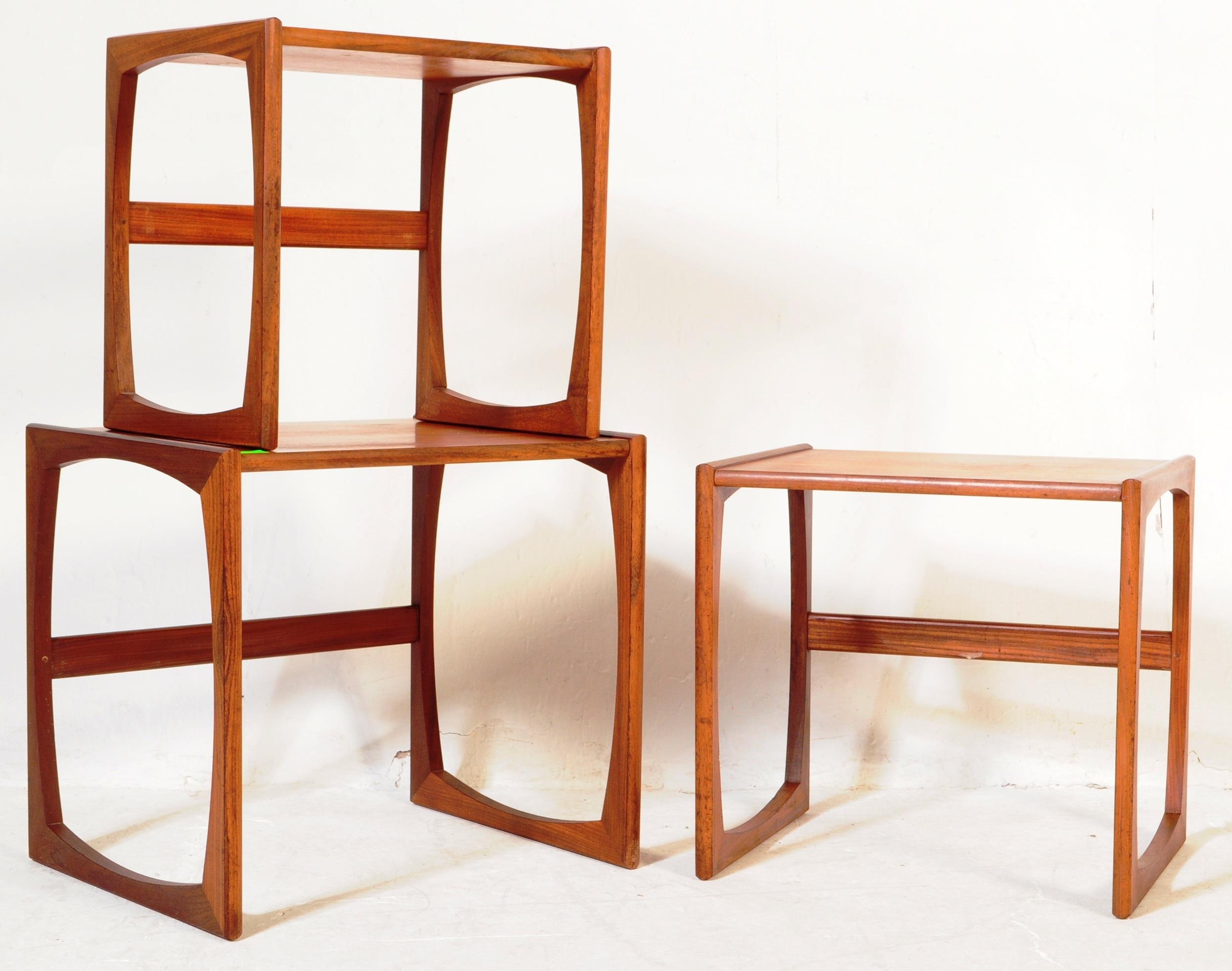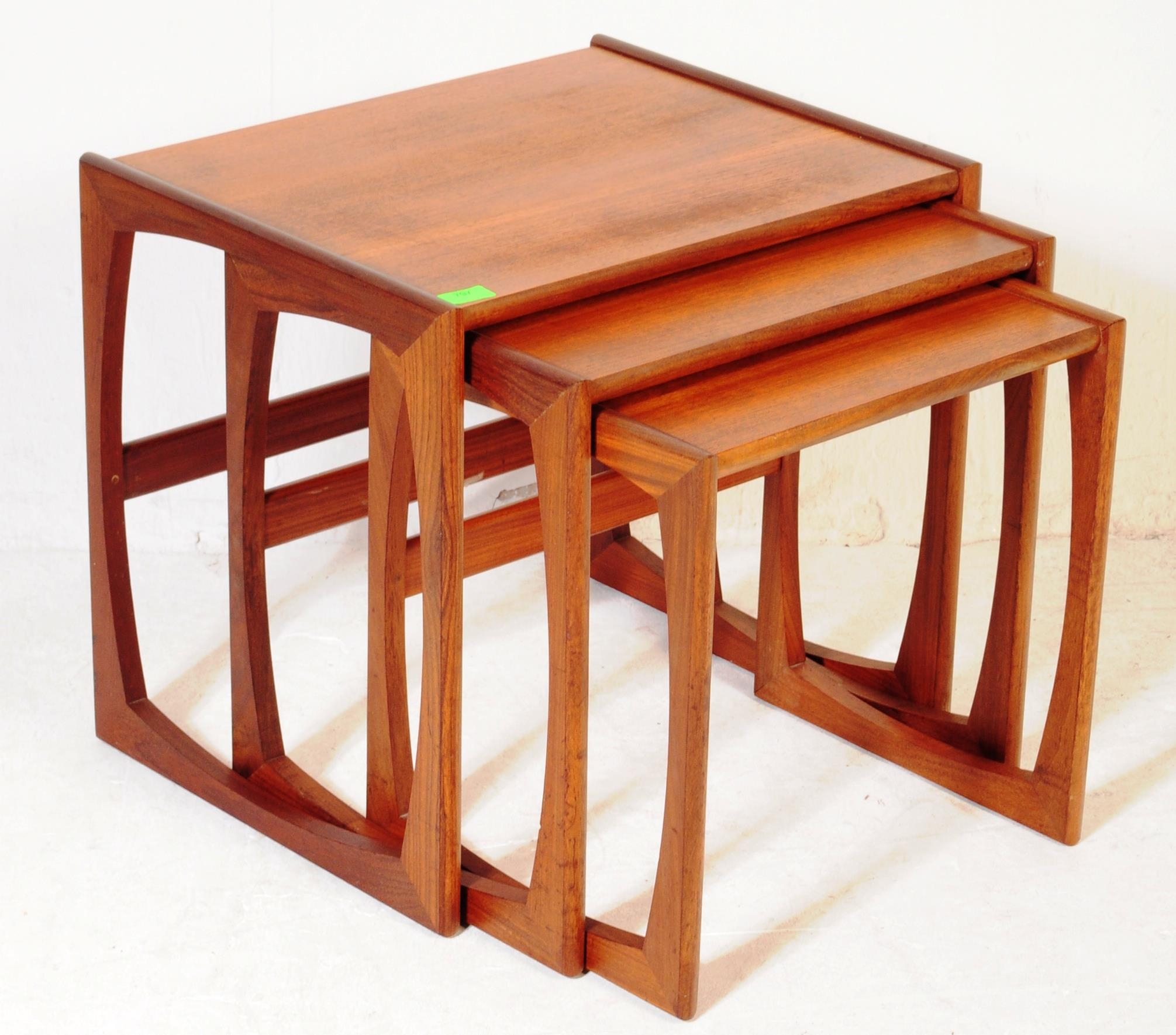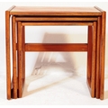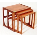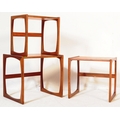 R Bennett for G-Plan Furniture - A 1970's retro vintage teak wood graduating nest of tables by R Bennett - G Plan - Quadrille pattern. The three nesting coffee tables having angular legs united by reverse stretchers with graduating table tops above.