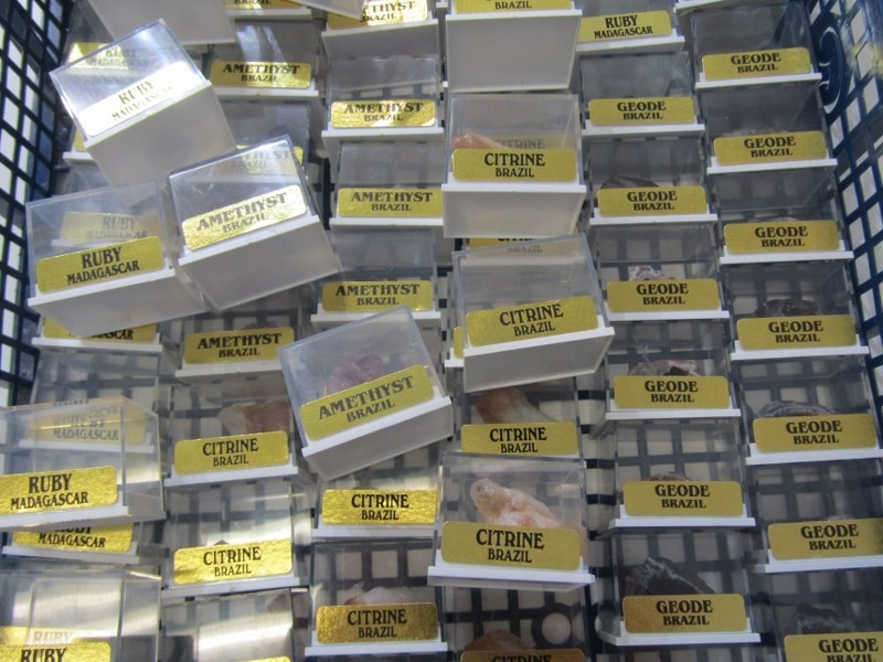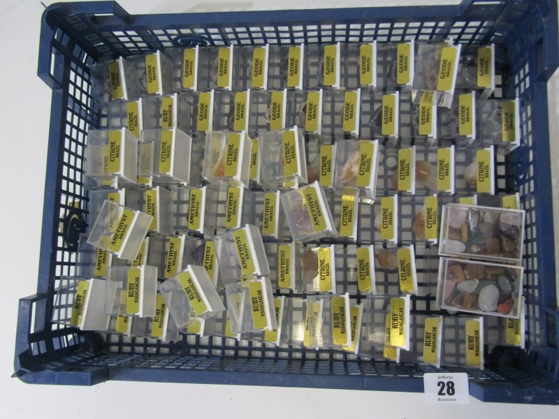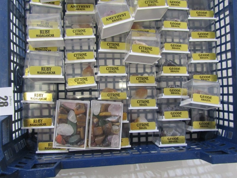 MINERAL SPECIMENS, crate containing specimens of ruby from Madagascar, citrine from Brazil, geodes from Brazil, etc