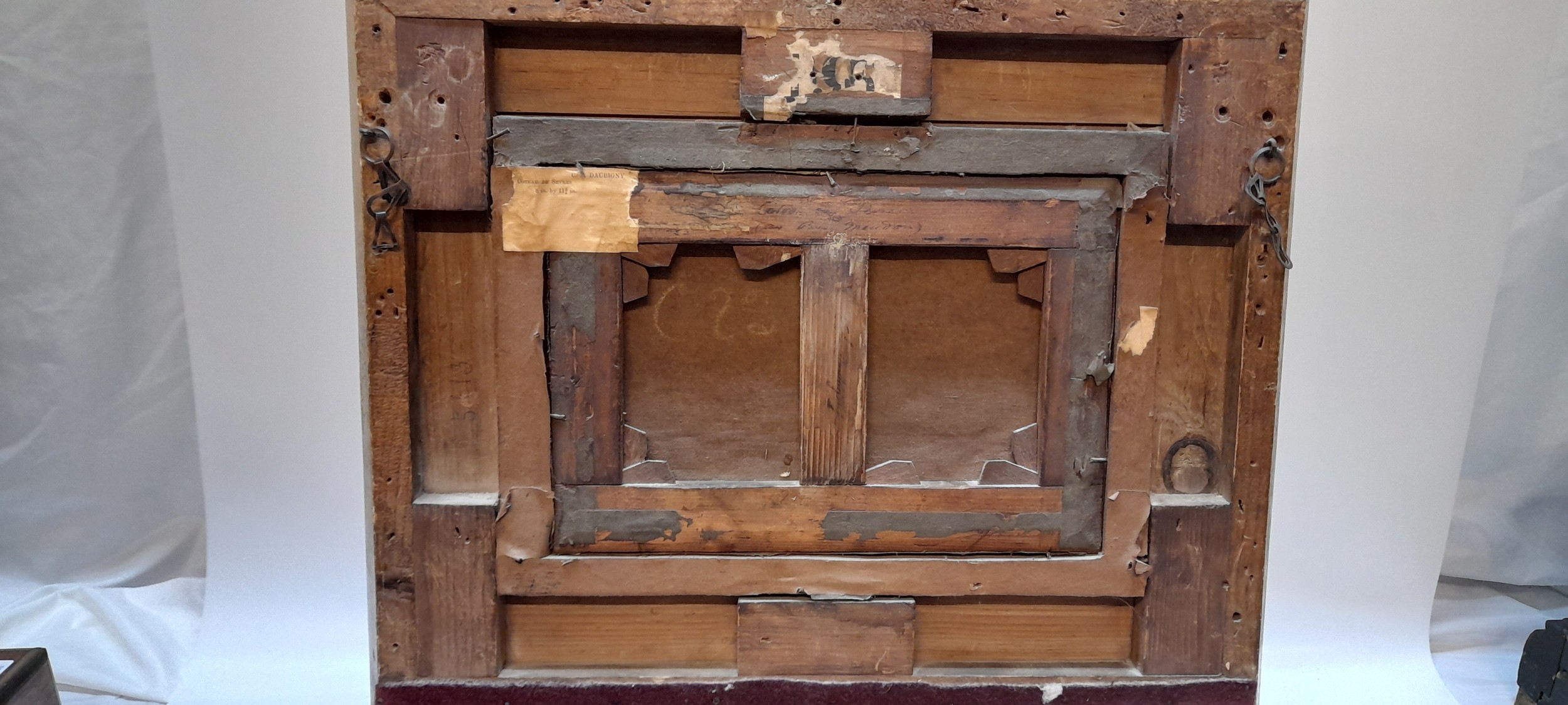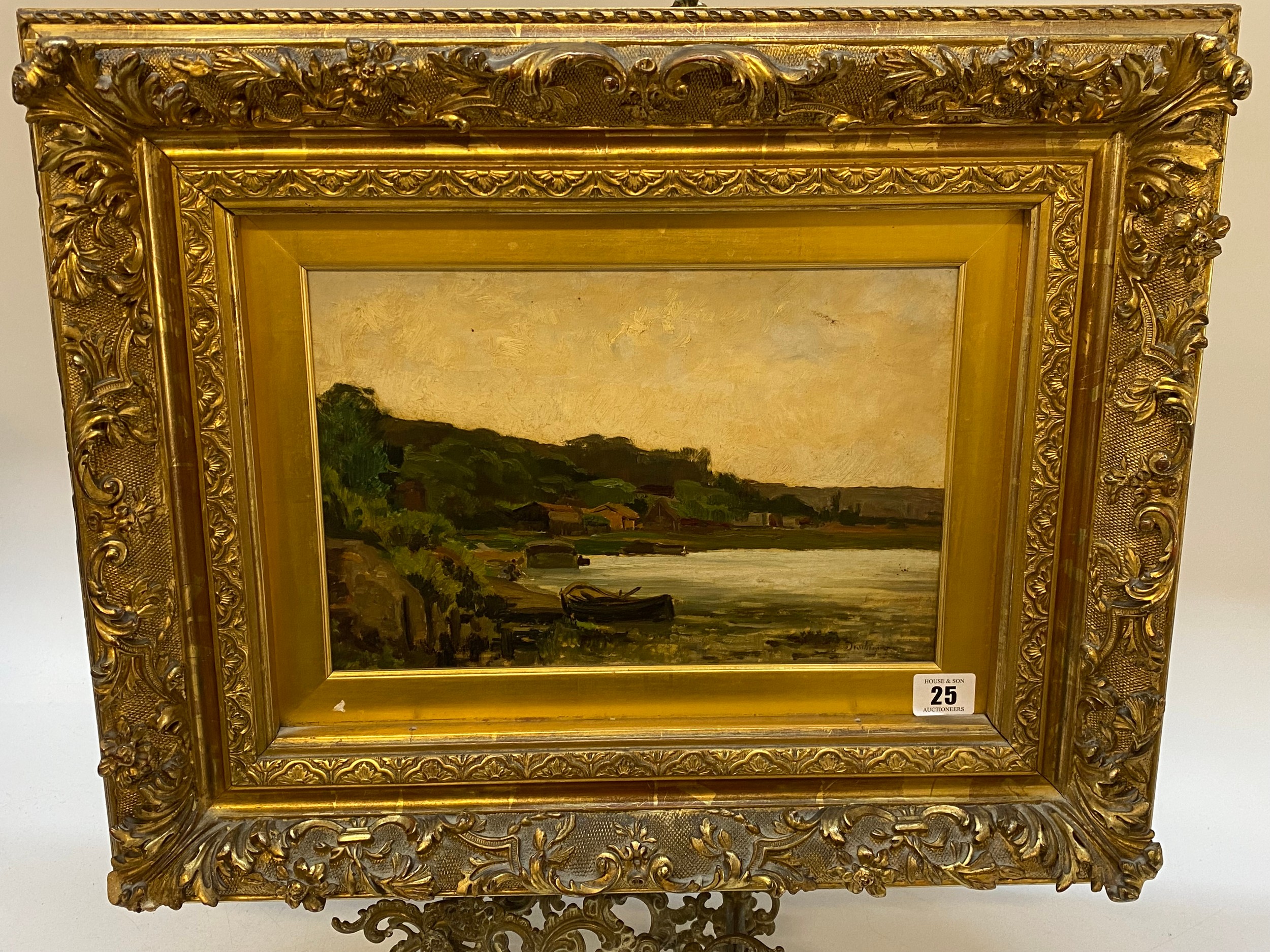 C.F Daubigny. A 19th Century signed oil on canvas - Coastal scene with boat in the foreground titled to the reverse 'Coteau De Sevres' in a decorative gilt frame - 8in. x 11 3/4in.