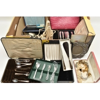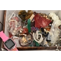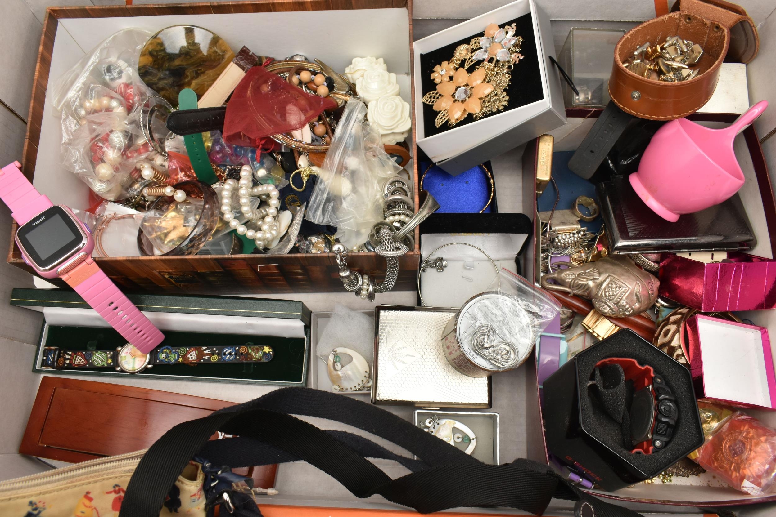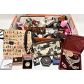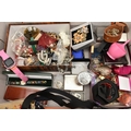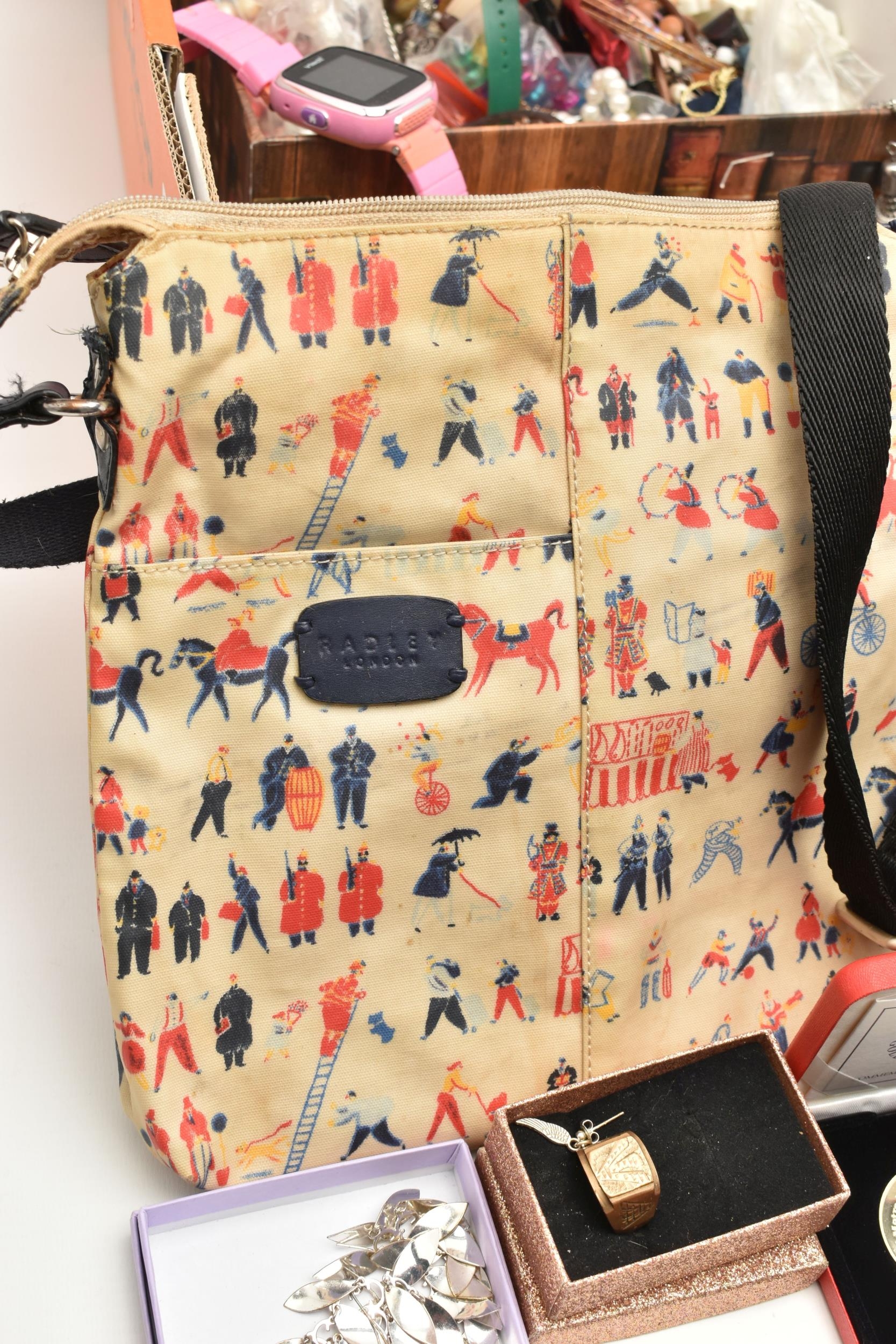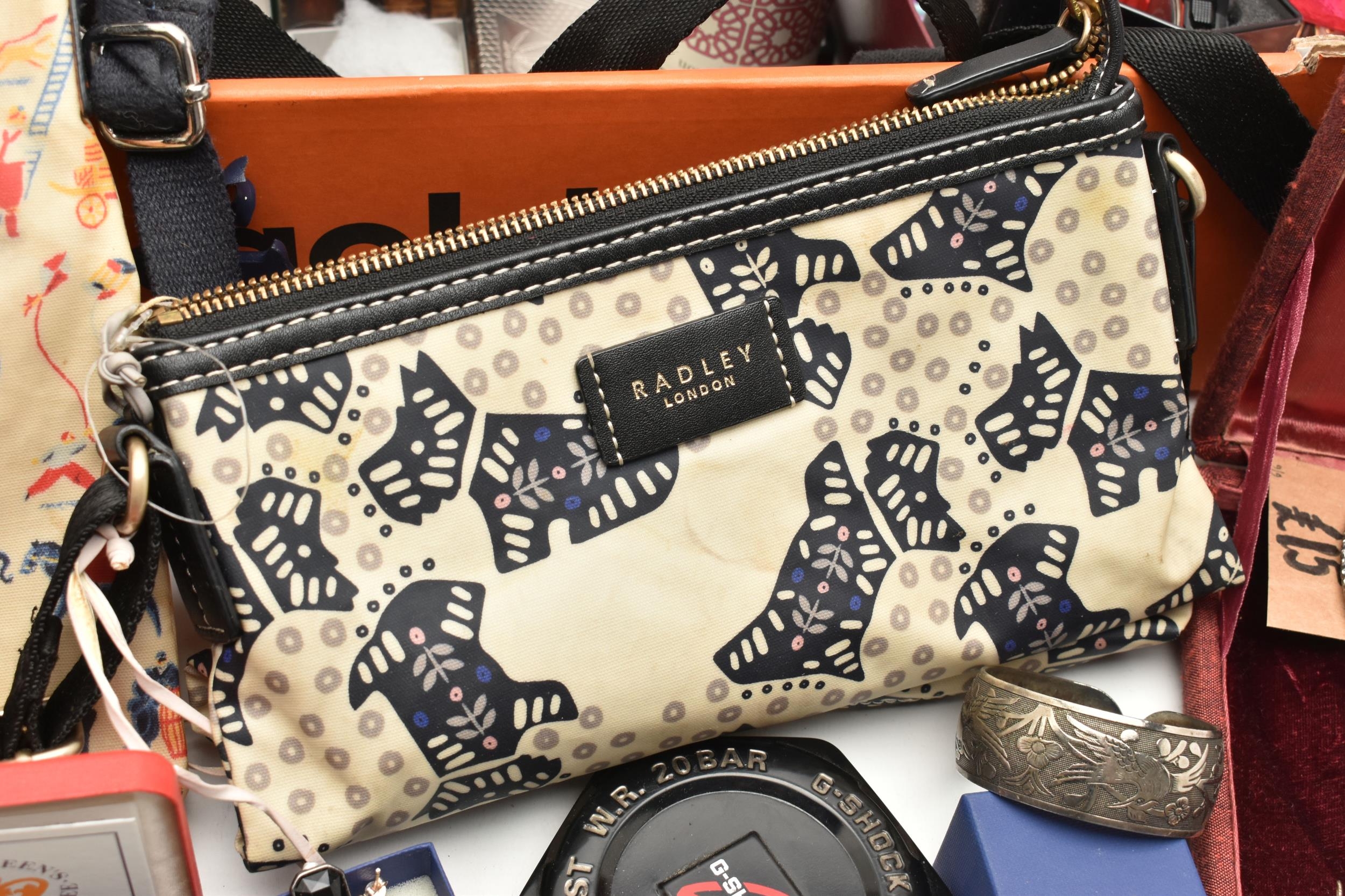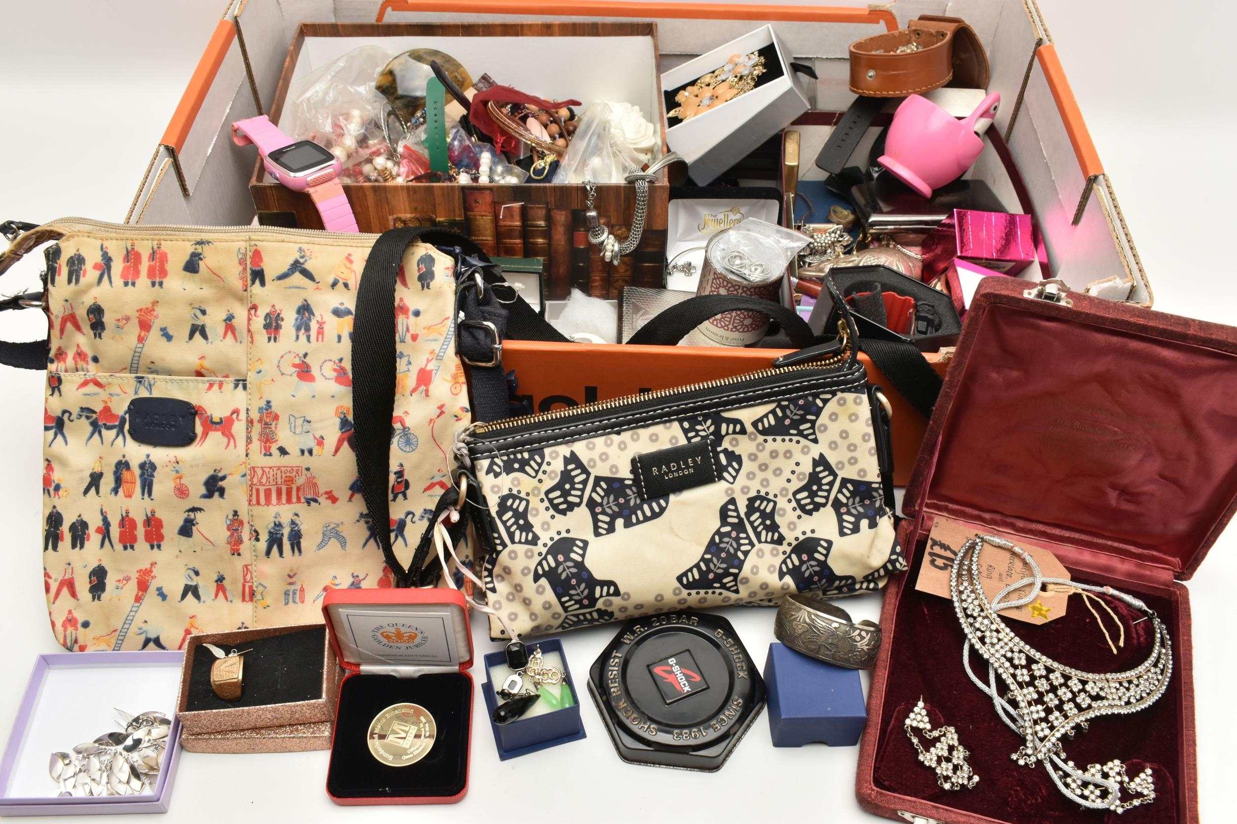 A BOX OF ASSORTED ITEMS, to include a selection of costume jewellery and fashion watches, two fabric Radley bags and other assorted items